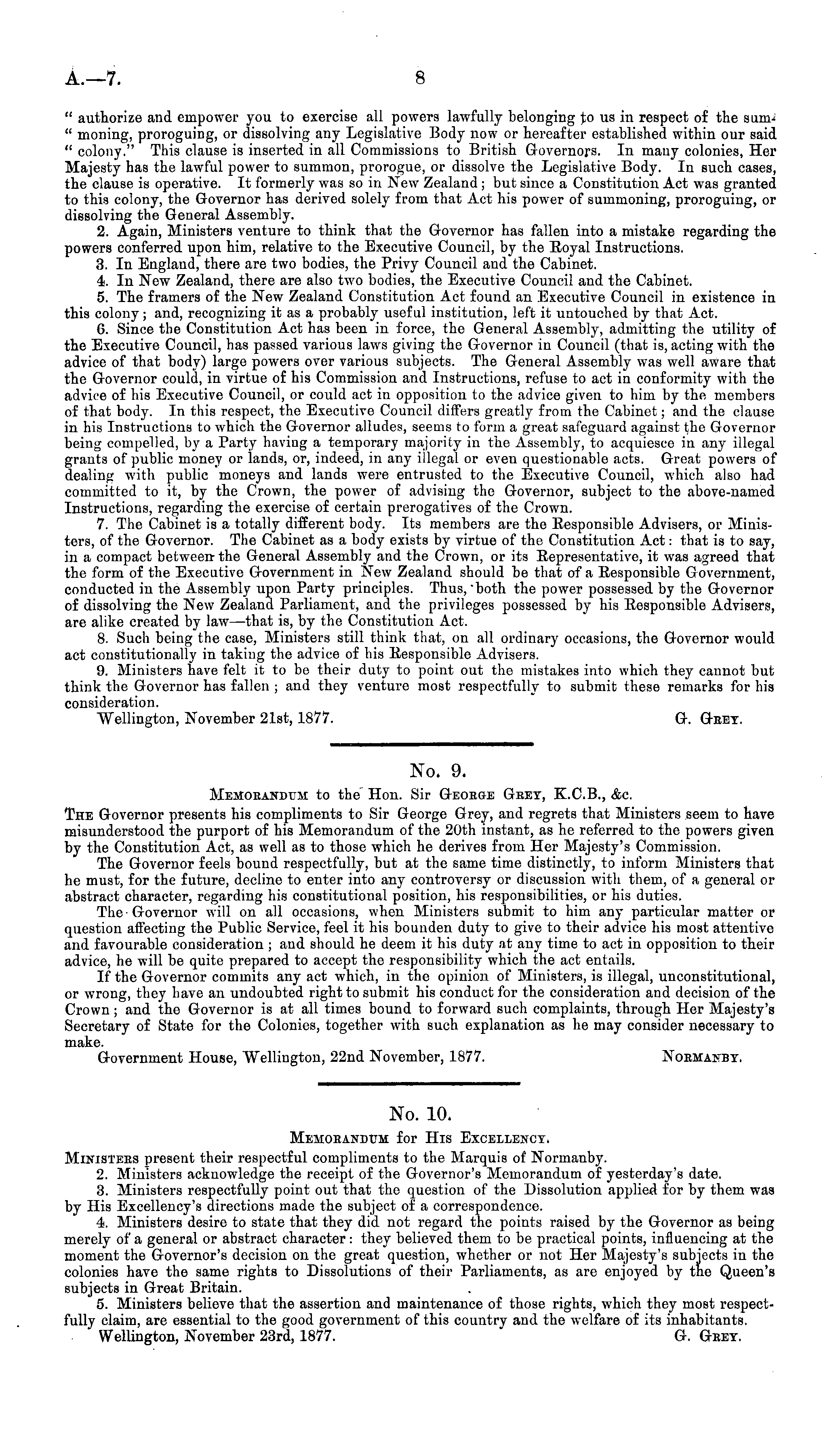 No. 10. Memoeandum for His Excellency. Ministees present their respectful compliments to the Marquis of Normanby. 2. Ministers acknowledge the receipt of the Governor's Memorandum of yesterday's date. 3. Ministers respectfully point out that the question of the Dissolution applied for by them was by His Excellency's directions made the subject of a correspondence. 4. Ministers desire to state that they did not regard the points raised by the Governor as being merely of a general or abstract character: they believed them to be practical points, influencing at the moment the Governor's decision on the great question, whether or not Her Majesty's subjects in the colonies have the same rights to Dissolutions of their Parliaments, as are enjoyed by the Queen's subjects in Great Britain. 5. Ministers believe that the assertion and maintenance of those rights, which they most respectfully claim, are essential to the good government of this country and the welfare of its inhabitants. Wellington, November 23rd, 1877. G. Gbey.