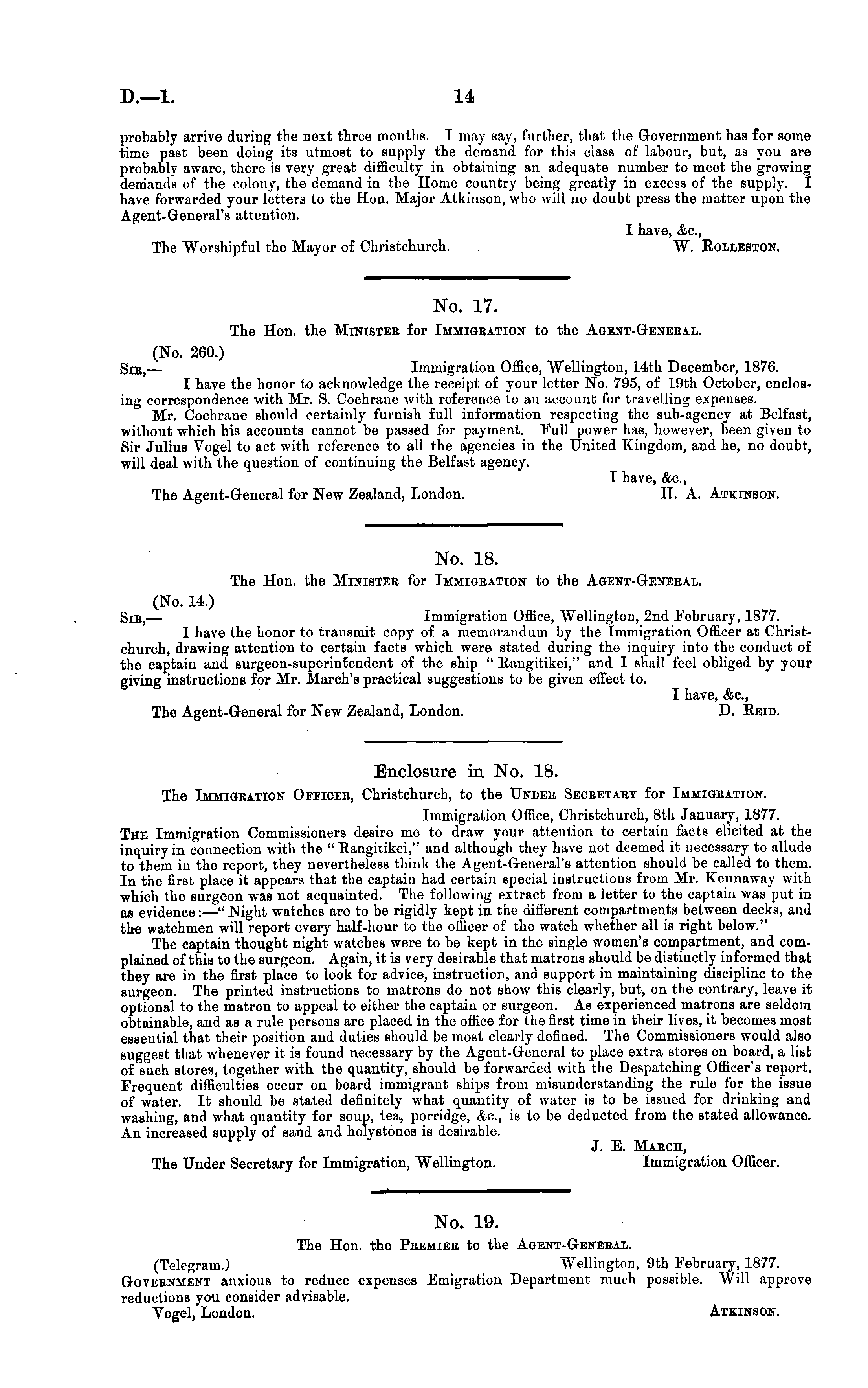 No. 19. The Hon. the Premier to the Agent-General. (Telegram.) "Wellington, 9th February, 1877. Government anxious to reduce expenses Emigration Department much possible. Will approve reductions you consider advisable. Vogel," London. Atkinson.