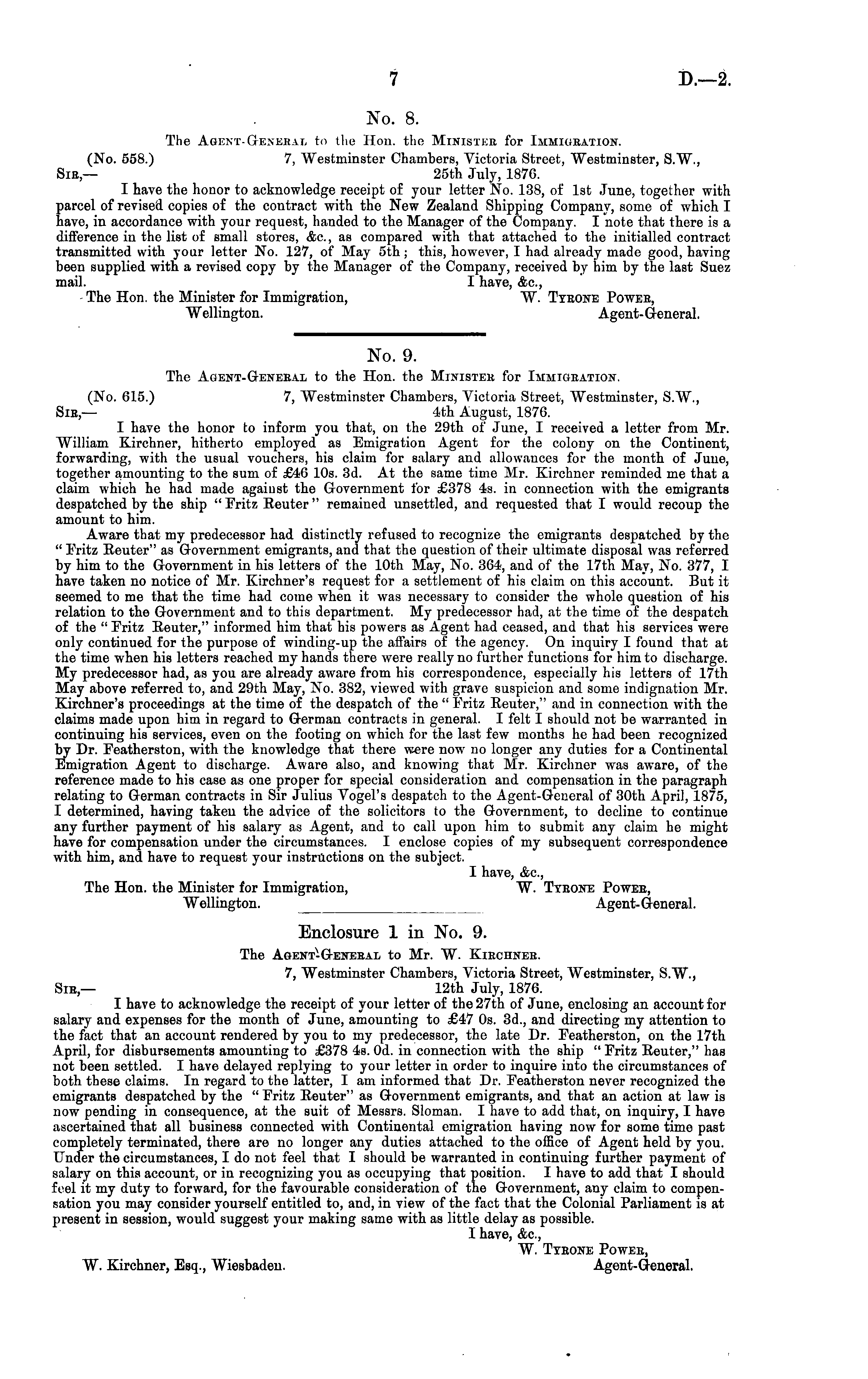 No. 9. The Agent-General to the Hon. the Minister for Immigration. (No. 615.) 7, Westminster Chambers, Victoria Street, Westminster, S.W., Sir,— 4th August, 1876. I have the honor to inform you that, on the 29th of June, I received a letter from Mr. William Kirchner, hitherto employed as Emigration Agent for the colony on the Continent, forwarding, with the usual vouchers, his claim for salary aud allowances for the month of June, together amounting to the sum of £46 10s. 3d. At the same time Mr. Kirchner reminded me that a claim which he had made against the Government for £378 4s. in connection with the emigrants despatched by the ship " Fritz Reuter" remained unsettled, and requested that I would recoup the amount to him. Aware that my predecessor had distinctly refused to recognize the emigrants despatched by the " Fritz Reuter" as Government emigrants, and that the question of their ultimate disposal was referred by him to the Government in his letters of the 10th May, No. 364, and of the 17th May, No. 377, I have taken no notice of Mr. Kirchner's request for a settlement of his claim on this account. But it seemed to me that the time had come when it was necessary to consider the whole question of his relation to the Government and to this department. My predecessor had, at the time of the despatch of the " Fritz Reuter," informed him that his powers as Agent had ceased, and that his services were only continued for the purpose of winding-up tho affairs of the agency. On inquiry I found that at the time when his letters reached my hands there were really no further functions for him to discharge. My predecessor had, as you are already aware from his correspondence, especially his letters of 17th May above referred to, and 29th May, No. 382, viewed with grave suspicion and some indignation Mr. Kirchner's proceedings at the time of the despatch of the " Fritz Reuter," and in connection with the claims made upon him in regard to German contracts in general. I felt I should not be warranted in continuing his services, even on the footing on which for the last few months he had been recognized by Dr. Featherston, with the knowledge that there were now no longer any duties for a Continental Emigration Agent to discharge. Aware also, and knowing that Mr. Kirchner was aware, of the reference made to his case as one proper for special consideration and compensation in the paragraph relating to German contracts in Sir Julius Vogel's despatch to the Agent-General of 30th April, 1875, I determined, having taken the advice of the solicitors to the Government, to decline to continue any further payment of his salary as Agent, and to call upon him to submit any claim he might have for compensation under the circumstances. I enclose copies of my subsequent correspondence with him, and have to request your instructions on the subject. I have, &c, The Hon. the Minister for Immigration, W. Tyrone Poweb, Wellington. Agent-General.