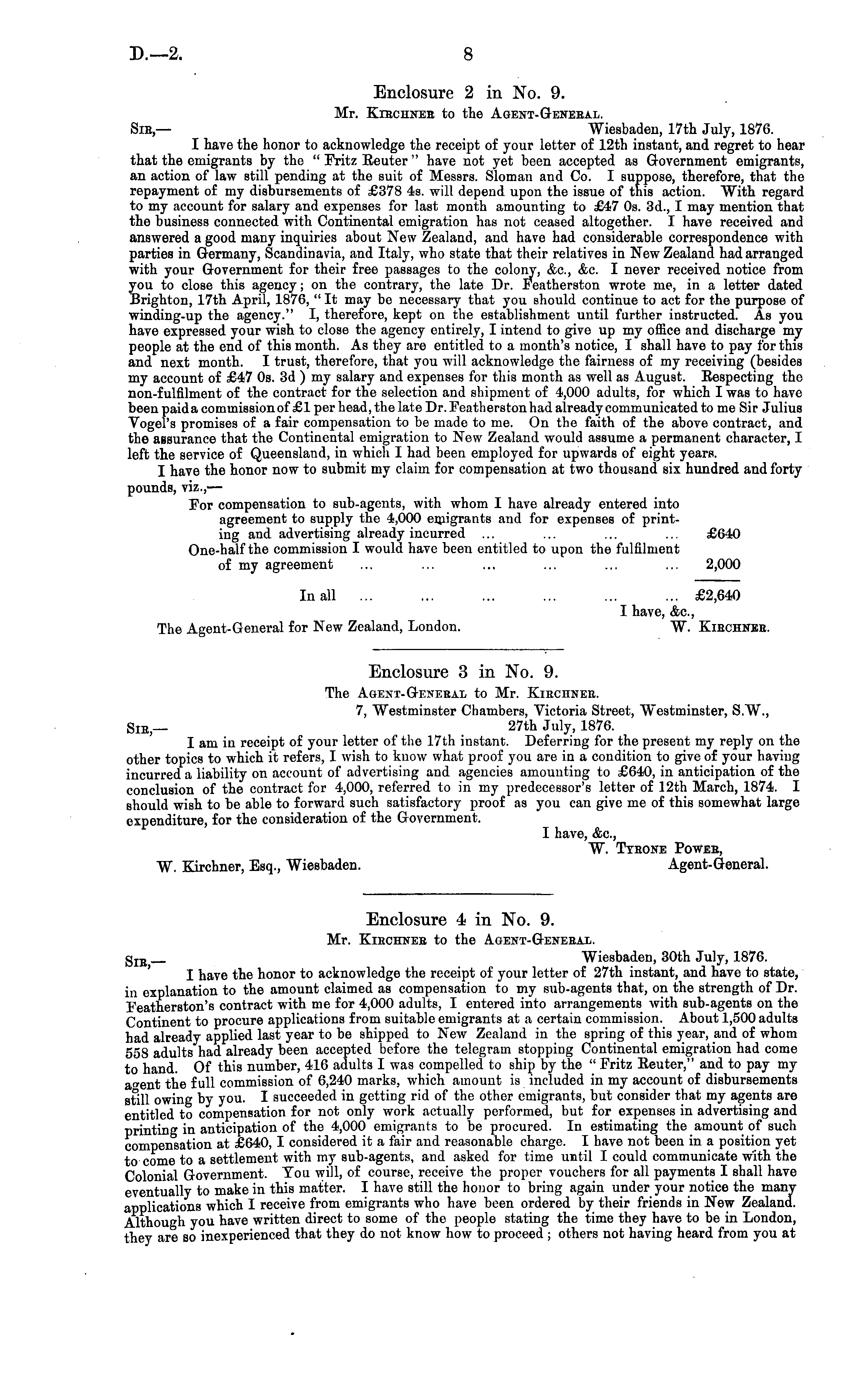 Enclosure 2 in No. 9. Mr. Kiechnee to the Agent-Geneeal. Sib,— Wiesbaden, 17th July, 1876. I have the honor to acknowledge the receipt of your letter of 12th instant, and regret to hear that the emigrants by the " Fritz Reuter " have not yet been accepted as Government emigrants, an action of law still pending at the suit of Messrs. Sloman and Co. I suppose, therefore, that the repayment of my disbursements of £378 4s. will depend upon the issue of this action. With regard to my account for salary and expenses for last month amounting to £47 Os. 3d., I may mention that the business connected with Continental emigration has not ceased altogether. I have received and answered a good many inquiries about New Zealand, and have had considerable correspondence with parties in Germany, Scandinavia, and Italy, who state that their relatives in New Zealand had arranged with your Government for their free passages to the colony, &c, &c. I never received notice from you to close this agency; on the contrary, the late Dr. Featherston wrote me, in a letter dated Brighton, 17th April, 1876, " It may be necessary that you should continue to act for the purpose of winding-up the agency." I, therefore, kept on the establishment until further instructed. As you have expressed your wish to close the agency entirely, I intend to give up my office and discharge my people at the end of this month. As they are entitled to a month's notice, I shall have to pay for this and next month. I trust, therefore, that you will acknowledge the fairness of my receiving (besides my account of £47 Os. 3d )my salary and expenses for this month as well as August. Respecting the non-fulfilment of the contract for the selection and shipment of 4,000 adults, for which I was to have been paid a commission of £1 per head, the late Dr. Featherston had already communicated to me Sir Julius Vogel's promises of a fair compensation to be made to me. On the faith of the above contract, and the assurance that the Continental emigration to New Zealand would assume a permanent character, I left the service of Queenslaud, in which I had been employed for upwards of eight years. I have the honor now to submit my claim for compensation at two thousand six hundred and forty pounds, viz., — For compensation to sub-agents, with whom I have already entered into agreement to supply the 4,000 emigrants and for expenses of printing and advertising already incurred ... ... ... ... £640 One-half the commission I would have been entitled to upon the fulfilment of my agreement ... ... ... ... ... ... 2,000 In all ... £2,640 I have, &c, The Agent-General for New Zealand, London. W. Kiechnee.