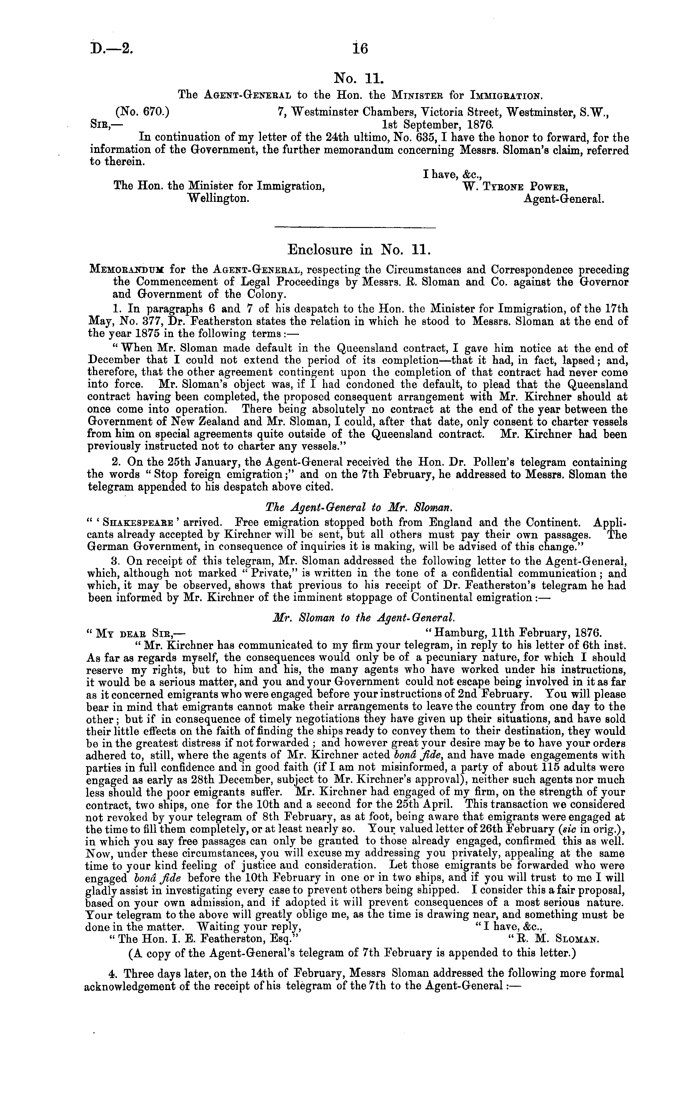 No. 11. The Agent-Genebal to the Hon. the Minister for Immigeation. (No. 670.) 7, Westminster Chambers, Victoria Street, Westminster, S.W., Sib, — Ist September, 1876. In continuation of my letter of the 24th ultimo, No. 635, I have the honor to forward, for the information of the Government, the further memorandum concerning Messrs. Sloman's claim, referred to therein. I have, &c., The Hon. the Minister for Immigration, W. Tybone Poweb, Wellington. Agent-General.