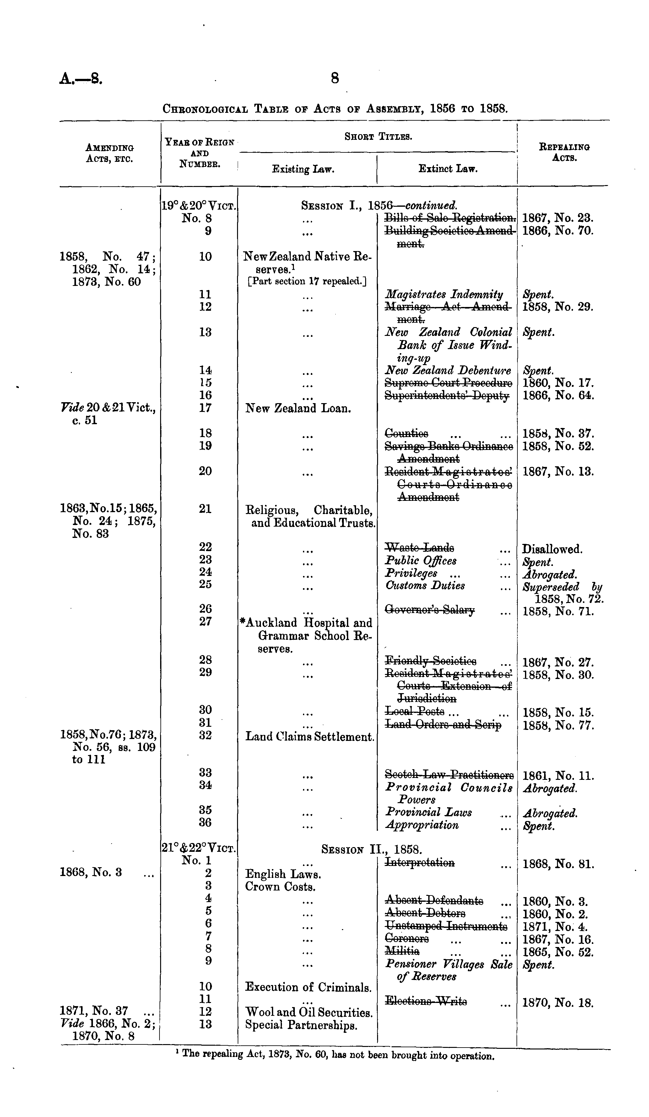 Short Titles. Amending Acts, etc. Yeab of Reign and NtJMBEE. Repealing Acts. Existing Law. Extinct Law. 19°&20°Vict. No. 8 9 Session I., If !5G — continued. 1867, No. 23. 1866, No. 70. .858, No. 47; 1862, No. 14; 1873, No. 60 10 New Zealand Native Reserves. 1 [Part section 17 repealed.] in out 11 12 Magistrates Indemnity Spent. 1858, No. 29. 13 14 15 16 17 New Zealand Colonial Bank of Issue Wind-ing-up New Zealand Debenture Supremo Court Procedure Suporintondonto' Deputy Spent. Spent. 1860, No. 17. 1866, No. 64. 20 & 21 Viet., c. 51 18 19 New Zealand Loan. 1858, No. 37. 1858, No. 52. 863,No.l5;1865, No. 24; 1875, No. 83 20 Amendment Rooidont M a g i o t r a t o o' 1867, No. 13. 21 Religious, Charitable, and Educational Trusts. Amendmont 22 23 24 25 Waoto Lando Public Offices Privileges Customs Duties Disallowed. Spent. Abrogated. Superseded by 1858, No. 72, 1858, No. 71. 26 27 *Auckland Hospital and Grammar School ReGovornor'o Salary 28 29 serves. Friondly Sociotieo Bcoidcnt M a g i o t r a t o g' Courto Extonoion of Juriodiotion Looal Pooto ... £.and Ordcro and Scrip 1867, No. 27. 1858, No. 30. 30 31 32 1858, No. 15. 1858, No. 77. 858,No.7G; 1873, No. 56, ss. 109 to 111 Land Claims Settlement. 33 34 Sootoli Law Practitionero Provincial Councils Powers Provincial Laics Appropriation 1861, No. 11. Abrogated. 35 36 Abrogated. Spent. .868, No. 3 21°&22°Vict. No. 1 2 3 4 5 6 7 8 9 Session I English Laws. Crown Costs. '.., 1858. Interprctatiea Aboont Dofondanto Aboont Debtors Unetnmpcd Inotrumento ■ " ■ I t t > ■ ■ Pensioner Villages Sale of Reserves 1868, No. 81. 1860, No. 3. 1860, No. 2. 1871, No. 4. 1867, No. 16. 1865, No. 52. Spent. 10 11 12 13 Execution of Criminals. Wool and Oil Securities. Special Partnerships. Elootiono "Write 1870, No. 18. 871, No. 37 ... 7ide 18G6, No. 2; 1870, No. 8 1 The repealing Act, 1873, No. 60, has not been brought into operation.
