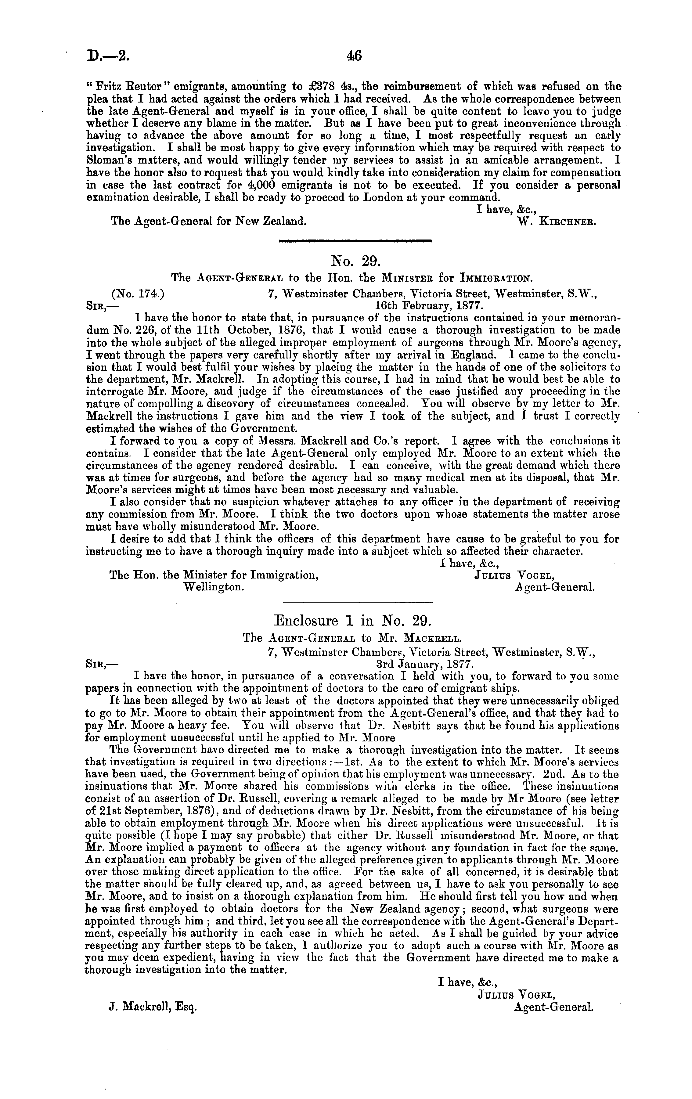No. 29. The Agent-Geneeal to the Hon. the Ministee for Immigeation. (No. 174.) 7, Westminster Chambers, Victoria Street, Westminster, S.W., Sic— 16th February, 1877. I have the honor to state that, in pursuance of the instructions contained in your memorandum No. 226, of the 11th October, 1876, that I would cause a thorough investigation to be made into the whole subject of the alleged improper employment of surgeons through Mr. Moore's agency, I went through the papers very carefully shortly after my arrival in England. I came to the conclusion that I would best fulfil your wishes by placing the matter in the hands of one of the solicitors to the department, Mr. Mackrell. In adopting this course, I had in mind that he would best be able to interrogate Mr. Moore, and judge if the circumstances of the case justified any proceeding in the nature of compelling a discovery of circumstances concealed. You will observe by my letter to Mr. Mackrell the instructions I gave him and the view I took of the subject, and I trust I correctly estimated the wishes of the Government. I forward to you a copy of Messrs. Mackrell and Co.'s report. I agree with the conclusions it contains. I consider that the late Agent-General only employed Mr. Moore to an extent which the circumstances of the agency rendered desirable. I can conceive, with the great demand which there was at times for surgeons, and before the agency had so many medical men at its disposal, that Mr. Moore's services might at times have been most necessary and valuable. I also consider that no suspicion whatever attaches to any officer in the department of receiving any commission from Mr. Moore. I think the two doctors upon whose statements the matter arose must have wholly misunderstood Mr. Moore. I desire to add that I think the officers of this department have cause to be grateful to you for instructing me to have a thorough inquiry made into a subject which so affected their character. I have, &c., The Hon. the Minister for Immigration, Julius Vogel, Wellington. Agent-General.