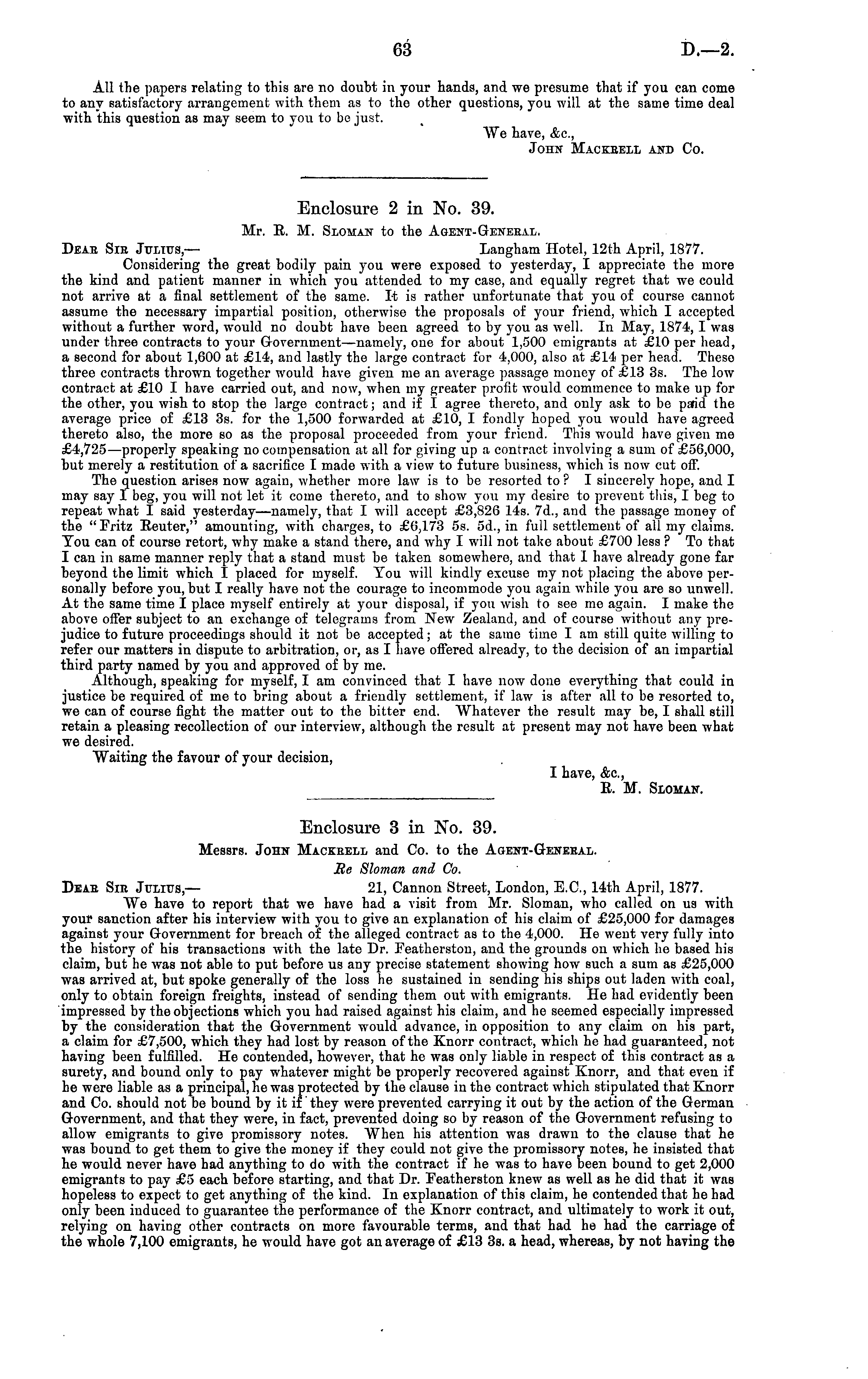 Enclosure 2 in No. 39. Mr. R. M. Sloman to the Agent-General. Dear Sir Julius, — Langham Hotel, 12th April, 1877. Considering the great bodily pain you were exposed to yesterday, I appreciate the more the kind and patient manner iv which you attended to my case, and equally regret that we could not arrive at a final settlement of tho same. It is rather unfortunate that you of course cannot assume the necessary impartial position, otherwise the proposals of your friend, which I accepted without a further word, would no doubt have been agreed to by you as well. In May, 1874, I was under three contracts to your Government —namely, one for about 1,500 emigrants at £10 per head, a second for about 1,600 at £14, and lastly the large contract for 4,000, also at £14 per head. These three contracts throwTi together would have given me an average passage money of £13 3s. The low contract at £10 I have carried out, and now, when my greater profit would commence to make up for the other, you wish to stop the large contract; and if I agree thereto, and only ask to be paid the average price of £13 3s. for the 1,500 forwarded at £10, I fondly hoped you would have agreed thereto also, the more so as the proposal proceeded from your friend. This would have given me £4,725 —properly speaking no compensation at all for giving up a contract involving a sum of £56,000, but merely a restitution of a sacrifice I made with a view to future business, which is now cut off. The question arises now again, whether more law is to be resorted to ? I sincerely hope, and I may say I beg, you will not let it come thereto, and to show you my desire to prevent this, I beg to repeat what I said yesterday—namely, that I will accept £3,826 14s. 7d., and the passage money of the "Fritz Reuter," amounting, with charges, to £6,173 ss. 5d., in full settlement of all my claims. You can of course retort, why make a stand there, and why I will not take about £700 less ? To that I can in same manner reply that a stand must be taken somewhere, and that I have already gone far beyond the limit which I placed for myself. You will kindly excuse my not placing the above personally before you, but I really have not the courage to incommode you again while you are so unwell. At tho same time I place myself entirely at your disposal, if you wish to see me again. I make the above offer subject to an exchange of telegrams from New Zealand, and of course without any prejudice to future proceedings should it not be accepted; at the same time I am still quite willing to refer our matters in dispute to arbitration, or, as I have offered already, to the decision of an impartial third party named by you and approved of by me. Although, speaking for myself, I am convinced that I have now done everything that could in justice be required of me to bring about a friendly settlement, if law is after all to be resorted to, we can of course fight the matter out to the bitter end. Whatever the result may be, I shall still retain a pleasing recollection of our interview, although the result at present may not have been what we desired. Waiting the favour of your decision, I have, Ac, R. M. Sloman.
