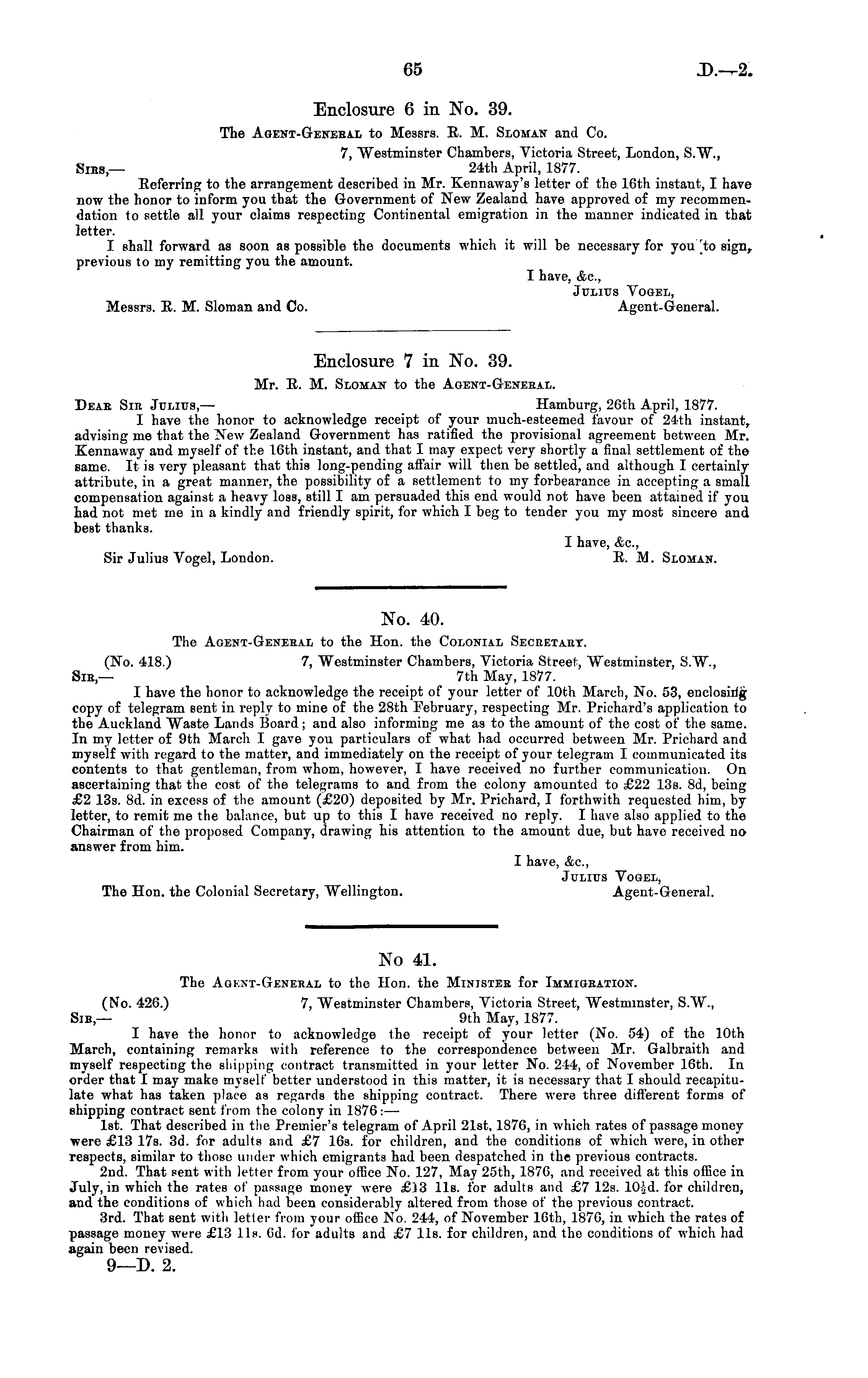 No 41. The Agent-General to the Hon. the Minister for Immigration. (No. 426.) 7, Westminster Chambers, Victoria Street, Westminster, S.W., Sib,— 9th May, 1877. I have the honor to acknowledge the receipt of your letter (No. 54) of the 10th March, containing remarks with reference to the correspondence between Mr. Galbraith and myself respecting the shipping contract transmitted in your letter No. 244, of November 16th. In order that I may make myself better understood in this matter, it is necessary that I should recapitulate what has taken place as regards the shipping contract. There were three different forms of shipping contract sent from the colony in 1876: —■ Ist. That described in the Premier's telegram of April 21st, 1876, in which rates of passage money were £13 17s. 3d. for adults and £7 16s. for children, and the conditions of which were, in other respects, similar to those under which emigrants had been despatched in the previous contracts. 2nd. That sent with letter from your office No. 127, May 25th, 1876, and received at this office in July, in which the rates of passage money were £]3 lis. for adults and £7 12s. 10id. for children, and the conditions of which had been considerably altered from those of the previous contract. 3rd. That sent with letter from your office No. 244, of November 16th, 1876, in which the rates of passage money were £13 lis. Od. for adults and £7 lis. for children, and the conditions of which had again been revised. 9—D. 2.