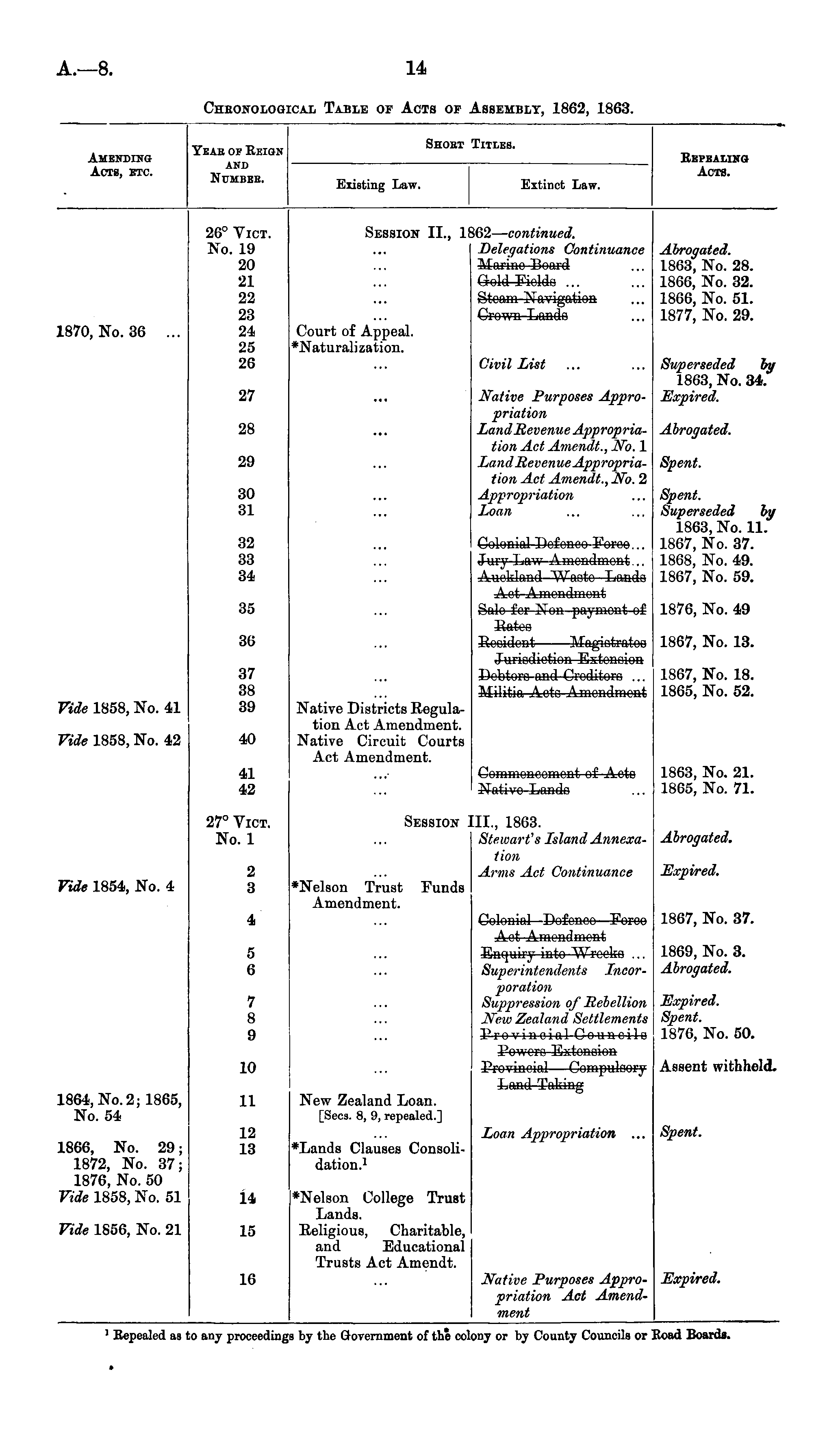 Short Titles. AMENDINa Acts, etc. Yeae op Eeion and NuMBEB. Repealing Acts. Existing Law. Extinct Law. 26° Vict. No. 19 20 21 22 23 24 25 26 Session II., 1 162— continued. Delegations Continuance Marino 13oard Gold Fiolda ... Steam Navigation Crown Lando Abrogated. 1863, No. 28. 1866, No. 32. 1866, No. 51. 1877, No. 29. 870, No. 36 Court of Appeal. *Naturalization. Civil List Superseded by 1863, No. 34. Expired. 27 Native Purposes Appropriation Land Revenue Appropriation Act Amendt., No. 1 Land Revenue Appropriation Act Amendt., No. 2 Appropriation Loan 28 Abrogated. 29 Spent. 30 31 32 33 34 Colonial Dofcneo Foroo... Jury Law Amendment... Spent. Superseded by 1863, No. 11. 1867, No. 37. 1868, No. 49. 1867, No. 59. 35 Aot Amendment Sulo for Non payment of 1876, No. 49 36 1867, No. 13. 37 38 39 Jurisdiction Extonoion Dobtoro and Croditoro ... Militia Acto Amendment 1867, No. 18. 1865, No. 52. ride 1858, No. 41 ride 1858, No. 42 40 Native Districts Regulation Act Amendment. Native Circuit Courts Act Amendment. 41 42 Commoncomont of Aoto Sfativo Lando 1863, No. 21. 1865, No. 71. 27° Vict. No. 1 Session II., 1863. Stewart's Island Annexation Arms Act Continuance Abrogated. 2 3 *Nelson Trust Funds Amendment. Expired. ride 1854, No. 4 4 5 6 Colonial Dofonco—Forco Act Amendment Enquiry into "Wrocko ... Superintendents Incorporation Suppression of Rebellion New Zealand Settlements 1867, No. 37. 1869, No. 3. Abrogated. 7 8 9 Expired. Spent. 1876, No. 50. 10 Powero Extonoion Assent withheld. 864, No. 2; 1865, No. 54 11 New Zealand Loan. [Sees. 8, 9, repealed.] kernel Taking 12 13 Loan Appropriation ... Spent. .866, No. 29; 1872, No. 37; 1876, No. 50 nde 1858, No. 51 14 ♦Lands Clauses Consolidation. 1 nde 1856, No. 21 15 ♦Nelson College Trust Lands. Religious, Charitable, and Educational Trusts Act Amendt. Native Purposes Appropriation Act Amendment 16 Expired. 'Hei lealed a9 to an iroceedini the Government of the col< or b' CountCouncils or Road Boards.