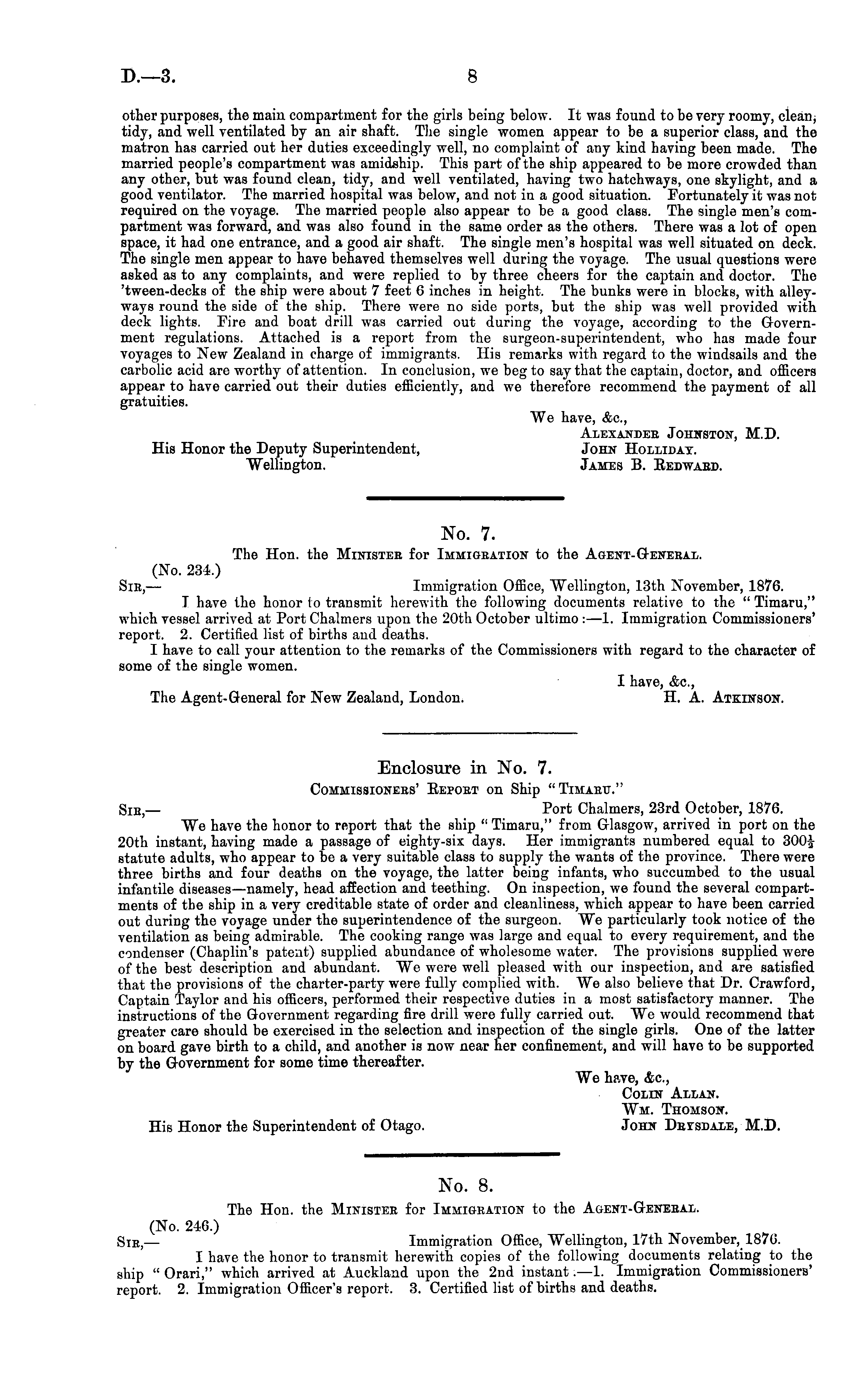 Enclosure in No. 7. Commissioners' Eeport on Ship "Timaru." Sib,— Port Chalmers, 23rd October, 1876. We have the honor to report that the ship " Timaru," from Glasgow, arrived in port on the 20th instant, having made a passage of eighty-six days. Her immigrants numbered equal to 300f statute adults, who appear to be a very suitable class to supply the wants of the province. There were three births and four deaths on the voyage, the latter being infants, who succumbed to the usual infantile diseases —namely, head affection and teething. On inspection, we found the several compartments of the ship in a very creditable state of order and cleanliness, which appear to have been carried out during the voyage under the superintendence of the surgeon. We particularly took notice of the ventilation as being admirable. The cooking range was large and equal to every requirement, and the condenser (Chaplin's patent) supplied abundance of wholesome water. The provisions supplied were of the best description and abundant. We were well pleased with our inspection, and are satisfied that the provisions of the charter-party were fully complied with. We also believe that Dr. Crawford, Captain Taylor and his officers, performed their respective duties in a most satisfactory manner. The instructions of the Government regarding fire drill were fully carried out. We would recommend that greater care should be exercised in the selection and inspection of the single girls. One of the latter on board gave birth to a child, and another is now near her confinement, and will have to be supported by the Government for some time thereafter. We have, &c, Colin Allan. Wm. Thomson. His Honor the Superintendent of Otago. John Drtsdale, M.D.