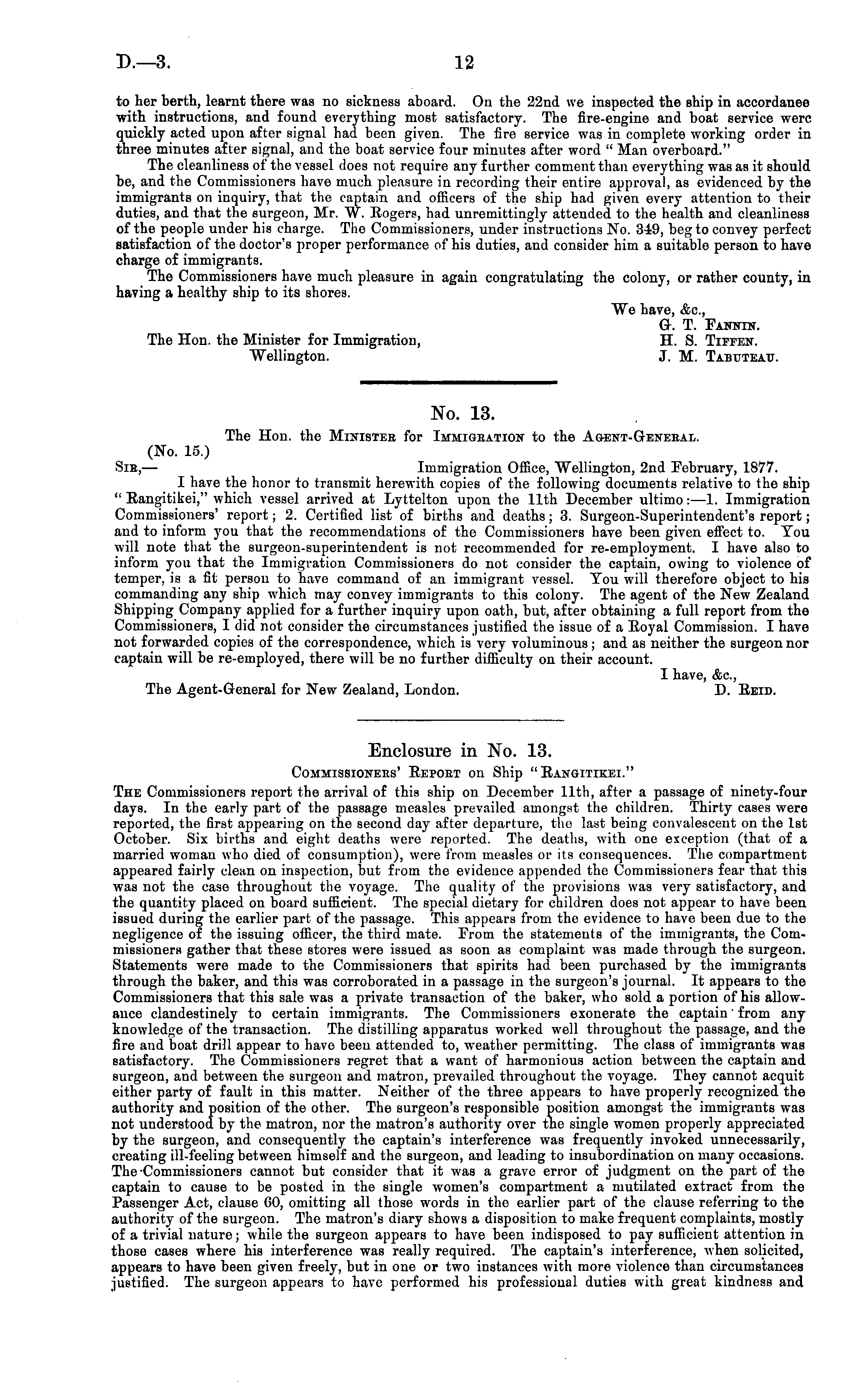 No. 13. The Hon. the Ministeb for Immigration to the Agent-Geneeal. (No. 15.) Sib, — Immigration Office, Wellington, 2nd February, 1877. I have the honor to transmit herewith copies of the following documents relative to the ship " Eangitikei," which vessel arrived at Lyttelton upon the 11th December ultimo: —1. Immigration Commissioners' report; 2. Certified list of births and deaths; 3. Surgeon-Superintendent's report; and to inform you that the recommendations of the Commissioners have been given effect to. Tou will note that the surgeon-superintendent is not recommended for re-employment. I have also to inform you that the Immigration Commissioners do not consider the captain, owing to violence of temper, is a fit person to have command of an immigrant vessel. You will therefore object to his commanding any ship which may convey immigrants to this colony. The agent of the New Zealand Shipping Company applied for a further inquiry upon oath, but, after obtaining a full report from the Commissioners, I did not consider the circumstances justified the issue of a Eoyal Commission. I have not forwarded copies of the correspondence, which is very voluminous; and as neither the surgeon nor captain will be re-employed, there will be no further difficulty on their account. I have, &c, The Agent-General for New Zealand, London. D. Eeid.