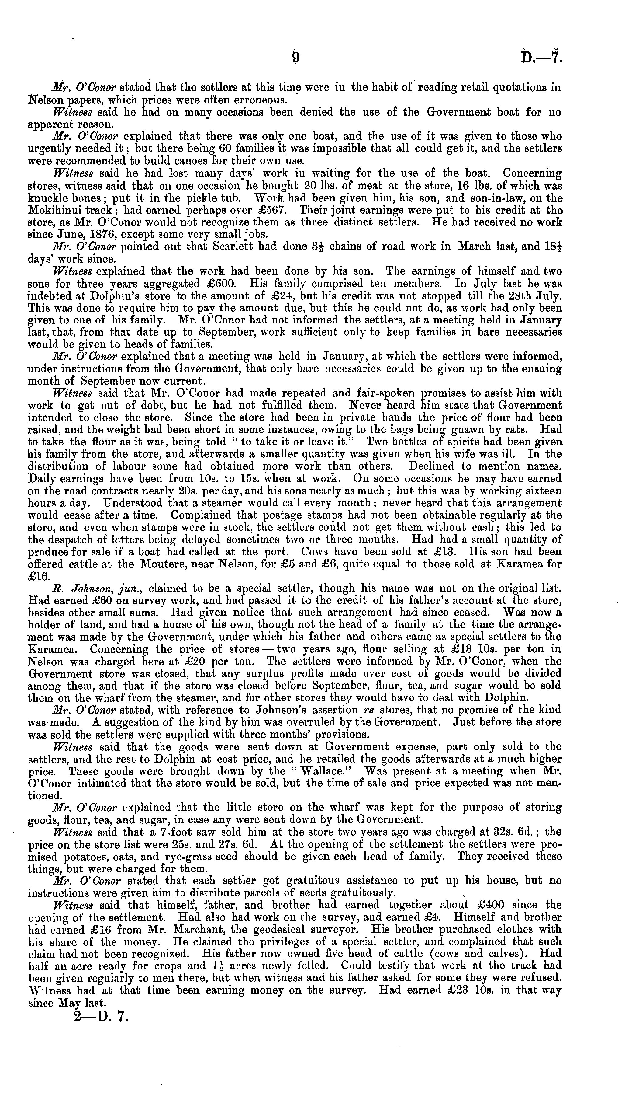 Mr. O'Conor stated that the settlers at this time were in the habit of reading retail quotations in Nelson papers, which prices were often erroneous. Witness said he had on many occasions been denied the use of the Government boat for no apparent reason. Mr. O'Conor explained that there was only one boat, and the use of it was given to those who urgently needed it; but there being 60 families it was impossible that all could get it, and the settlers were recommended to build canoes for their own use. Witness said he had lost many days' work in waiting for the use of the boat. Concerning stores, witness said that on one occasion he bought 20 lbs. of meat at the store, 16 lbs. of which was knuckle bones ; put it in the pickle tub. Work had been given him, his son, and son-in-law, on the Mokihinui track; had earned perhaps over £567. Their joint earnings were put to his credit at the store, as Mr. O'Conor would not recognize them as three distinct settlers. He had received no work since June, 1876, except some very small jobs. Mr. O'Conor pointed out that Scarlett had done 3\ chains of road work in March last, and 18| days' work since. Witness explained that the work had been done by his son. The earnings of himself aud two sons for three years aggregated £600. His family comprised ten members. In July last he was indebted at Dolphin's store to the amount of £24, but his credit was not stopped till the 28th July. This was done to require him to pay the amount due, but this he could not do, as work had only been given to one of his family. Mr. O'Conor had not informed the settlers, at a meeting held in January last, that, from that date up to September, work sufficient only to keep families in bare necessaries would be given to heads of families. Mr, O'Conor explained that a meeting was hold in January, at which the settlers were informed, under instructions from the Government, that only bare necessaries could be given up to the ensuing month of September now current. Witness said that Mr. O'Conor had made repeated and fair-spoken promises to assist him with work to get out of debt, but he had not fulfilled them. Never heard him state that Government intended to close the store. Since the store had been in private hands the price of flour had been raised, and the weight had been short in some instances, owing to the bags being gnawn by rats. Had to take the flour as it was, being told "to take it or leave it." Two bottles of spirits had been given his family from the store, and afterwards a smaller quantity was given when his wife was ill. In the distribution of labour some had obtained more work than others. Declined to mention names. Daily earnings have been from 10s. to 15s. when at work. On some occasions he may have earned on the road contracts nearly 20s. per day, and his sons nearly as much ; but this was by working sixteen hours a day. Understood that a steamer would call every month ; never heard that this arrangement would cease after a time. Complained that postage stamps had not been obtainable regularly at the store, and even when stamps were in stock, the settlers could not get them without cash; this led to the despatch of letters being delayed sometimes two or three months. Had had a small quantity of produce for sale if a boat had called at the port. Cows have been sold at £13. His son had been offered cattle at the Moutere, near Nelson, for £5 and £6, quite equal to those sold at Karamea for £16. R. Johnson, jun., claimed to be a special settler, though his name was not on the original list. Had earned £60 on survey work, and had passed it to the credit of his father's account at the store, besides other small sums. Had given notice that such arrangement had since ceased. AVas now a holder of land, and had a house of his own, though not the head of a family at the time the arrangement w ras made by the Government, under which his father and others came as special settlers to the Karamea. Concerning the price of stores — two years ago, flour selling at £13 10s. per ton in Nelson was charged here at £20 per ton. The settlers were informed by Mr. O'Conor, when the Government store was closed, that any surplus profits made over cost of goods would be divided among them, and that if the store was closed before September, flour, tea, and sugar would be sold them on the wharf from the steamer, and for other stores they would have to deal with Dolphin. Mr. O'Conor stated, with reference to Johnson's assertion re stores, that no promise of the kind was made. A suggestion of the kind by him was overruled by the Government. Just before the store was sold the settlers were supplied with three months' provisions. Witness said that the goods were sent down at Government expense, part only sold to the settlers, and the rest to Dolphin at cost price, and he retailed the goods afterwards at a much higher price. These goods were brought down by the " AVallace." Was present at a meeting when Mr. O'Conor intimated that the store would be sold, but the time of sale and price expected was not mentioned. Mr. O'Conor explained that the little store on the wharf was kept for the purpose of storing goods, flour, tea, and sugar, in case any were sent down by the Government. Witness said that a 7-foot saw sold him at the store two years ago was charged at 325. 6d.; the price on the store list were 255. and 275. 6d. At the opening of the settlement the settlers were promised potatoes, oats, and rye-grass seed should be given each head of family. They received these things, but were charged for them. Mr. O'Conor stated that each settler got gratuitous assistance to put up his house, but no instructions were given him to distribute parcels of seeds gratuitously. Witness said that himself, father, aud brother had earned together about £400 since the opening of the settlement. Had also had work on the survey, aud earned £4. Himself and brother had earned £16 from Mr. Marchant, tho geodesica
