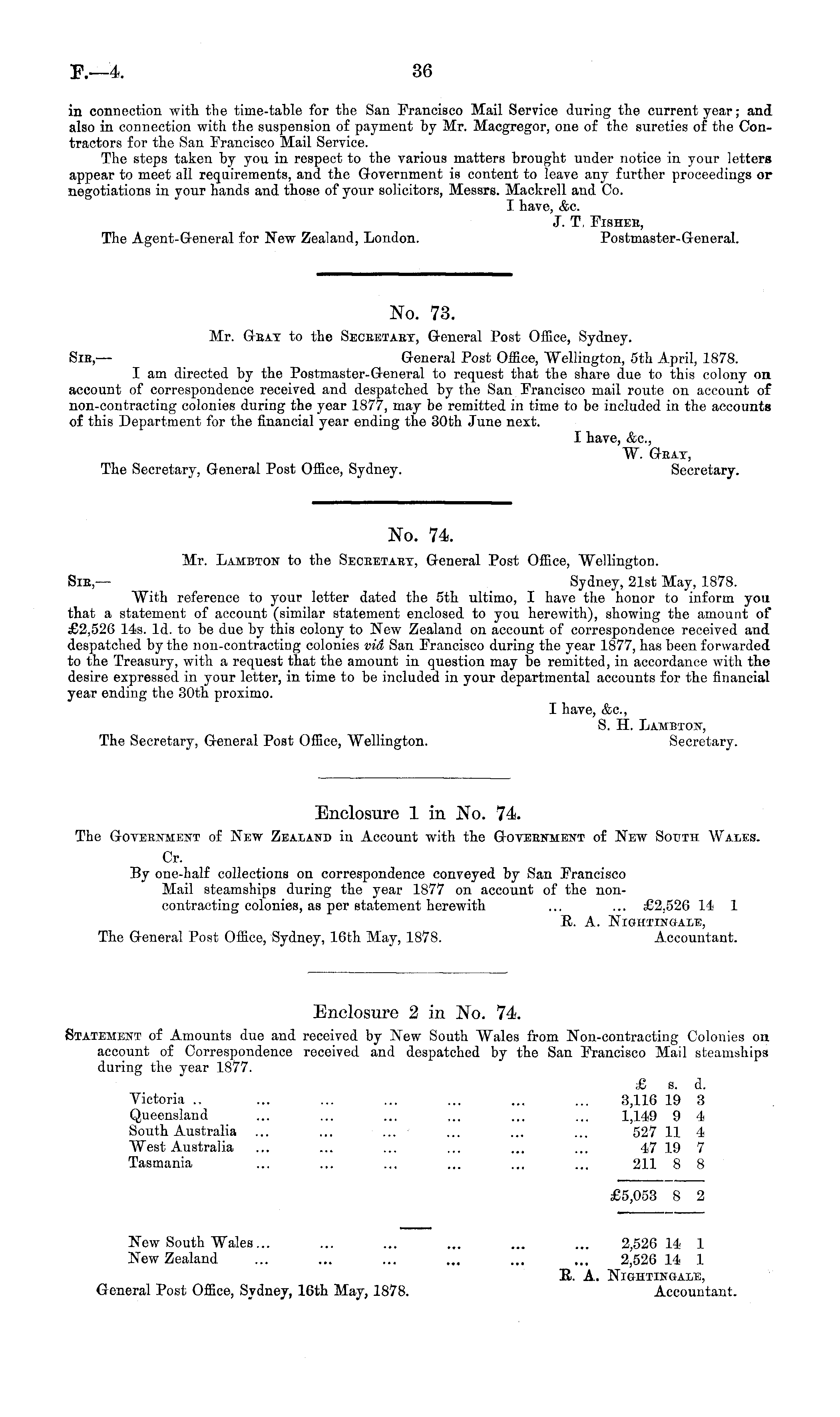 Enclosure 1 in No. 74. The Government of New Zealand in Account with the Government of New South Wales. Cr. By one-half collections on correspondence conveyed by San Francisco Mail steamships during the year 1877 on account of the noncontracting colonies, as per statement herewith ... ... £2,526 14 1 R. A. Nightingale, The General Post Office, Sydney, 16th May, 1878. Accountant.