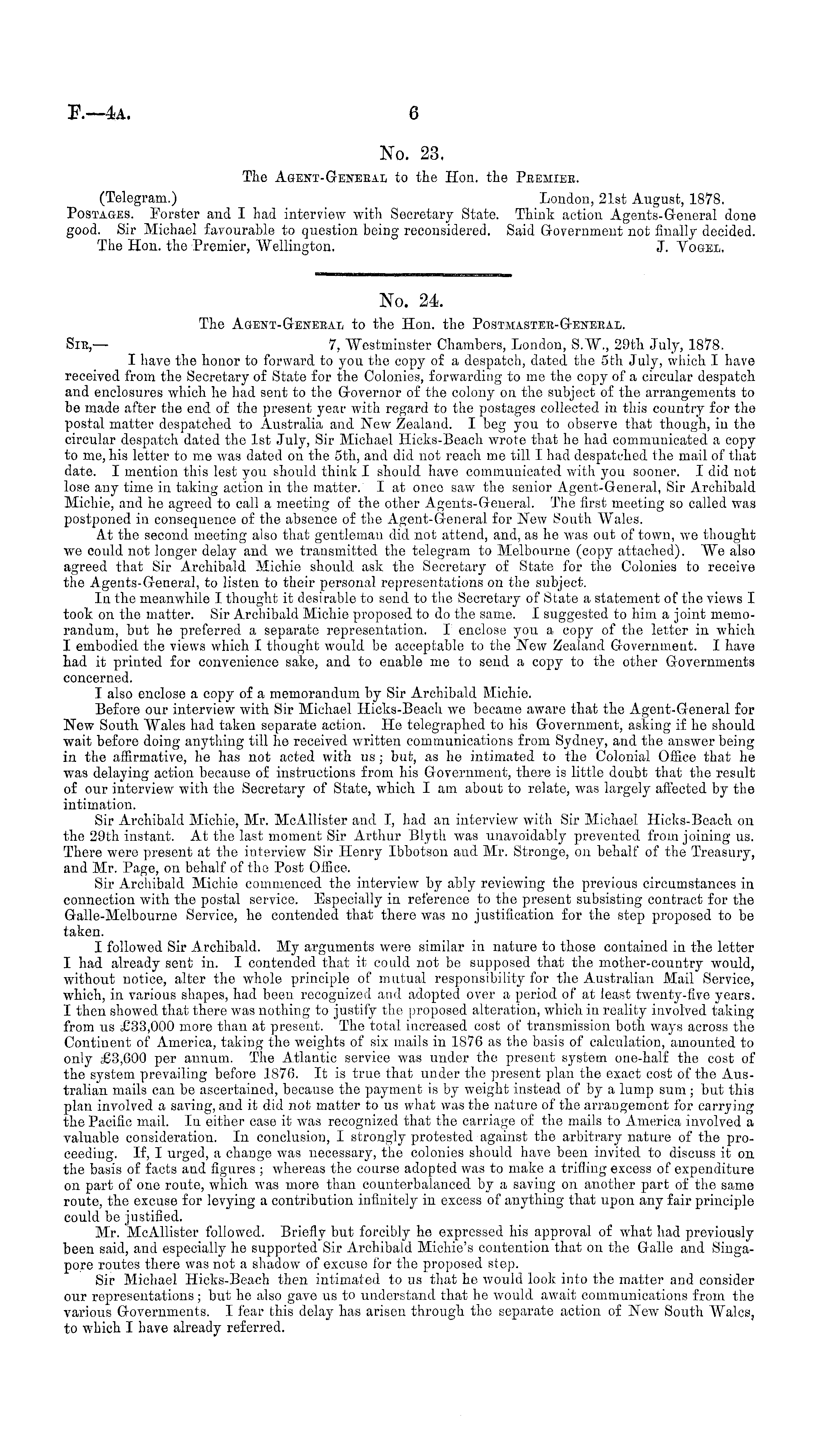 No. 24. The Agent-Geneeal to the Hon. the Postmastee-General. Sir, — 7, Westminster Chambers, London, S.W., 29th July, 1878. I have the honor to forward to you the copy of a despatch, dated the sth July, which I have received from the Secretary of State for the Colonies, forwarding to me the copy of a circular despatch and enclosures which he had sent to the Governor of the colony on the subject of the arrangements to be made after the end of the present year with regard to the postages collected in this country for the postal matter despatched to Australia and New Zealand. I beg you to observe that though, in the circular despatch dated the Ist July, Sir Michael Hicks-Beach wrote that he had communicated a copy to me, his letter to me was dated on the sth, and did not reach me till I had despatched the mail of that date. I mention this lest you should think I should have communicated with you sooner. I did not lose any time in taking action in the matter. I at once saw the senior Agent-General, Sir Archibald Michie, and he agreed to call a meeting of the other Agents-General. The first meeting so called was postponed in consequence of the absence of the Agent-General for New South Wales. At the second meeting also that gentleman did not attend, and, as he was out of town, we thought we could not longer delay and we transmitted the telegram to Melbourne (copy attached). We also agreed that Sir Archibald Michie should ask the Secretary of State for the Colonies to receive the Agents-General, to listen to their personal representations on the subject. In the meanwhile I thought it desirable to send to the Secretary of State a statement of the views I took on the matter. Sir Archibald Michie proposed to do the same. I suggested to him a joint memorandum, but he preferred a separate representation. I enclose you a copy of the letter in which I embodied the views which I thought would be acceptable to the New Zealand Government. I have had it printed for convenience sake, and to enable me to send a copy to the other Governments concerned. I also enclose a copy of a memorandum by Sir Archibald Michie. Before our interview with Sir Michael Hicks-Beach we became aware that the Agent-General for New South Wales had taken separate action. He telegraphed to his Government, asking if he should wait before doing anything till he received written communications from Sydney, and the answer being in the affirmative, he has not acted with us; but, as he intimated to the Colonial Office that he was delaying action because of instructions from his Government, there is little doubt that the result of our interview with the Secretary of State, which I am about to relate, was largely affected by the intimation. Sir Archibald Michie, Mr. McAllister and I, had an interview with Sir Michael Hicks-Beach on the 29th instant. At the last moment Sir Arthur Blyth was unavoidably prevented from joining us. There were present at the interview Sir Henry Ibbotson and Mr. Stronge, on behalf of the Treasury, and Mr. Page, on behalf of the Post Office. Sir Archibald Michie commenced the interview by ably reviewing the previous circumstances in connection with tho postal service. Especially in reference to the present subsisting contract for the Galle-Melbourne Service, he contended that there was no justification for the step proposed to be taken. I followed Sir Archibald. My arguments were similar in nature to those contained in the letter I had already sent in. I contended that it could not be supposed that the mother-country would, without notice, alter the whole principle of mutual responsibility for the Australian Mail Service, which, in various shapes, had been recognized and adopted over a period of at least twenty-five years. I then showed that there was nothing to justify the proposed alteration, which in reality involved taking from us =£33,000 more than at present. The total increased cost of transmission both ways across the Continent of America, taking the weights of six mails in 1876 as the basis of calculation, amounted to only £3,600 per annum. The Atlantic service was under the present system one-half the cost of the system prevailing before 1876. It is true that under the present plan the exact cost of the Australian mails can be ascertained, because the payment is by weight instead of by a lump sum; but this plan involved a saving, and it did not matter to us what was the nature of the arrangement for carrying the Pacific mail. In either case it was recognized that the carriage of the mails to America involved a valuable consideration. In conclusion, I strongly protested against the arbitrary nature of the proceeding. If, I urged, a change was necessary, the colonies should have been invited to discuss it on the basis of facts and figures ; whereas the course adopted was to make a trifling excess of expenditure on part of one route, which was more than counterbalanced by a saving on another part of the same route, the excuse for levying a contribution infinitely in excess of anything that upon any fair principle could be justified. Mr. McAllister followed. Briefly but forcibly he expressed his approval of what had previously been said, and especially he supported Sir Archibald Michie's contention that on the Galle and Singapore routes there was not a shadow of excuse for the proposed step. Sir Michael Hicks-Beach then intimated to us that he would look into the matter and consider our representations ; but he also gave us to understand that he would await communications from the various Governments. I fear this delay has arisen through the separate action of New South Wales, to which I have already referred.