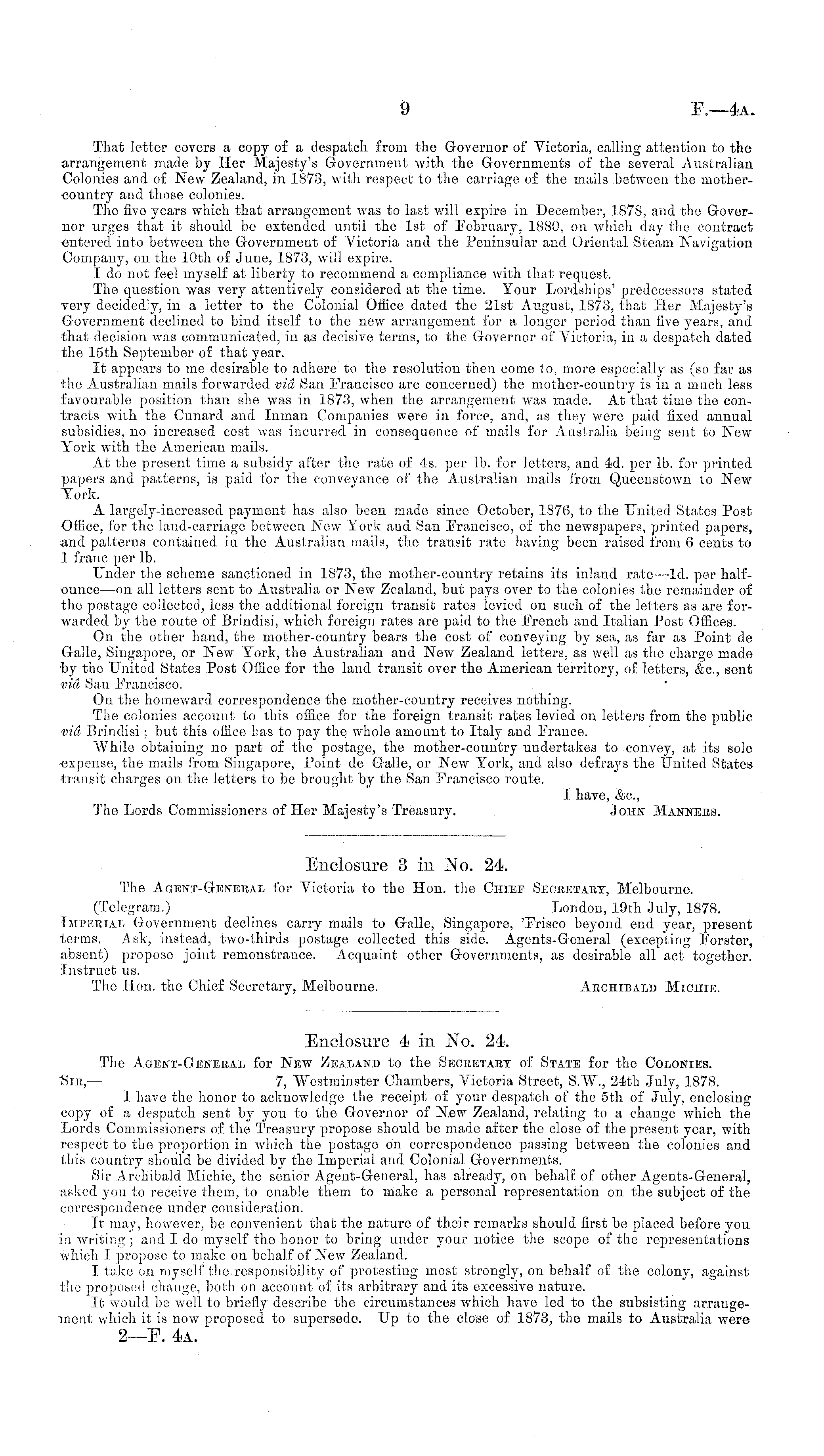 Enclosure 4 in No. 24. The Agent-General for New Zealand to the Secretary of State for the Colonies. Sir, — 7, Westminster Chambers, Victoria Street, S.W., 24th July, 1878. I have the honor to acknowledge the receipt of your despatch of the sth of July, enclosing copy of a despatch, sent by you to the Governor of New Zealand, relating to a change which the Lords Commissioners of the Treasury propose should be made after the close of the present year, with respect to the proportion in which the postage on correspondence passing between the colonies and this country should be divided by the Imperial and Colonial Governments. Sir Archibald Michie, tho senior Agent-General, has already, on behalf of other Agents-General, asked you to receive them, to enable them to make a personal representation on the subject of the correspondence under consideration. It may, however, be convenient that the nature of their remarks should first be placed before yon in writing ; and I do myself the honor to bring under your notice the scope of the representations which I propose to make on behalf of New Zealand. I ta'ce on myself the.responsibility of protesting most strongly, on behalf of the colony, against the proposed change, both on account of its arbitrary and its excessive nature. It would bo well to briefly describe the circumstances which have led to the subsisting arrangement which it is now proposed to supersede. Up to the close of 1873, the mails to Australia were 2—E. 4a.