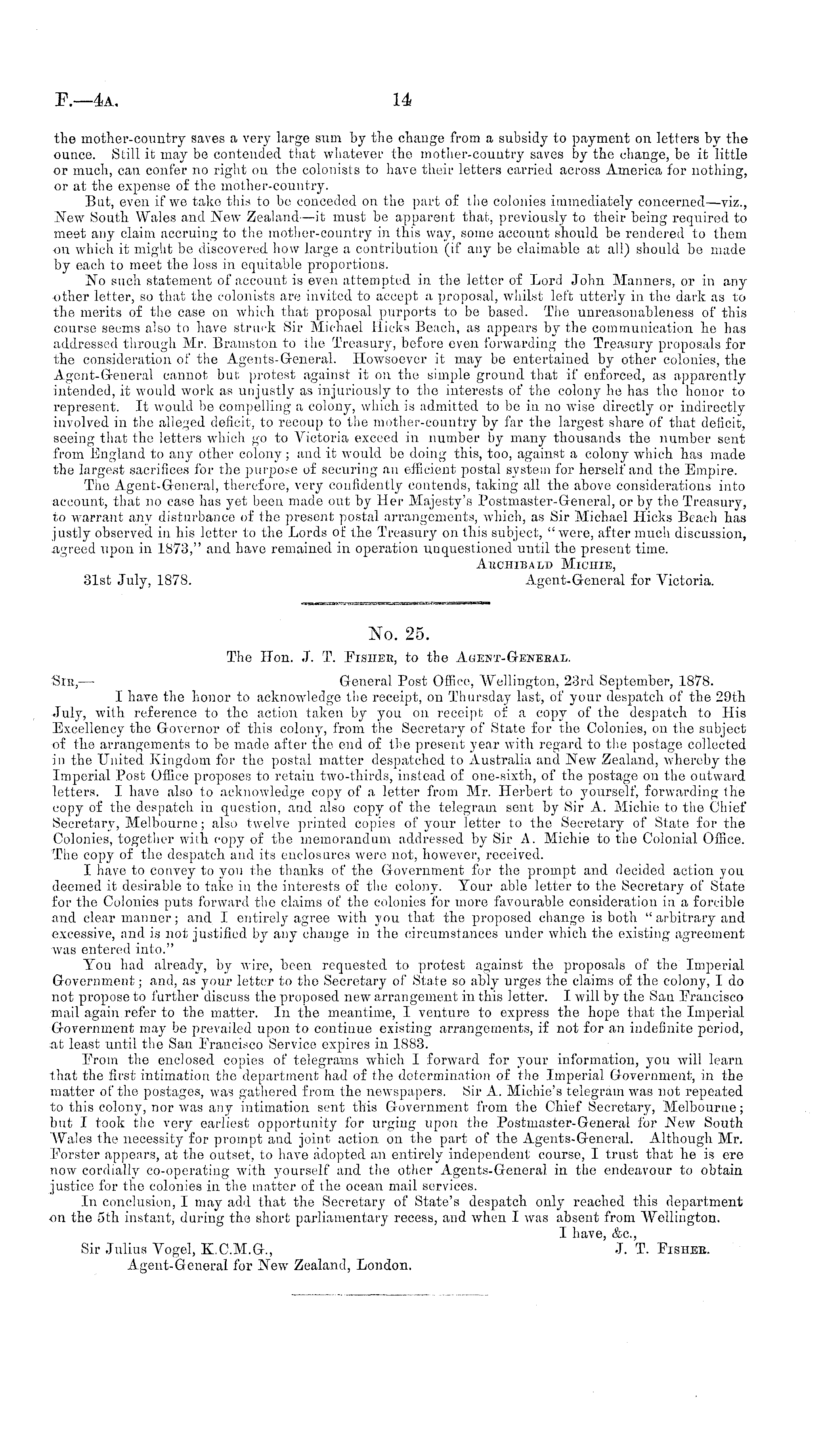 No. 25. The Hon. J. T. Fisher, to the Agent-Geneeal. Sir, — General Post Office, Wellington, 23rd September, 1878. I have the honor to acknowledge the receipt, on Thursday last, of your despatch of the 29th July, with reference to the action taken by you on receipt of a copy of the despatch to His Excellency the Governor of this colony, from the Secretary of State for the Colonies, on the subject of the arrangements to be made after the end of the present year with regard to the postage collected in the United Kingdom for tho postal matter despatched to Australia and New Zealand, whereby the Imperial Post Office proposes to retain two-thirds, instead of one-sixth, of the postage on the outward letters. I have also to acknowledge copy of a letter from Mr. Herbert to yourself, forwarding the copy of the despatch in question, and also copy of the telegram sent by Sir A. Michie to the Chief Secretary, Melbourne; also twelve printed copies of your letter to the Secretary of State for the Colonies, together with copy of the memorandum addressed by Sir A. Michie to the Colonial Office. The copy of tho despatch and its enclosures were not, however, received. I have to convey to yon the thanks of the Government for the prompt and decided action you deemed it desirable to take in the interests of the colony. Your able letter to the Secretary of State for the Colonies puts forward the claims of the colonies for more favourable consideration in a forcible and clear manner; and I entirely agree with you that the proposed change is both " arbitrary and excessive, and is not justified by any change in the circumstances under which the existing agreement was entered into." You had already, by wire, been requested to protest against the proposals of the Imperial Government; and, as your letter to the Secretary of State so ably urges the claims of the colony, Ido not propose to further discuss the proposed new arrangement in this letter. I will by the San Francisco mail again refer to the matter. In the meantime, I venture to express the hope that the Imperial Government may be prevailed upon to continue existing arrangements, if not for an indefinite period, at least until the San Francisco Service expires in 1883. From the enclosed copies of telegrams which I forward for your information, you will learn that the first intimation the department had of the determination of the Imperial Government, in the matter of the postages, was gathered from the newspapers. Sir A. Michie's telegram was not repeated to this colony, nor was any intimation sent this Government from tho Chief Secretary, Melbourne; but I took the very earliest opportunity for urging upon the Postmaster-General for New South Wales the necessity for prompt and joint action on the part of the Agents-General. Although Mr. Forster appears, at the outset, to have adopted an entirely independent course, I trust that he is ere now cordially co-operating with yourself and tho other Agents-General in the endeavour to obtain justice for the colonies in the matter of the ocean mail services. In conclusion, I may add that the Secretary of State's despatch only reached this department -on the sth instant, during the short parliamentary recess, and when I was absent from Wellington. I have, &c, Sir Julius Vogel, K.C.M.G., J. T. Fishee. Agent-General for New Zealand, London.
