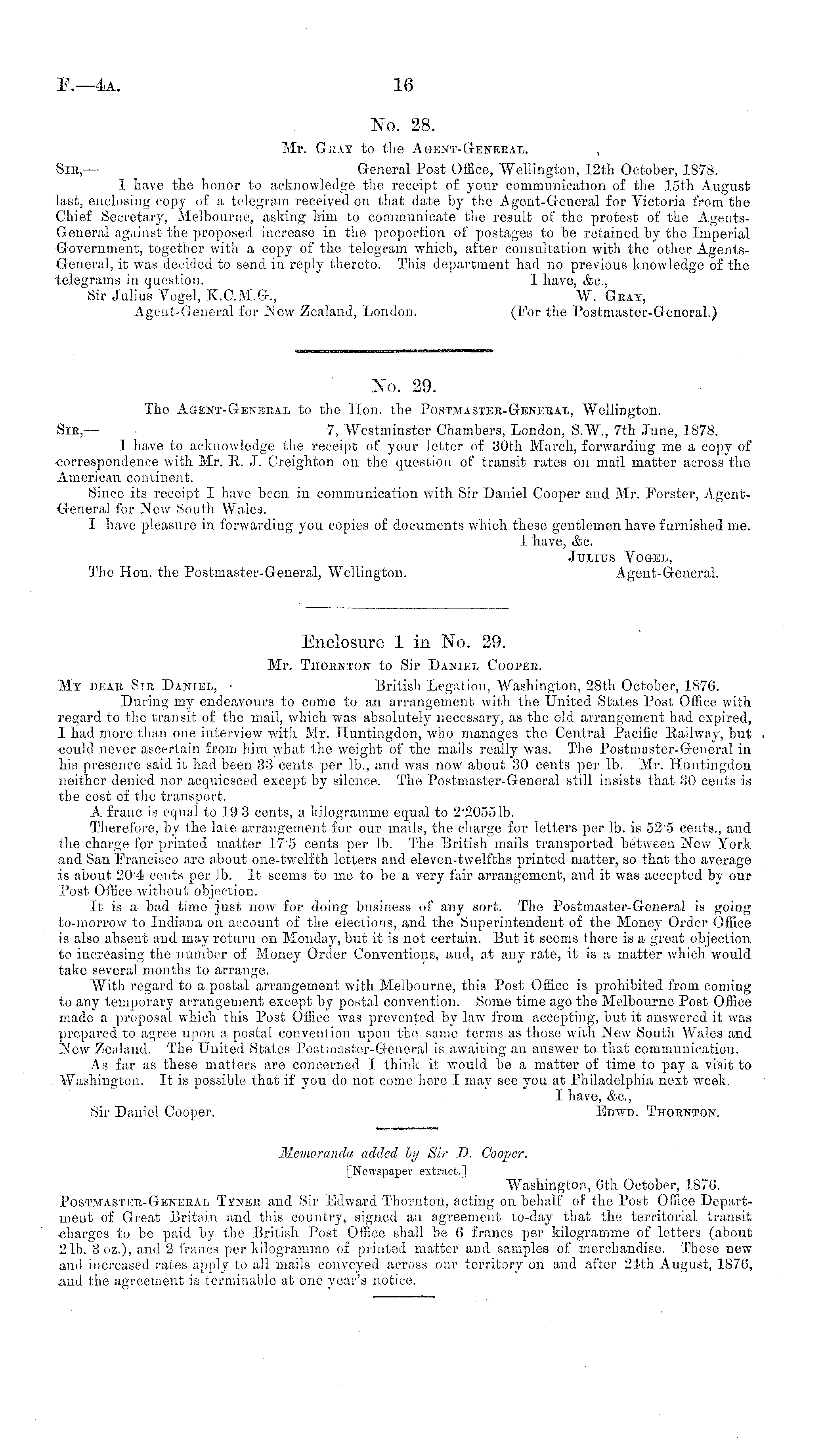 No. 29. The Agent-Geneeal to the Hon. the Postmastee-Geneeal, Wellington. Sir, — 7, Westminster Chambers, London, S.W., 7th June, 1878. I have to acknowledge the receipt of your letter of 30th March, forwarding me a copy of correspondence with Mr. R. J. Creighton on the question of transit rates on mail matter across the American continent. Since its receipt I have been in communication with Sir Daniel Cooper and Mr. Forster, A.gentGeneral for New South Wales. I have pleasure in forwarding you copies of documents which these gentlemen have furnished me. I have, &c. Julius Vogel, Tho Hon. the Postmaster-General, Wellington. Agent-General.