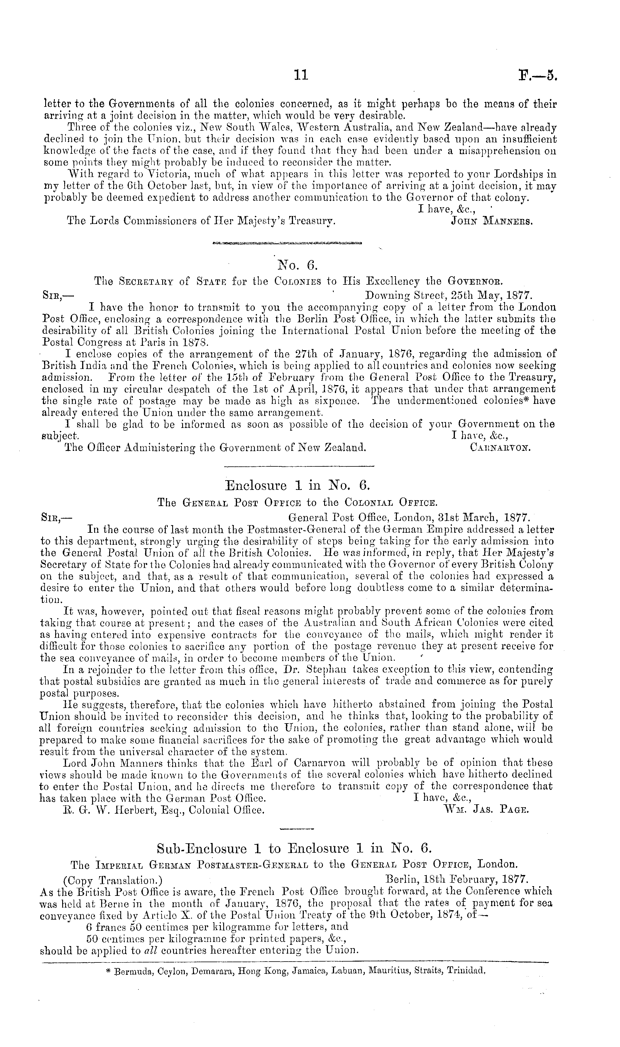 No. 6. The Secretary of State for the Colonies to His Excellency the Governor. Sic,— Downing Street, 25th May, 1877. I have the honor to transmit to you the accompanying copy of a letter from the London Post Office, enclosing a correspondence with the Berlin Post Office, in which the latter submits the desirability of all British Colonies joining the International Postal Union before the meeting of the Postal Congress at Paris in 1878. I enclose copies of tho arrangement of the 27th of January, 1876, regarding the admission of British India and the French Colonies, which is being applied to all countries and colonies now seeking admission. From the letter of the 15th of February from the General Post Office to the Treasury, enclosed in my circular despatch of the Ist of April, 1870, it appears that under that arrangement the single rate of postage may be made as high as sixpence. The undermentioned colonies* have already entered the Union under the same arrangement. I shall be glad to be informed as soon as possible of tho decision of your Government on the subject. I have, &c, The Officer Administering tho Government of New Zealand. Carnarvon.