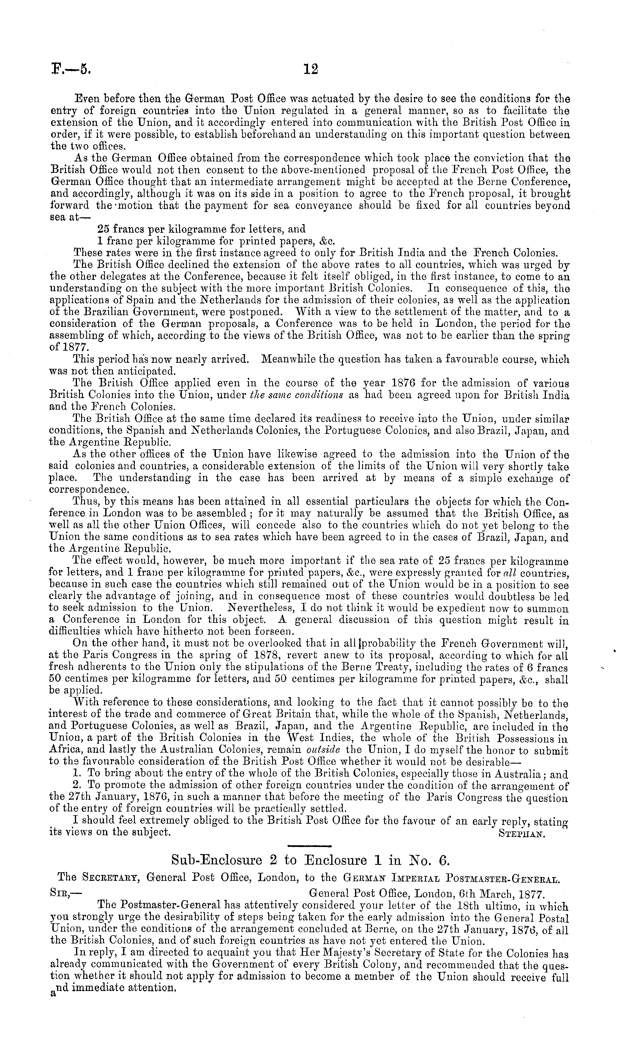 Sub-Enclosure 2 to Enclosure 1 in No. 6. The Secretary, General Post Office, London, to the German Imperial Postmaster-General. Sir, — General Post Office, London, 6lh March, 1877. The Postmaster-General has attentively considered your letter of the 18th ultimo, in which you strongly urge the desirability of steps being taken for the early admission into the General Postal Union, under the conditions of the arrangement concluded at Berne, on the 27th January, 1876, of all the British Colonies, and of such foreign countries as have not yet entered the Union. In reply, I am directed to acquaint you that Her Majesty's Secretary of State for the Colonies has already communicated with the Government of every British Colony, and recommended that the question whether it should not apply for admission to become a member of the Union should receive full „nd immediate attention, a