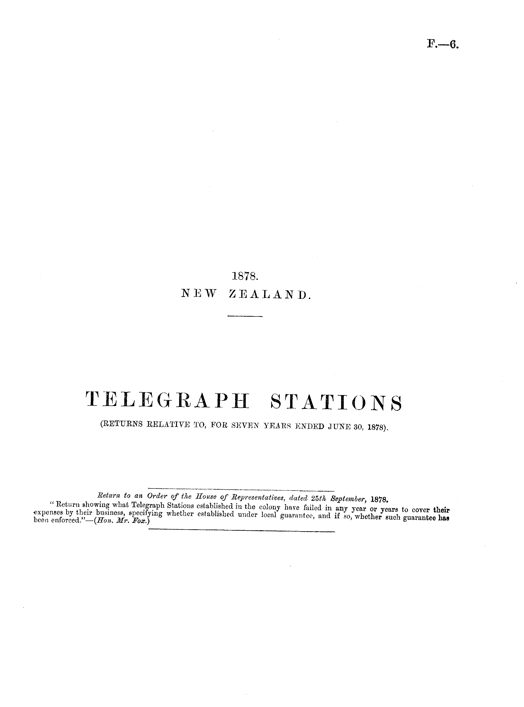 1878. NEW ZEALAND. TELEGRAPH STATIONS (RETURNS RELATIVE TO, FOR SEVEN YEARS ENDED JUNE 30, 1878).