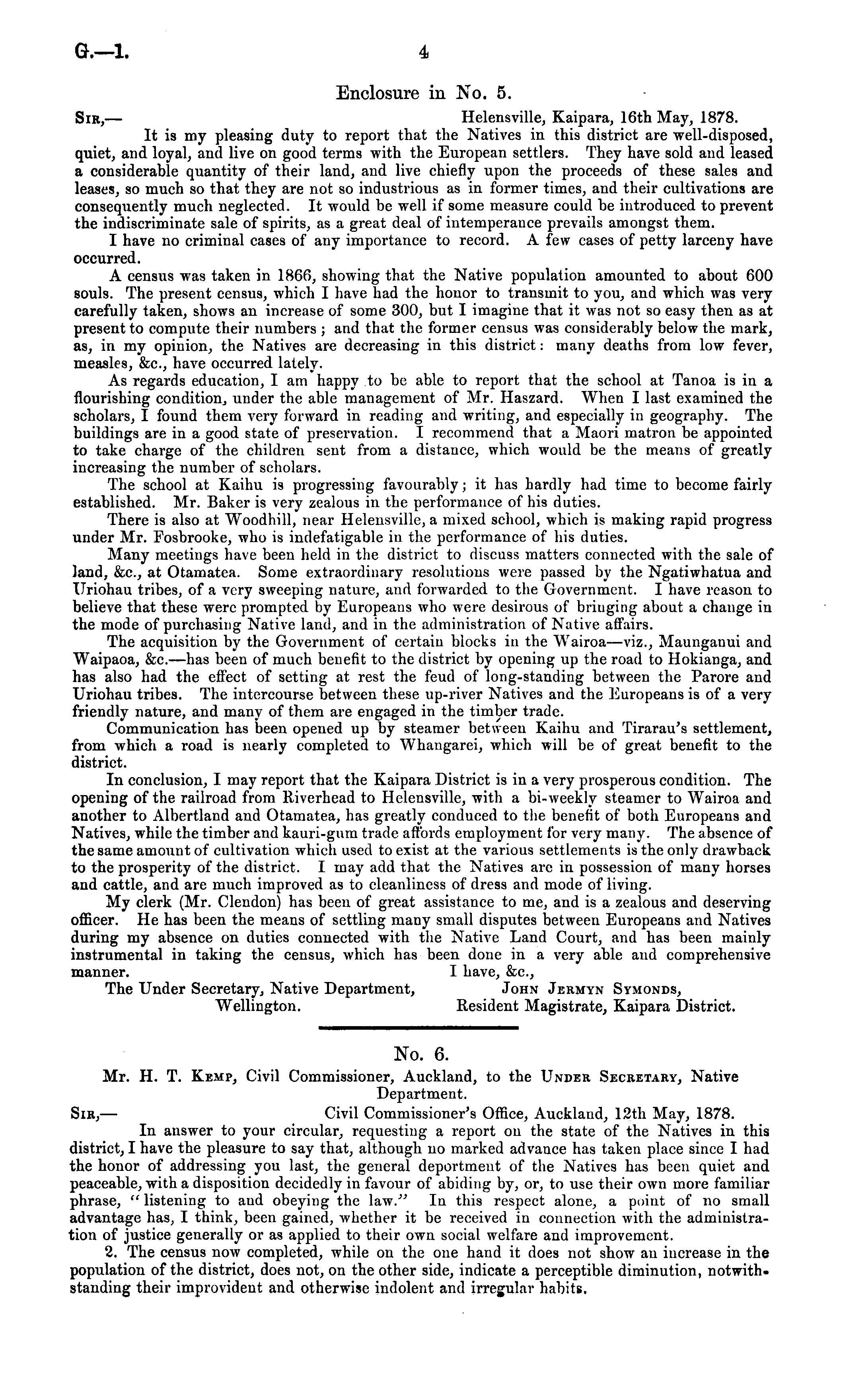 No. 6. Mr. H. T. Kemp, Civil Commissioner, Auckland, to the Under Secretary, Native Department. Sir, — Civil Commissioner's Office, Auckland, 12tli May, 1878. In answer to your circular, requesting a report on the state of the Natives in this district, I have the pleasure to say that, although no marked advance has taken place since I had the honor of addressing you last, the general deportment of the Natives has been quiet and peaceable, with a disposition decidedly in favour of abiding by, or, to use their own more familiar phrase, " listening to and obeying the law." In this respect alone, a point of no small advantage has, I think, been gained, whether it be received in connection with the administration of justice generally or as applied to their own social welfare and improvement. 2. The census now completed, while on the one hand it does not show an increase in the population of the district, does not, on the other side, indicate a perceptible diminution, notwithstanding their improvident and otherwise indolent and irregular habits.
