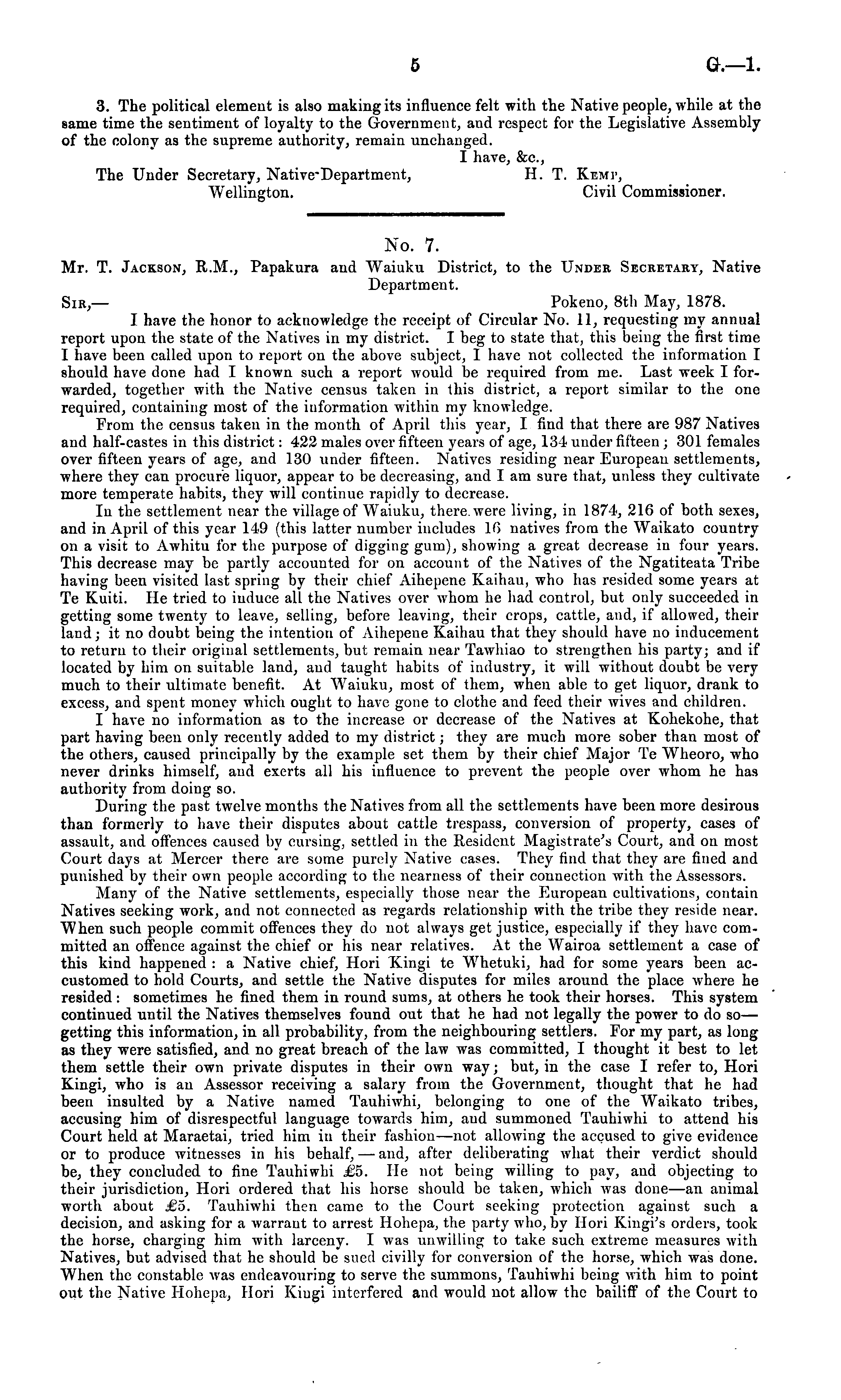 No. 7. Mr. T. Jackson, R.M., Papakura aud Waiuku District, to the Under Secretary, Native Department. Sir, — Pokeno, Bth May, 1878. I have the honor to acknowledge the receipt of Circular No. 11, requesting my annual report upon the state of the Natives in my district. I beg to state that, this being the first time I have been called upon to report on the above subject, I have not collected the information I should have done had I known such a report would be required from me. Last week I forwarded, together with the Native census taken in this district, a report similar to the one required, containing most of the information within my knowledge. From the census taken in the month of April this year, I find that there are 987 Natives aud half-castes in this district: 422 males over fifteen years of age, 184 under fifteen ; 301 females over fifteen years of age, and 130 under fifteen. Natives residing near European settlements, where they can procure liquor, appear to be decreasing, and I am sure that, unless they cultivate more temperate habits, they will continue rapidly to decrease. In the settlement near the village of Waiuku, there, were living, in 1874, 216 of both sexes, and in April of this year 149 (this latter number includes 16 natives from the Waikato country on a visit to Awhitu for the purpose of digging gum), showing a great decrease in four years. This decrease may be partly accounted for on account of the Natives of the Ngatiteata Tribe having been visited last spring by their chief Aihepene Kaihau, who has resided some years at Te Kuiti. He tried to induce all the Natives over whom he had control, but only succeeded in getting some twenty to leave, selling, before leaving, their crops, cattle, and, if allowed, their land; it no doubt being the intention of Aihepene Kaihau that they should have no inducement to return to their original settlements, but remain near Tawhiao to strengthen his party; and if located by him on suitable land, aud taught habits of industry, it will without doubt be very much to their ultimate benefit. At Waiuku, most of them, when able to get liquor, drank to excess, and spent money which ought to have gone to clothe and feed their wives and children. I have no information as to the increase or decrease of the Natives at Kohekohe, that part having been only recently added to my district; they are much more sober than most of the others, caused principally by the example set them by their chief Major Te Wheoro, who never drinks himself, and exerts all his influence to prevent the people over whom he has authority from doing so. During the past twelve months the Natives from all the settlements have been more desirous than formerly to have their disputes about cattle trespass, conversion of property, cases of assault, and offences caused by cursing, settled in the Resident Magistrate's Court, and on most Court days at Mercer there are some purely Native cases. They find that they are fined and punished by their own people according to the nearness of their connection with the Assessors. Many of the Native settlements, especially those near the European cultivations, contain Natives seeking work, and not connected as regards relationship with the tribe they reside near. When such people commit offences they do not always get justice, especially if they have committed an offence against the chief or his near relatives. At the Wairoa settlement a case of this kind happened : a Native chief, Hori TCingi te Whetuki, had for some years been accustomed to hold Courts, and settle the Native disputes for miles around the place where he resided : sometimes he fined them in round sums, at others he took their horses. This system continued until the Natives themselves found out that he had not legally the power to do so— getting this information, in all probability, from the neighbouring settlers. For my part, as long as they were satisfied, and no great breach of the law was committed, I thought it best to let them settle their own private disputes in their own way; but, in the case I refer to, Hori Kingi, who is an Assessor receiving a salary from the Government, thought that he had been insulted by a Native named Tauhiwhi, belonging to one of the Waikato tribes, accusing him of disrespectful language towards him, aud summoned Tauhiwhi to attend his Court held at Maraetai, tried him iv their fashion—not allowing the accused to give evidence or to produce witnesses in his behalf, — and, after deliberating what their verdict should be, they concluded to fine Tauhiwhi £o. He not being willing to pay, and objecting to their jurisdiction, Hori ordered that his horse should be taken, which was done—an animal worth about £5. Tauhiwhi then came to the Court seeking protection against such a decision, and asking for a warrant to arrest Ilohepa, the party who, by Hori Kingi's orders, took the horse, charging him with larceny. I was unwilling to take such extreme measures with Natives, but advised that he should be sued civilly for conversion of the horse, which was done. When the constable was endeavouring to serve the summons, Tauhiwhi being with him to point out the Native Hohepa, Hori Kiugi interfered and would not allow the bailiff of the Court to