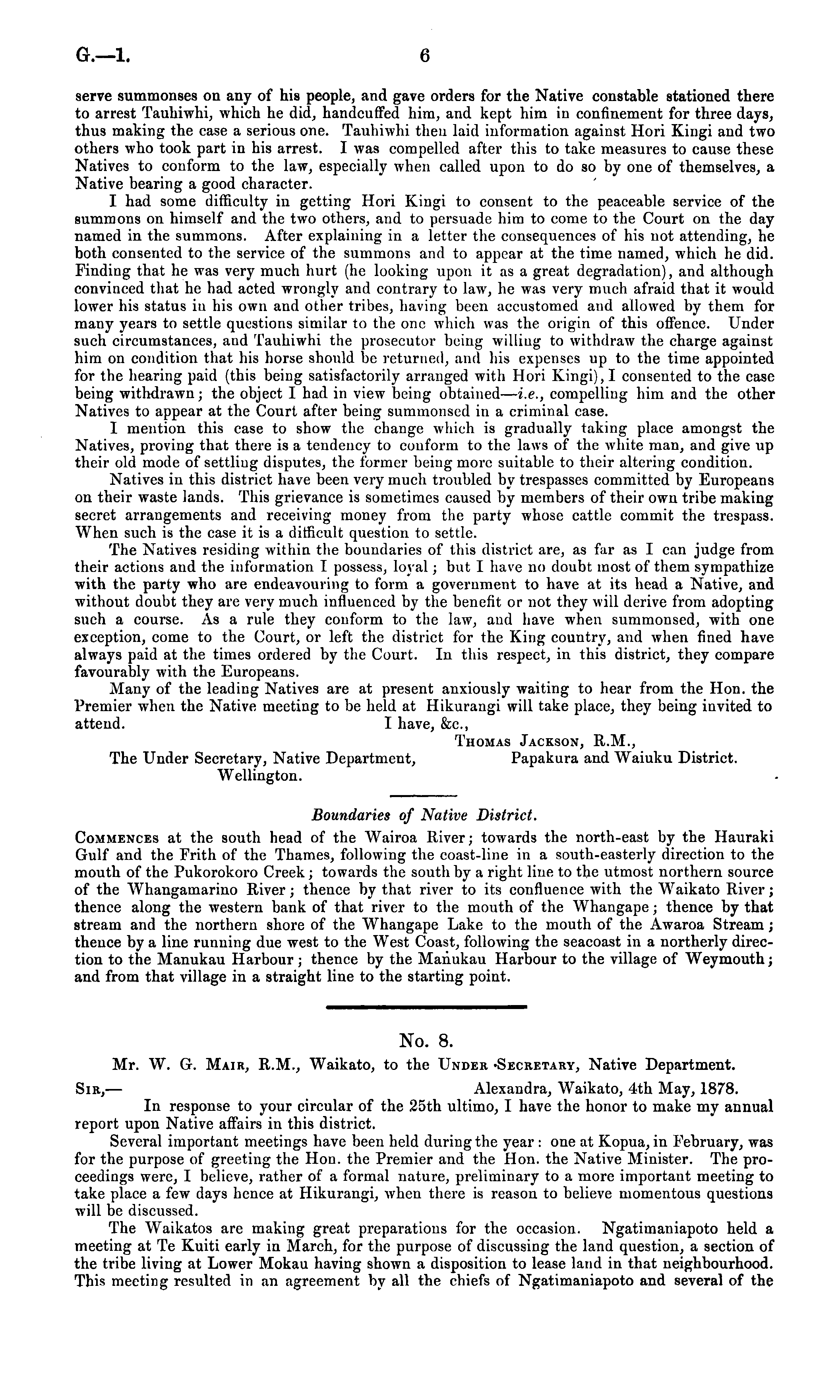 No. 8. Mr. W. G. Mair, R.M., Waikato, to the Under -Secretary, Native Department. Sir, — Alexandra, Waikato, 4th May, 1878. In response to your circular of the 25th ultimo, I have the honor to make my annual report upon Native affairs in this district. Several important meetings have been held during the year : one at Kopua, in February, was for the purpose of greeting the Hon. the Premier and the Hon. the Native Minister. The proceedings were, I believe, rather of a formal nature, preliminary to a more important meeting to take place a few days hence at Hikurangi, when there is reason to believe momentous questions will be discussed. The Waikatos are making great prepai-ations for the occasion. Ngatimaniapoto held a meeting at Te Kuiti early in March, for the purpose of discussing the land question, a section of the tribe living at Lower Mokau having shown a disposition to lease land in that neighbourhood. This meeting resulted in an agreement by all the chiefs of Ngatimaniapoto and several of the