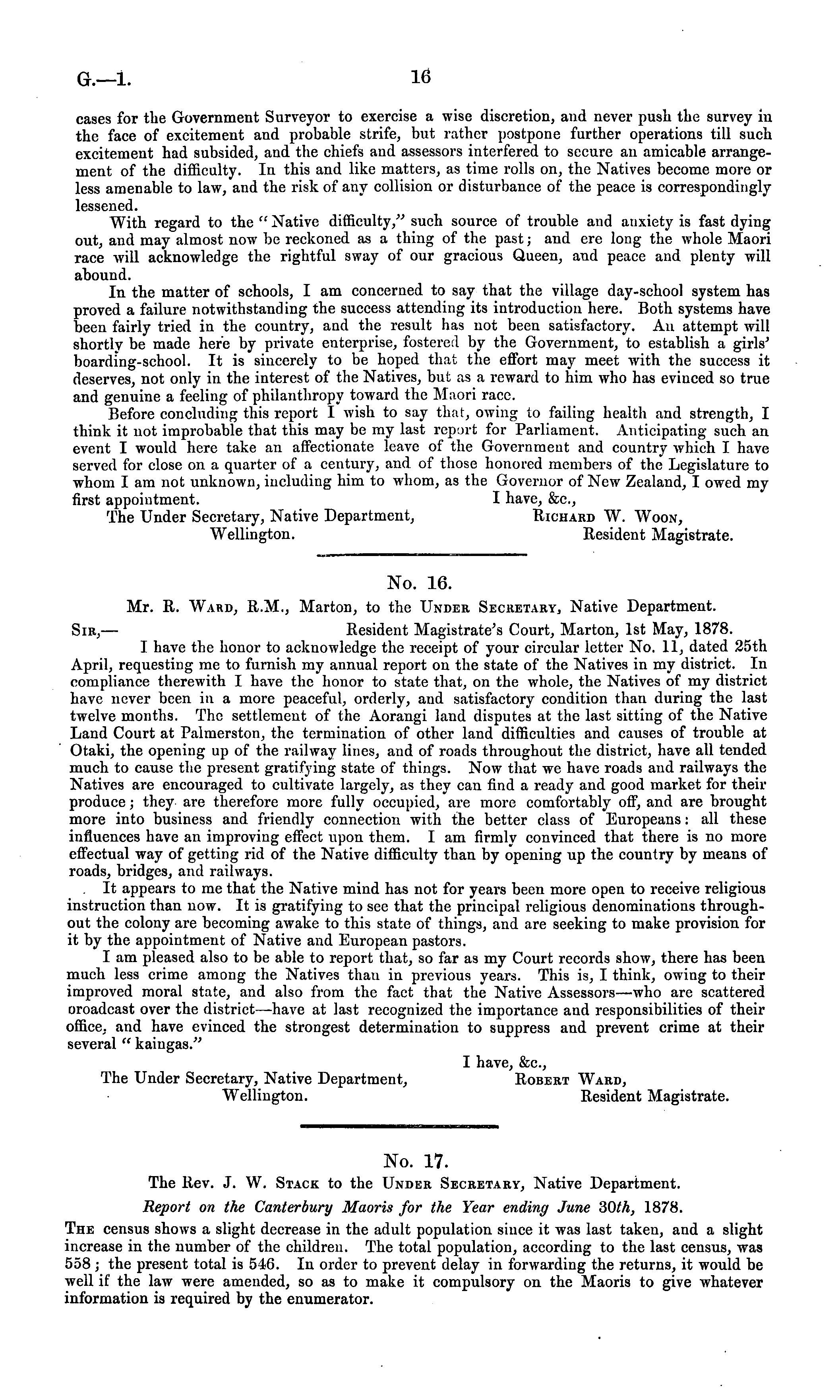 No. 16. Mr. R. Ward, R.M., Morton, to the Under Secretary, Native Department. Sir, — Resident Magistrate's Court, Marton, Ist May, 1878. I have the honor to acknowledge the receipt of your circular letter No. 11, dated 25th April, requesting me to furnish my annual report on the state of the Natives in my district. In compliance therewith I have the honor to state that, on the whole, the Natives of my district have never been in a more peaceful, orderly, and satisfactory condition than during the last twelve months. The settlement of the Aorangi land disputes at the last sitting of the Native Land Court at Palmerston, the termination of other land difficulties and causes of trouble at Otaki, the opening up of the railway lines, and of roads throughout the district, have all tended much to cause the present gratifying state of things. Now that we have roads and railways the Natives are encouraged to cultivate largely, as they can find a ready and good market for their produce; they are therefore more fully occupied, are more comfortably off, and are brought more into business and friendly connection with the better class of Europeans: all these influences have an improving effect upon them. I am firmly convinced that there is no more effectual way of getting rid of the Native difficulty than by opening up the country by means of roads, bridges, and railways. . It appears to me that the Native mind has not for years been more open to receive religious instruction than now. It is gratifying to see that the principal religious denominations throughout the colony are becoming awake to this state of things, and are seeking to make provision for it by the appointment of Native and European pastors. I am pleased also to be able to report that, so far as my Court records show, there has been much less crime among the Natives than in previous years. This is, I think, owing to their improved moral state, and also from the fact that the Native Assessors —who are scattered oroadcast over the district—have at last recognized the importance and responsibilities of their office, and have evinced the strongest determination to suppress and prevent crime at their several " kaingas." I have, &c, The Under Secretary, Native Department, Robert Ward, Wellington. Resident Magistrate.