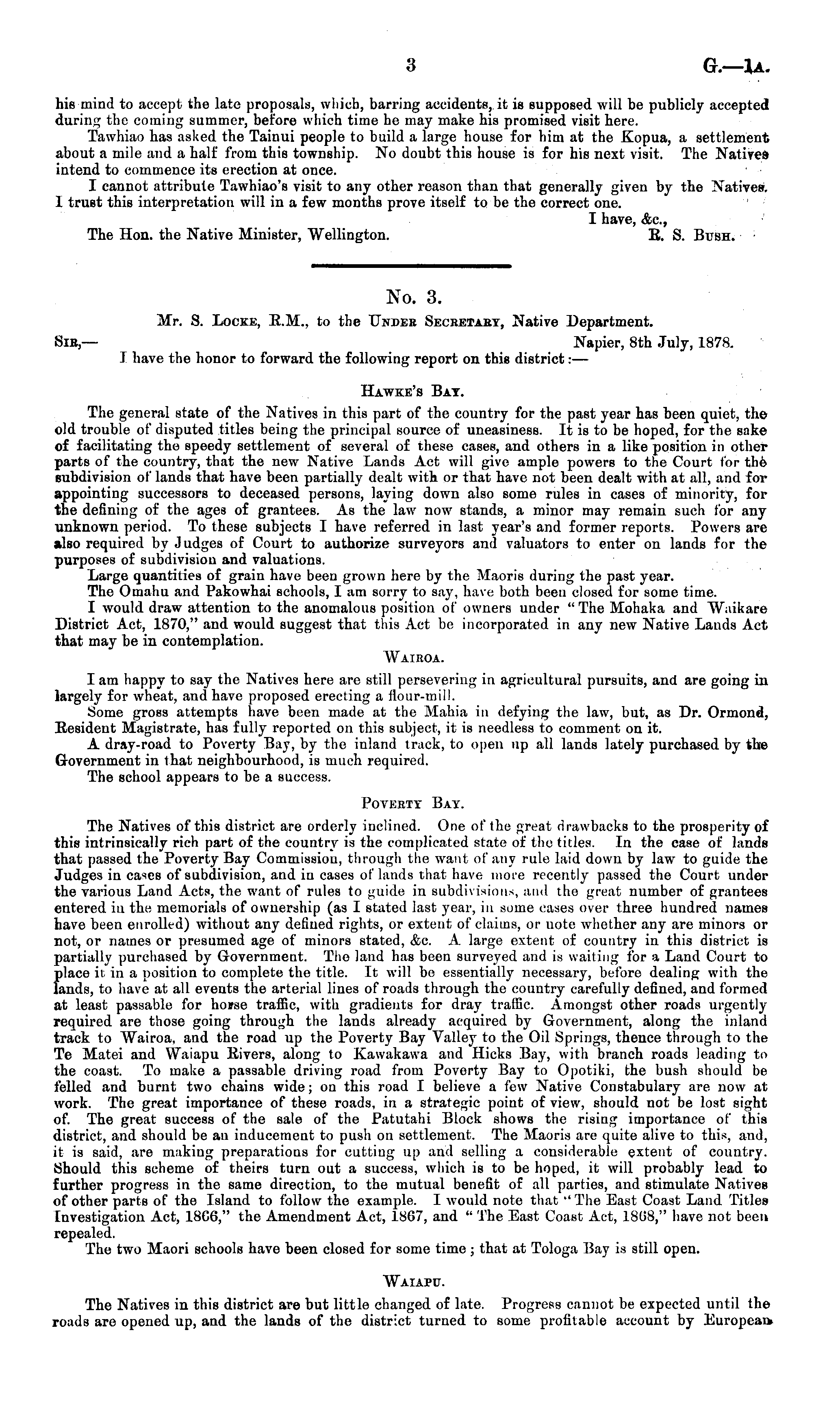 No. 3. Mr. S. Locke, E.M., to the TJndeb Secbetaby, Native Department. Sib,— Napier, Bth July, 1878. I have the honor to forward the following report on this district: — Hawke's Bat. The general state of the Natives in this part of the country for the past year has been quiet, the old trouble of disputed titles being the principal source of uneasiness. It is to be hoped, for the sake of facilitating the speedy settlement of several of these cases, and others in a like position in other parts of the country, that the new Native Lands Act will give ample powers to the Court for the subdivision of lands that have been partially dealt with or that have not been dealt with at all, and for appointing successors to deceased persons, laying down also some rules in cases of minority, for the defining of the ages of grantees. As the law now stands, a minor may remain such for any unknown period. To these subjects I have referred in last year's and former reports. Powers are also required by Judges of Court to authorize surveyors and valuators to enter on lands for the purposes of subdivision and valuations. Large quantities of grain have been grown here by the Maoris during the past year. The Omahu and Pakowhai schools, I am sorry to say, have both been closed for some time. I would draw attention to the anomalous position of owners under "The Mohaka and "Waikare District Act, 1870," and would suggest that this Act be incorporated in any new Native Lands Act that may be in contemplation. Waikoa. I am Happy to say the Natives here are still persevering in agricultural pursuits, and are going in largely for wheat, and have proposed erecting a flour-mill. Some gross attempts have been made at the Mahia in defying the law, but, as Dr. Ormond, Resident Magistrate, has fully reported on this subject, it is needless to comment on it. A dray-road to Poverty Bay, by the inland track, to open up all lands lately purchased by the Government in that neighbourhood, is much required. The school appears to be a success. Poteetx Bay. The Natives of this district are orderly inclined. One of the great drawbacks to the prosperity of this intrinsically rich part of the country is the complicated state of the titles. In the case of lands that passed the Poverty Bay Commission, through the want of any rule laid down by law to guide the Judges in cases of subdivision, and in cases of lands that have more recently passed the Court under the various Land Acts, the want of rules to guide in subdivisions, and the great number of grantees entered in the memorials of ownership (as I stated last year, in some cases over three hundred names have been enrolled) without any defined rights, or extent of claims, or note whether any are minors or not, or names or presumed age of minors stated, &c. A large extent of country in this district is partially purchased by Government. The land has been surveyed and is waiting for a Land Court to place it in a position to complete the title. It will be essentially necessary, before dealing with the lands, to have at all events the arterial lines of roads through the country carefully defined, and formed at least passable for horse traffic, with gradients for dray traffic. Amongst other roads urgently required are those going through the lands already acquired by Government, along the inland track to Wairoa, and the road up the Poverty Bay Valley to the Oil Springs, thence through to the Te Matei and Waiapu Rivers, along to Kawakawa and Hicks Bay, with branch roads leading to the coast. To make a passable driving road from Poverty Bay to Opotiki, the bush should be felled and burnt two chains wide; on this road I believe a few Native Constabulary are now at work. The great importance of these roads, in a strategic point of view, should not be lost sight of. The great success of the sale of the Patutahi Block shows the rising importance of this district, and should be an inducement to push on settlement. The Maoris are quite alive to this, and, it is said, are making preparations for cutting up and selling a considerable extent of country. Should this scheme of theirs turn out a success, which is to be hoped, it will probably lead to further progress in the same direction, to the mutual benefit of all parties, and stimulate Natives of other parts of the Island to follow the example. I would note that " The East Coast Land Titles Investigation Act, 18G6," the Amendment Act, 1867, and " The East Coast Act, 18(58," have not been repealed. The two Maori schools have been closed for some time ; that at Tologa Bay is still open. Waiapu. The Natives in this district are but little changed of late. Progress cannot be expected until the roads are opened up, and the lands of the district turned to some profitable account by Europeani