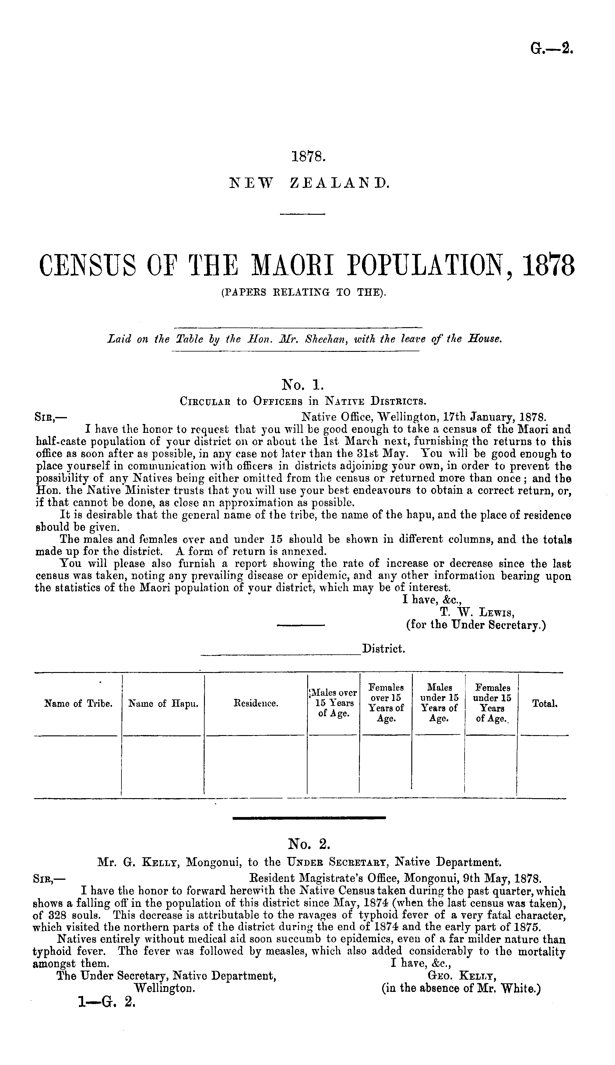 No. 1. Cibcexah to Officees in Native Districts. Sie,— Native Office, Wellington, 17th January, 1878. I have the honor to request that you will be good enough to take a census of the Maori and lialf-caste population of your district on or about the 1st March nest, furnishing the returns to this office as soon after as possible, in any case not later than the 31st May. You will be good enough to place yourself in communication with officers in districts adjoining your own, in order to prevent the possibility of any Natives being either omitted from the census or returned more than once ; and the Hon. the Native Minister trusts that you will use your best endeavours to obtain a correct return, or, if that cannot be done, as close an approximation as possible. It is desirable that the general name of the tribe, the name of the hapu, and the place of residence should be given. The males and females over and under 15 should be shown in different columns, and the totals made up for the district. A form of return is annexed. Tou will please also furnish a report showing the rate of increase or decrease since the last census was taken, noting any prevailing disease or epidemic, and any other information bearing upon the statistics of the Maori population of your district, which may be of interest. I have, &c, T. W. Lewis, (for the Under Secretary.)