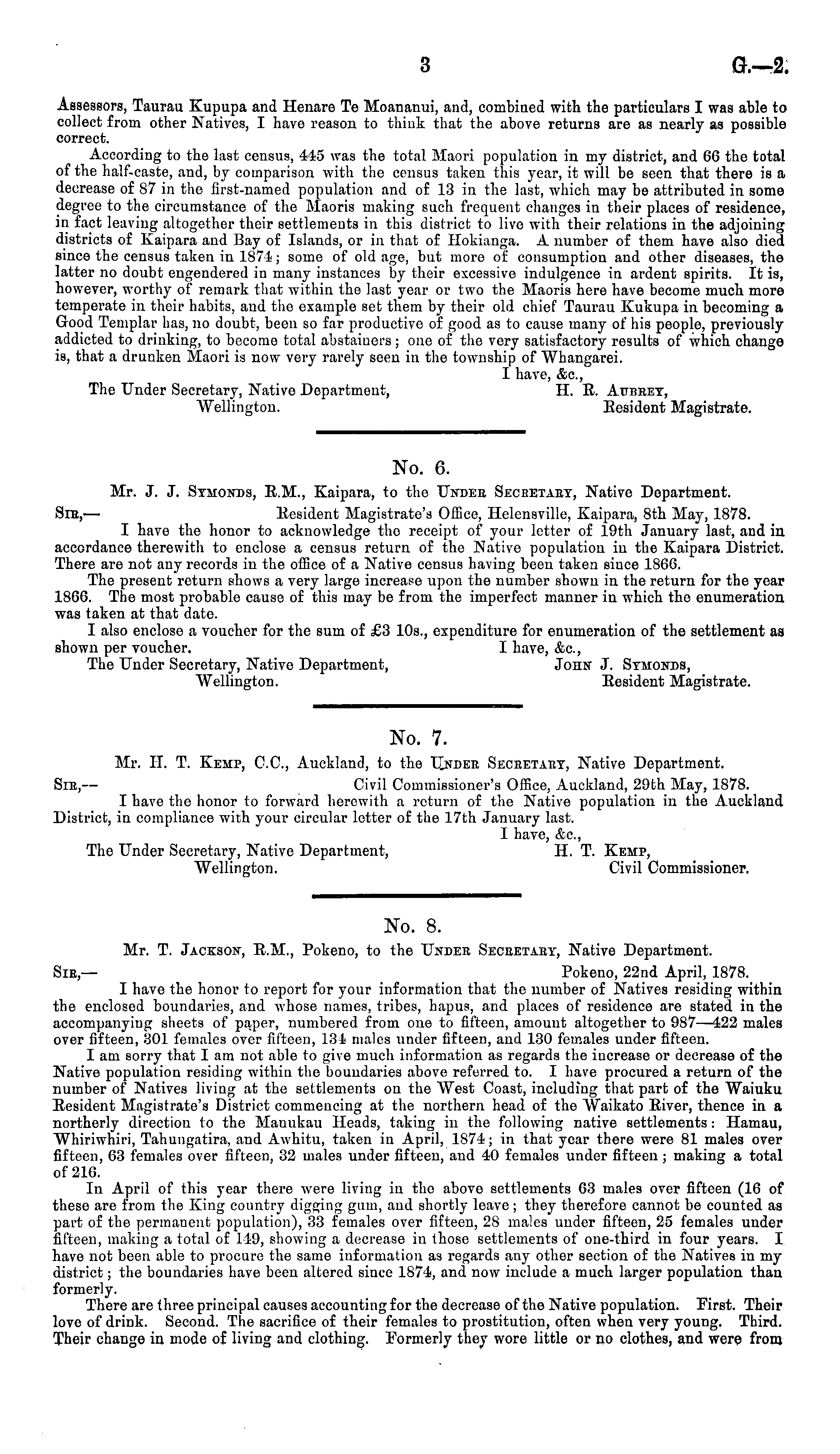 No. 8. Mr. T. Jackson, E.M., Pokeno, to the Under Secretary, Native Department. Sib,— Pokeno, 22 nd April, 1878. I have the honor to report for your information that the number of Natives residing within the enclosed boundai-ies, and whose names, tribes, hapus, and places of residence are stated in the accompanying sheets of pa.per, numbered from one to fifteen, amount altogether to 987 —422 males over fifteen, 801 females over fifteen, 131 males under fifteen, and 130 females under fifteen. I am sorry that I am not able to give much information as regards the increase or decrease of the Native population residing within the boundaries above referred to. I have procured a return of the number of Natives Jiving at the settlements on the West Coast, including that part of the Waiuku Resident Magistrate's District commencing at the northern head of the Waikato River, thence in a northerly direction to the Manukau Heads, taking in the following native settlements : Hamau, Whiriwhiri, Tahungatira, and Awhitu, taken in April, 1874; in that year there were 81 males over fifteen, G3 females over fifteen, 32 males under fifteen, and 40 females under fifteen ; making a total of 216. In April of this year there were living in the above settlements G3 males over fifteen (16 of these are from the King country digging gum, and shortly leave; they therefore cannot be counted as part of the permanent population), 33 females over fifteen, 28 males under fifteen, 25 females under fifteen, making a total of 149, showing a decrease in those settlements of one-third in four years. I have not been able to procure the same information as regards any other section of the Natives in my district; the boundaries have been altered since 187-4, and now include a much larger population than formerly. There are three principal causes accounting for the decrease of the Native population. First. Their love of drink. Second. The sacrifice of their females to prostitution, often when very young. Third. Their change in mode of living and clothing. Formerly they wore little or no clothes, and were from
