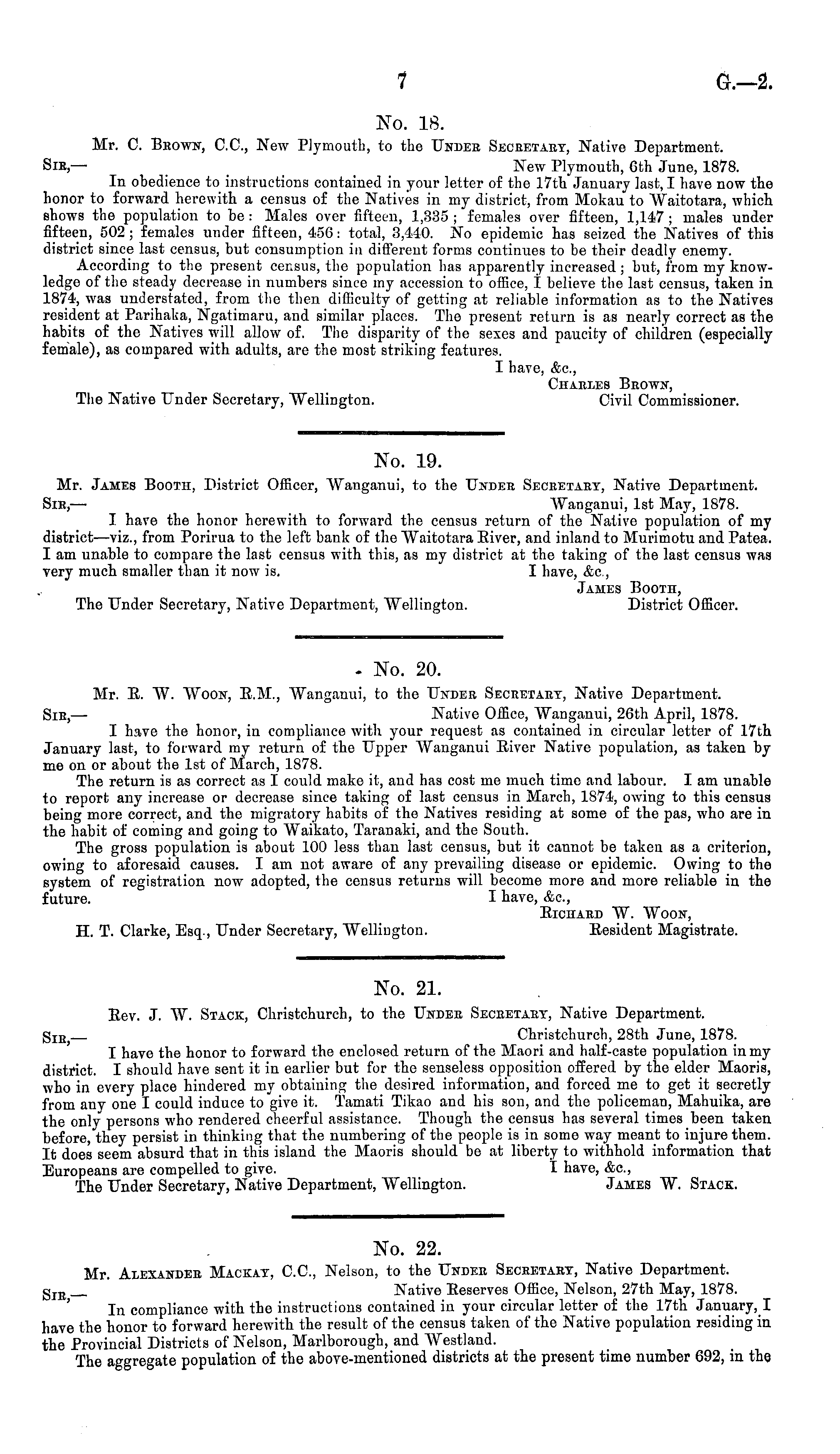 - No. 20. Mr. E. "W. Woon, E.M., Wanganui, to the Under Secretary, Native Department. Sir,— Native Office, Wanganui, 26th April, 1878. I have the honor, in compliance with your request as contained in circular letter of 17th January last, to forward my return of the Upper Wanganui Eiver Native population, as taken by me on or about the Ist of March, 1878. The return is as correct as I could make it, and has cost me much time and labour. lam unable to report any increase or decrease since taking of last census in March, 1874, owing to this census being more correct, and the migratory habits of the Natives residing at some of the pas, who are in the habit of coming and going to Waikato, Taranaki, and the South. The gross population is about 100 less than last census, but it cannot be taken as a criterion, owing to aforesaid causes. I am not aware of any prevailing disease or epidemic. Owing to the system of registration now adopted, the census returns will become more and more reliable in the future. I have, &c, BICHARD W. WOON, H. T. Clarke, Esq., Under Secretary, Wellington. Eesident Magistrate.