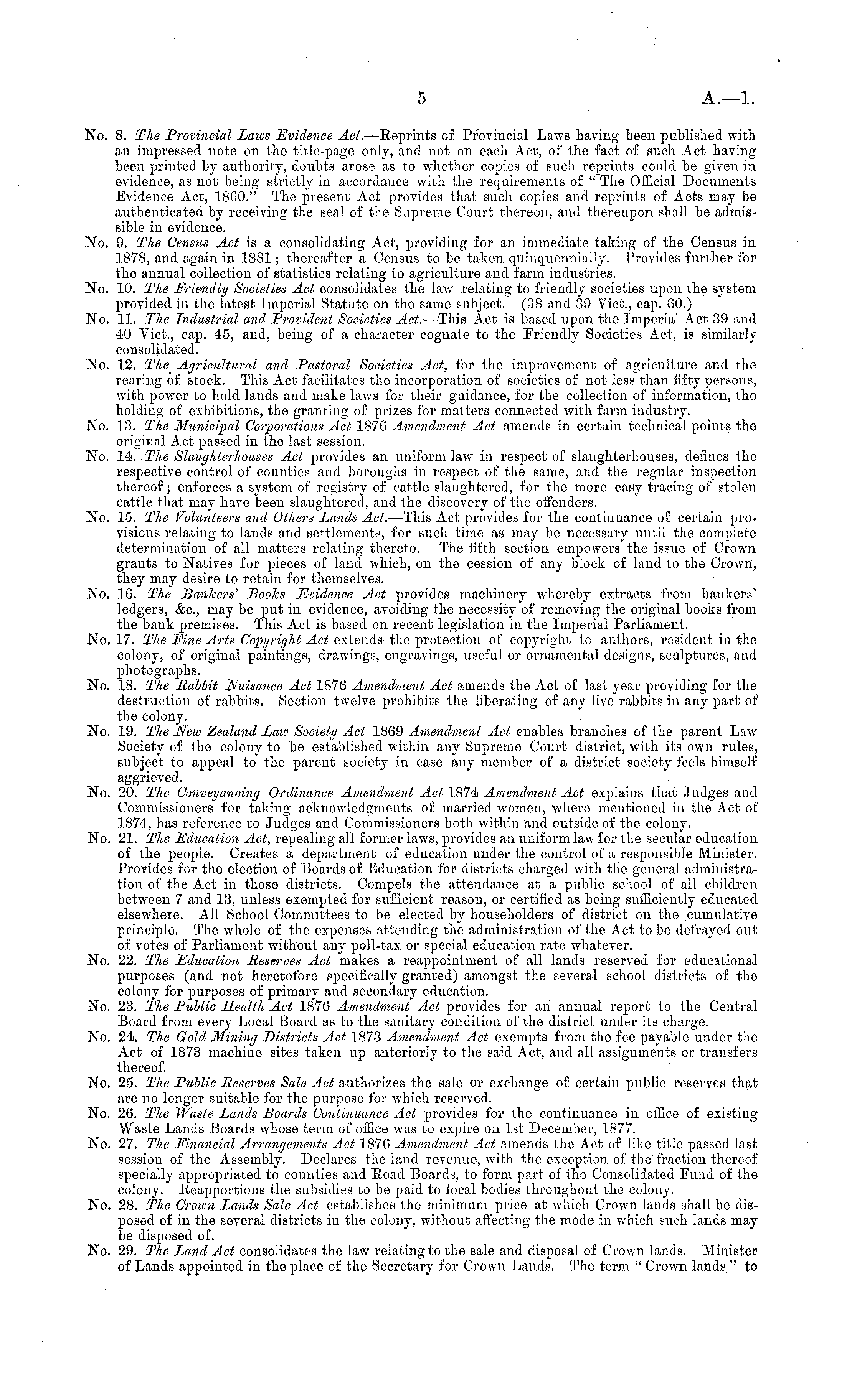 No. 8. The Provincial Laws Evidence Act. —Reprints of Provincial Laws having been published with an impressed note on the title-page only, and not on each Act, of the fact of such Act having been printed by authority, doubts arose as to whether copies of such reprints could be given in evidence, as not being strictly in accordance with the requirements of " The Official Documents Evidence Act, 1860." The present Act provides that such copies and reprints of Acts may be authenticated by receiving the seal of the Supreme Court thereon, and thereupon shall be admissible in evidence. No. 9. The Census Act is a consolidating Act, providing for an immediate taking of the Census in 1878, and again in 1881; thereafter a Census to be taken quinquennially. Provides further for the annual collection of statistics relating to agriculture and farm industries. No. 10. The Friendly Societies Act consolidates the law relating to friendly societies upon the system provided in the latest Imperial Statute on the same subject. (38 and 39 Vict;., cap. 60.) No. 11. The Industrial and Provident Societies Act.- —This Act is based upon the Imperial Act 39 and 40 Vict., cap. 45, and, being of a character cognate to the Friendly Societies Act, is similarly consolidated. No. 12. The Agricultural and Pastoral Societies Act, for the improvement of agriculture and the rearing of stock. This Act facilitates the incorporation of societies of not less than fifty persons, with power to hold lands and make laws for their guidance, for the collection of information, the holding of exhibitions, the granting of prizes for matters connected with farm industry. No. 13. The Municipal Corporations Act 1876 Amendment Act amends in certain technical points the original Act passed in the last session. No. 14. The Slaughterhouses Act provides an uniform law in respect of slaughterhouses, defines the respective control of counties and boroughs in respect of the same, and the regular inspection thereof; enforces a system of registry of cattle slaughtered, for the more easy tracing of stolen cattle that may have been slaughtered, and the discovery of the offenders. No. 15. The Volunteers and Others Lands Act. —This Act provides for the continuance of certain pro. visions relating to lands and settlements, for such time as may be necessary until the complete determination of all matters relating thereto. The fifth section empowers the issue of Crown grants to Natives for pieces of land which, on the cession of any block of land to the Crown, they may desire to retain for themselves. No. 16. The Bankers' Books Evidence Act provides machinery whereby extracts from bankers' ledgers, &c, may be put in evidence, avoiding the necessity of removing the original books from the bank premises. This Act is based on recent legislation in the Imperial Parliament. No. 17. The Fine Arts Copyright Act extends the protection of copyright to authors, resident in the colony, of original paintings, drawings, engravings, useful or ornamental designs, sculptures, and photographs. No. 18. The Babbit Nuisance Act 1876 Amendment Act amends the Act of last year providing for the destruction of rabbits. Section twelve prohibits the liberating of any live rabbits in any part of the colony. No. 19. The New Zealand Law Society Act 1869 Amendment Act enables branches of the parent Law Society of the colony to be established within any Supreme Court district, with its own rules, subject to appeal to the parent society in case any member of a district society feels himself aggrieved. No. 20. The Conveyancing Ordinance Amendment Act 1874 Amendment Act explains that Judges and Commissioners for taking acknowledgments of married women, where mentioned in the Act of 1874, has reference to Judges and Commissioners both within and outside of the colon}'. No. 21. The Education Act, repealing all former laws, provides an uniform law for the secular education of the people. Creates a department of education under the control of a responsible Minister. Provides for the election of Boards of Education for districts charged with the general administration of the Act in those districts. Compels the attendance at a public school of all children between 7 and 13, unless exempted for sufficient reason, or certified as being sufficiently educated elsewhere. All School Committees to be elected by householders of district on the cumulative principle. The whole of the expenses attending the administration of the Act to be defrayed out of votes of Parliament without any poll-tax or special education rate whatever. No. 22. The Education Beserves Act makes a reappointment of all lands reserved for educational purposes (and not heretofore specifically granted) amongst the several school districts of the colony for purposes of primary and secondary education. No. 23. The Public Health Act 1876 Amendment Act provides for an annual report to the Central Board from every Local Board as to the sanitary condition of the district under its charge. No. 24. The Gold Mining Districts Act 1873 Amendment Act exempts from the fee payable under the Act of 1873 machine sites taken up anteriorly to the said Act, and all assignments or transfers thereof. No. 25. The Public Beserves Sale Act authorizes the sale or exchange of certain public reserves that are no longer suitable for the purpose for which reserved. No. 26. The Waste Lands Boards Continuance Act provides for the continuance in office of existing Waste Lands Boards whose term of office was to expire on Ist December, 1877. No. 27. The Financial Arrangements Act 1876 Amendment Act amends the Act of like title passed last session of the Assembly. Declares the land revenue, with the exception of the fraction thereof specially appropriated to counties and Road Boards, to form part of the Consolidated Bund of the colony. Reapportions the subsidies to be paid to local bodies throughout the colony. No. 28. The Crown Lands Sale Act establishes the mini