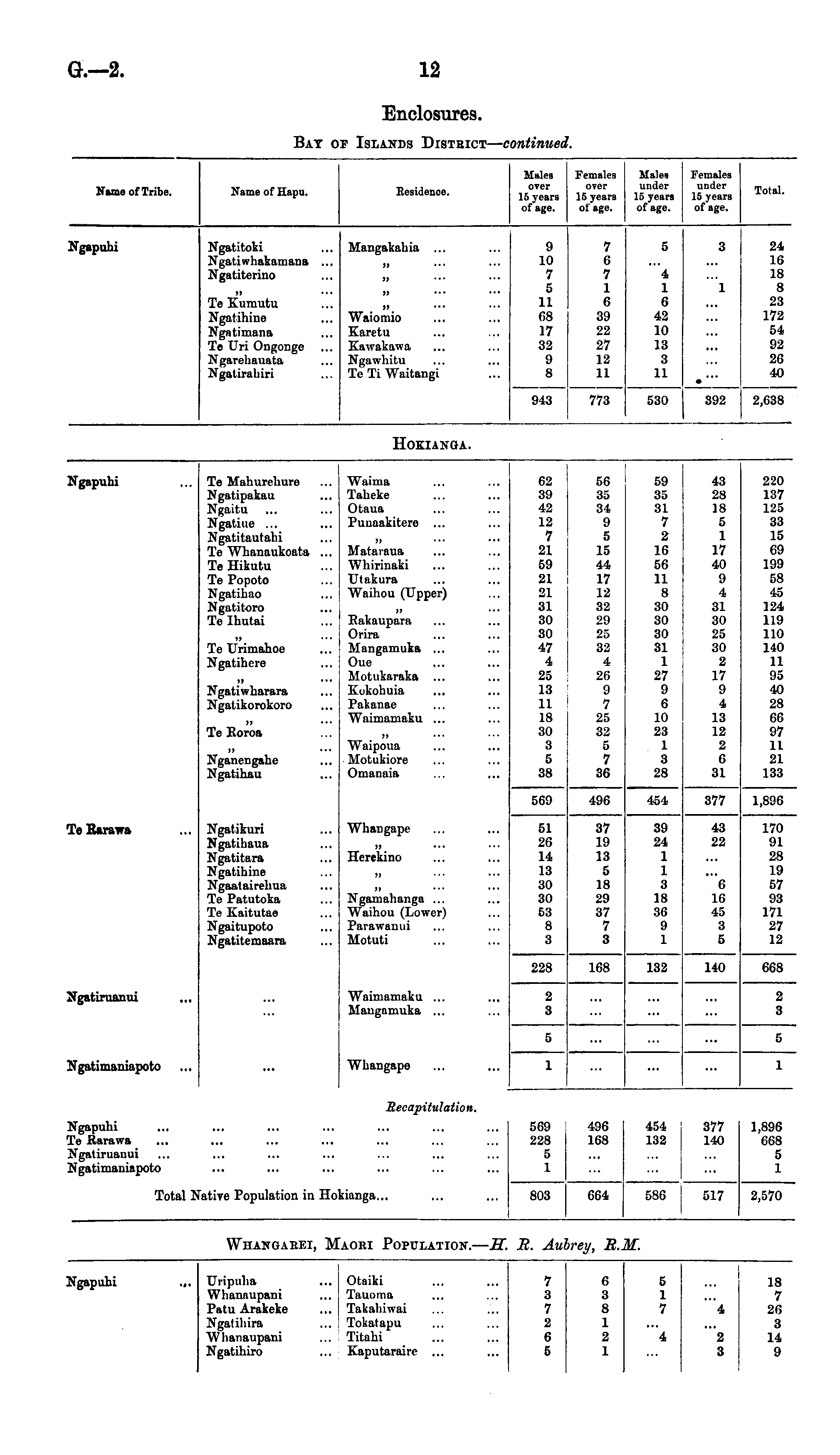 Enclosures. Bat if Islands District — continues Name of Tribe. Name of Hapu. Hesidence. Males over 15 years of age. Females over 15 years of age. Males under 15 years of age. Females under 15 years of age. Total. Ngapuhi Ngatitoki Ngatiwhakamana ... Ngatiterino Mangakahia ... 9 10 7 5 11 68 17 32 9 8 7 6 7 1 6 39 22 27 12 11 5 3 24 16 18 8 23 172 54 92 26 40 Te Kumutu Ngatihine Ngatimana Te Uri Ongonge Ngarehauata Ngatirahiri )> i) )> ii Waiomio Karetu Kawakawa Ngawhitu Te Ti Waitangi 4 1 6 42 10 13 3 11 1 • ! 943 773 530 392 2,638 Hokianga. Ngapuhi Ngapuhi ... Te Mahurelmre ... Waima Ngatipakau ... | Taheke Ngaitu ... ... Otaua Ngatiuc ... ... Puuaakitere ... Ngatitautahi ... ,, Te Whanaukoata ... Jfataraua Te Hikutu ... Whirinaki Te Popoto ... Utakura Ngatihao ... Waihou (Upper) Ngatitoro ... „ Te Ihutai ... Bakaupara „ ... Orira Te Urimahoe ... Mangamuka ... Ngatihere ... I Oue ,, ... Motukaraka ... Ngatiwharara ... Kokohuia Ngalikorokoro ... Pakanae ,, ... Waimamaku ... TeEoroa ... „ ,, ... Waipoua Nganengahe ... Motukiore Ngatihau ... Omanaia 63 39 42 12 7 21 69 21 21 81 80 80 47 4 25 18 11 18 3(1 3 5 88 56 35 34 9 5 IE M 17 12 32 29 2,-, 32 4 26 9 7 :J2 5 7 36 59 35 81 7 2 16 66 11 8 80 80 80 81 1 ■n 9 6 l(i 28 1 3 28 18 28 IS 5 1 17 40 9 4 31 80 25 30 2 17 9 4 18 IS 2 6 81 220 137 125 33 15 69 199 58 45 124 119 110 140 11 95 40 28 66 97 11 21 133 569 496 454 377 1,896 TeEarawa ... Ngalikuri ... Whangape Ngatihaua ... „ Ngatitara ... Herekino Ngatibine ... „ Ngaatairehua ... ,, To Patutoka ... If ganmhanga ... Te Kaitutae ... Waihou (Lower) Ngaitupoto ... Parawanui Ngatitemaara ... Motuti 'e Barawa 61 86 11 13 80 30 53 8 3 .37 19 18 5 18 29 87 7 a 3!) 21 1 1 3 18 86 9 1 43 22 6 16 45 3 5 170 91 28 19 57 93 171 27 12 228 168 132 140 668 Ifgatiruanui ... ... Waimamaku ... Maugamuka ... i 8 2 3 Ngatimaniapoto ... ... Whangape Recapitulation. Ngapuhi Te Rarawa Ngaliruanui Ngatimaaiapoto 569 228 5 1 496 168 454 132 377 140 1,896 668 5 1 Total Native Population in Hokianga... 803 664 586 517 2,570 Wiiahoaeei, Maori Population.— H. It. Au< >rei/, B.M. fgapuhi Uripulia Whanaupani Patu Arakeke Ngatiliira Wlianaupani Ngatihiro ... Otaiki ... Tauomo ... | Takaliiwai ... ! Tokatapu ... Titaki Kaputaraire ... 7 8 7 2 6 5 6 8 8 1 2 1 5 1 7 "4 2 3 18 7 26 3 14 9 4
