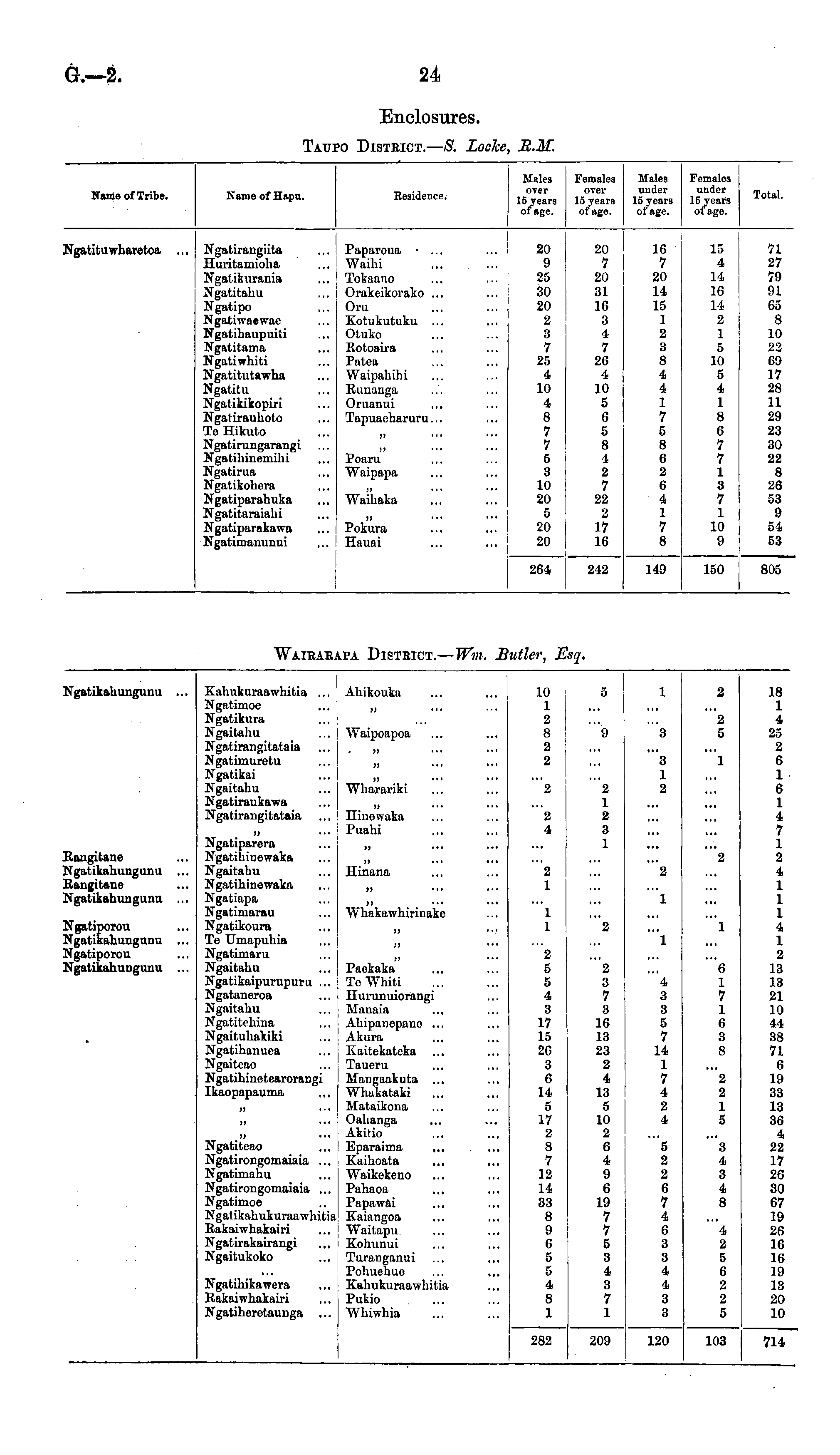 Name of Tribe. Kamo of llapu. Residence. Males over 15 years of ago. Females over 16 years of age. Males under 15 years of age. Females under 15 years of age. Total. Fgatituwharetoa Ngatirangiita Huritamioha Ngalikurania Ngatitahu Ngatipo Ngatiwaewae Ngatihaupuiti Ngatitama Ngatiwhiti Ngatitut»wha Ngatitu Ngatikikopiri Ngatirauholo Te Ilikuto Ngatiruugarangi Ngatihinemihi Ngatirua Ngatikohcra Ngatiparahuka Ngatitaraiahi Ngatiparakawa Ngatimanunui Paparoua • ... Waihi Tokaano Orakcikorako ... Oru Kotukutuku ... Otuko Rotoaira Patea Waipahihi Runanga Oruanui Tapuaeharuru... 80 9 25 30 20 2 3 7 SB 4 10 4 8 7 7 5 3 10 20 5 20 20 20 7 80 81 16 3 4 7 26 4 10 5 6 5 8 4 a 7 2-2 2 17 16 16 7 80 U 15 1 2 3 8 4 4 1 7 5 8 6 2 6 4 1 7 B 15 4 14 16 1 I 2 1 5 10 5 4 1 8 6 7 7 1 3 1 1 10 9 11 27 79 91 C5 8 10 22 69 17 28 ]] 29 2:! 30 22 8 20 58 9 54 f.:s j> ... Ponru Waipapa Waihaka ji ... Pokura Hauai 264 242 149 150 805 "Waibabapa Distbict.— Win. 'utler, ,sq. fgatikahungunu ... Kahukuraawhitia ... j Ngatimoe Ngatikura ... i Ngaitahu ... j Ngatirangitataia ... Ngatimuretu ...I Ngatikai ... Ngaitahu ... Ngatiraukawa ... Ngatirangitat&ia ... Ahikouka 10 1 2 8 2 2 5 1 2 18 1 4 25 2 6 1 6 1 4 7 1 2 4 1 1 1 4 1 2 13 13 21 10 44 38 71 6 19 33 13 36 4 22 17 26 30 67 19 26 16 16 19 13 20 10 » ... 2 5 Waipoapoa "9 3 j) ... j, 3 1 2 ' 1 Wharai'iki »j ... Hinewaka Puahi 2 "2 4 2 1 2 3 1 langitane 'gatikahungunu langitane igatikahungunu jj "* Ngatiparera ... i Ngatihinewaka ... i Ngaitahu ... I Ngatihinewaka Ngatiapa Ngatimarau Ngatikoura To TJmnpubia ... Ngatimaru ... j Ngaitahu ... Ngatikaipurupuru ... | Ngataneroa ... i Ngaitahu Ngatitchina ... I Ngaituhakiki ... Ngatihanuca Ngaiteao Ngatihinetearorangi Ikaopnpauma j> ... it ... Ilinana 2 1 2 "2 jj ... "l Fgatiporou 'gatikahungunu gatiporou rgatikahungunu 11 ... Whakawhirinake "l 1 "2 1 n 2 5 5 4 3 17 15 2G 3 6 14 5 17 2 8 7 12 14 33 8 9 6 5 5 4 8 1 1 >} " Ngatiteao ... j Ngatirongomaiaia ... Ngatimahu ... ! Ngatirongomaiaia ... Ngatimoe Ngatikahukuraawhitia Rakaiwhakairi ... j Ngatirakairangi ... I Ngaitukoko ... Paekaka TeWhiti Uurunuiorangi Mnnaia Ahipanepane ... Akura Kaitekateka Taueru Mangaakuta ... Whakataki Mataikona Oahanga Akitio Eparairna Kaihoata Waikekeno Pahaoa Papawai Kaiiingoa Waitapu Kolmnui Turangauui Pohueliue Kahukuraawhitia Pukio Whiwhia 2 3 7 3 16 13 23 2 4 13 5 10 2 6 4 0 6 19 7 7 5 3 4 3 7 1 4 3 3 5 7 14 1 7 4 2 4 5 2 2 6 7 4 6 3 3 4 4 3 3 6 1 7 1 6 3 8 2 2 1 5 3 4 3 4 8 4 2 5 6 2 2 5 Ngatihikawera Eakaiwhakairi ... Ngatiheretaunga ... | 282 209 120 103 714