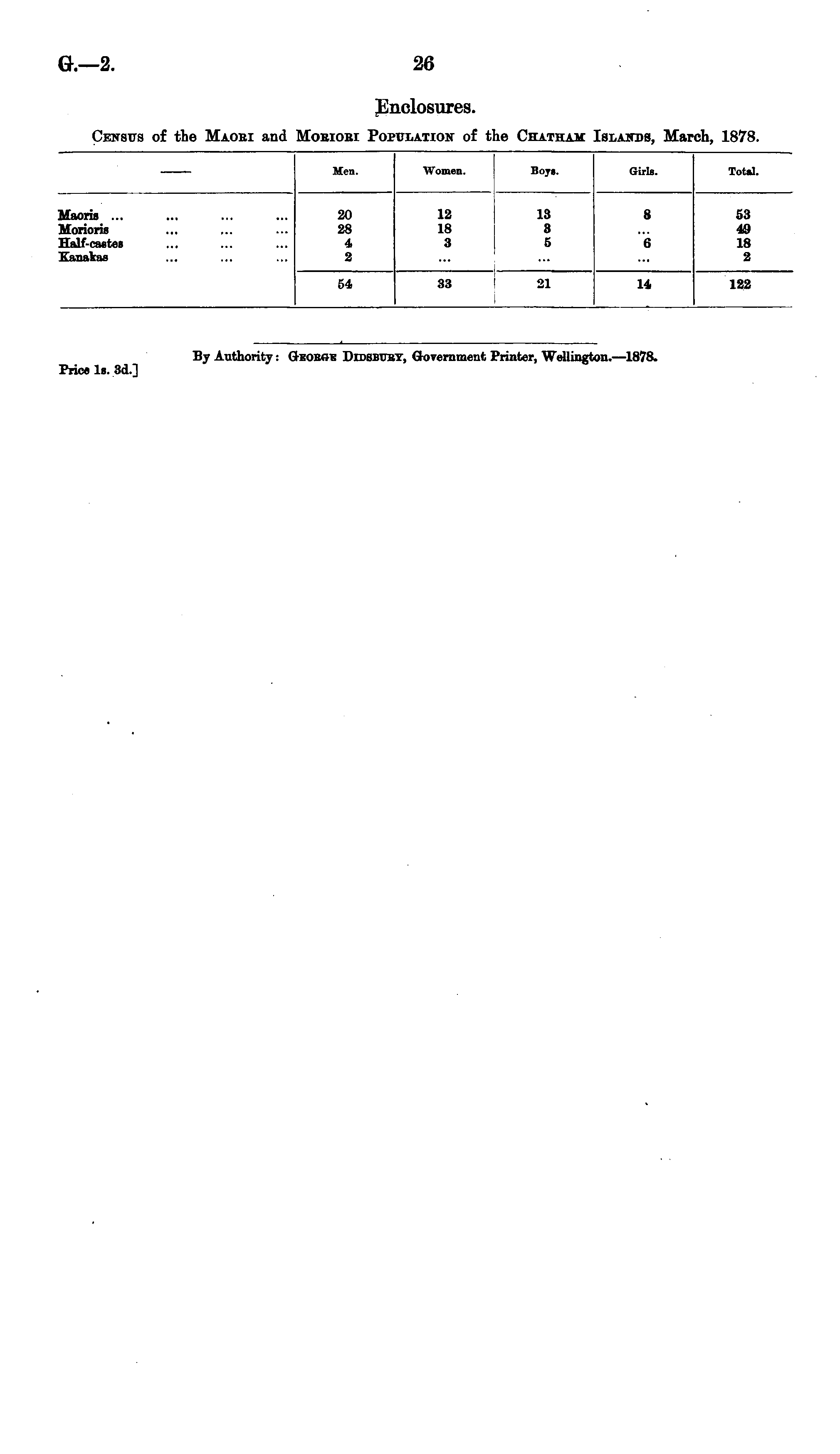 Enclosures. CENSUS of the MAORI and MORIORI POPULATION of the CHATHAM ISLANDS, March, 1878.