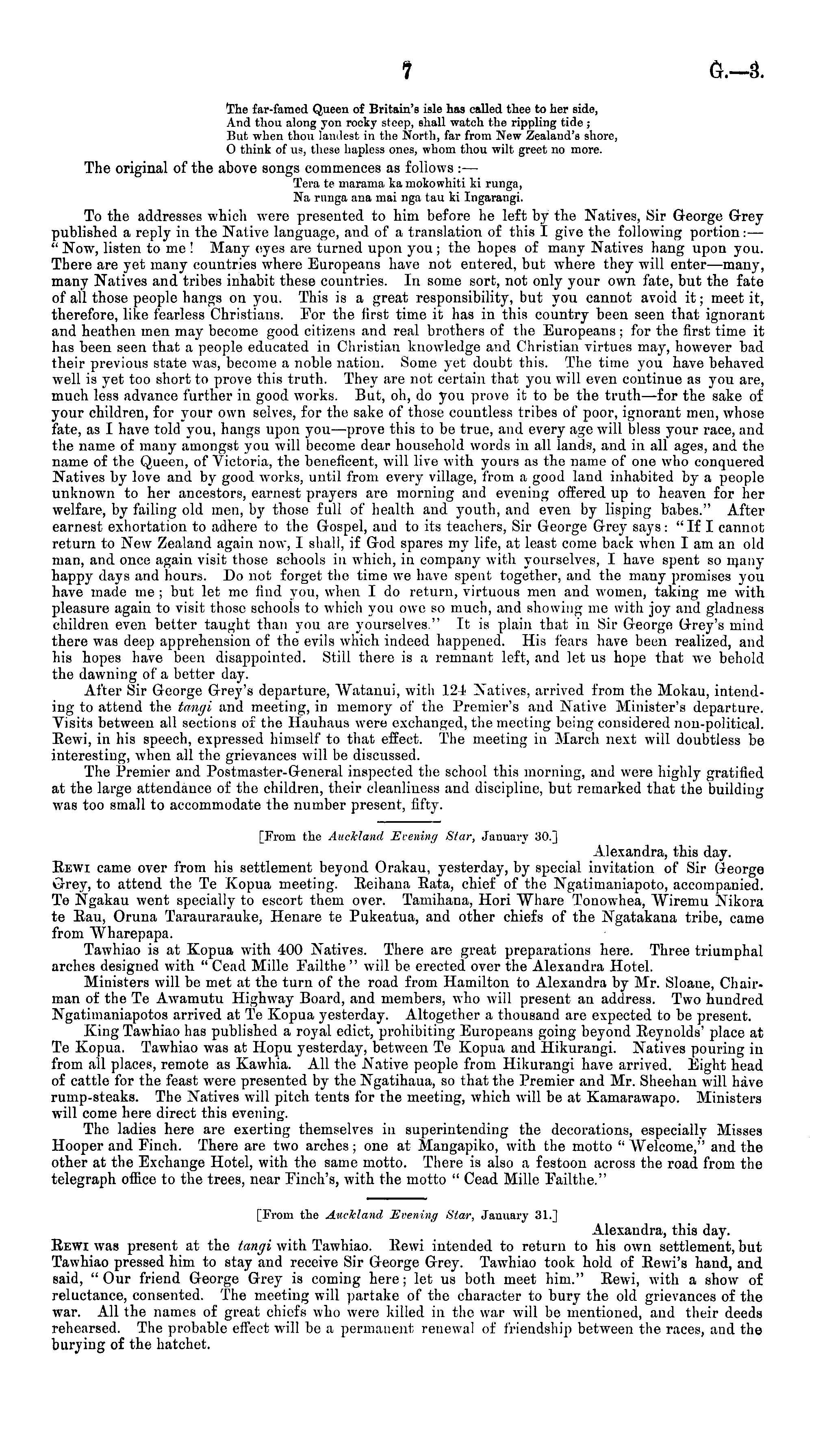 The far-famed Queen of Britain's isle has called thee to her side, And thou along yon rocky steep, shall watch the rippling tide ; But when thou landest in the North, far from New Zealand's shore, O think of us, these hapless ones, whom thou wilt greet no more. The original of the above songs commences as follows : — Tera te marama ka mokowhiti ki runga, Na rtmga ana mai nga tau ki Ingarangi. To the addresses which were presented to him before he left by the Natives, Sir George Greypublished a reply in the Native language, and of a translation of this I give the following portion:— Now, listen to me ! Many eyes are turned upon you; the hopes of many Natives hang upon you. There are yet many countries where Europeans have not entered, but where they will enter —many, many Natives and tribes inhabit these countries. In some sort, not only your own fate, but the fate of all those people hangs on you. This is a great responsibility, but you cannot avoid it; meet it, therefore, like fearless Christians. For the first time it has in this country been seen that ignorant and heathen men may become good citizens and real brothers of the Europeans; for the first time it has been seen that a people educated in Christian knowledge and Christian virtues may, however bad their previous state was, become a noble nation. Some yet doubt this. The time you have behaved well is yet too short to prove this truth. They are not certain that you will even continue as you are, much less advance further in good works. But, oh, do you prove it to be the truth—for the sake of your children, for your own selves, for the sake of those countless tribes of poor, ignorant men, whose fate, as I have told you, hangs upon you —prove this to be true, and every age will bless your race, and the name of many amongst you will become dear household words in all lands, and in all ages, and the name of the Queen, of Victoria, the beneficent, will live with yours as the name of one who conquered Natives by love and by good works, until from every village, from a good land inhabited by a people unknown to her ancestors, earnest prayers are morning and evening offered up to heaven for her welfare, by failing old men, by those full of health and youth, and even by lisping babes." After earnest exhortation to adhere to the Gospel, and to its teachers, Sir George Grey says: "If I cannot return to New Zealand again now, I shall, if God spares my life, at least come back when I am an old man, and once again visit those schools in which, in company with yourselves, I have spent so many happy days and hours. Do not forget the time we have spent together, and the many promises you have made me ; but let me find you, when I do return, virtuous men and women, taking me with pleasure again to visit those schools to which you owe so much, and showing me with joy and gladness children even better taught than you are yourselves." It is plain that iti Sir George Grey's mind there was deep apprehension of the evils which indeed happened. His fears have been realized, and his hopes have been disappointed. Still there is a remnant left, and let us hope that we behold the dawning of a better day. After Sir George Grey's departure, Watanui, with 124 Natives, arrived from the Mokau, intending to attend the tanyi and meeting, in memory of the Premier's and Native Minister's departure. Visits between all sections of the Hauhaus were exchanged, the meeting being considered non-political. Ecw 7i, in his speech, expressed himself to that effect. The meeting in March next will doubtless be interesting, when all the grievances will be discussed. The Premier and Postmaster-General inspected the school this morning, and were highly gratified at the large attendance of the children, their cleanliness and discipline, but remarked that the building was too small to accommodate the number present, fifty. [From the Auckland Evening Star, January 30.] Alexandra, this day. Eewi came over from his settlement beyond Orakau, yesterday, by special invitation of Sir George Grey, to attend the Te Kopua meeting. Eeihana Eata, chief of the Ngatimaniapoto, accompanied. Te Ngakau went specially to escort them over. Tamihana, Hori Whare Tonowhea, Wiremu Nikora te Eau, Oruna Taraurarauke, Henare te Pukeatua, and other chiefs of the Ngatakana tribe, came from Wharepapa. Tawhiao is at Kopua with 400 Natives. There are great preparations here. Three triumphal arches designed with " Cead Mille Failthe " will be erected over the Alexandra Hotel. Ministers will be met at the turn of the road from Hamilton to Alexandra by Mr. Sloaue, Chairman of the Te Awamutu Highway Board, and members, who will present an address. Two hundred Ngatimaniapotos arrived at Te Kopua yesterday. Altogether a thousand are expected to be present. King Tawhiao has published a royal edict, prohibiting Europeans going beyond Eeynolds' place at Te Kopua. Tawhiao was at Hopu yesterday, between Te Kopua and Hikurangi. Natives pouring in from all places, remote as Kawhia. All the Native people from Hikurangi have arrived. Eight head of cattle for the feast were presented by the Ngatihaua, so that the Premier and Mr. Sheehan will have rump-steaks. The Natives will pitch tents for the meeting, which will be at Kamarawapo. Ministers will come here direct this evening. The ladies here are exerting themselves in superintending the decorations, especially Misses Hooper and Finch. There are two arches; one at Mangapiko, with the motto " Welcome," and the other at the Exchange Hotel, with the same motto. There is also a festoon across the road from the telegraph office to the trees, near Finch's, with the motto " Cead Mille Failthe." [From the Auckland Evening Star, January 31.J Alexandra, this day. Eewi was present at the tangi with Tawhiao. Eewi intended to return to his own settlement, but Tawhiao pressed him to stay and receive Sir George Grey. Tawhiao took hold of Eewi's hand, and said, " Our friend George Gre
