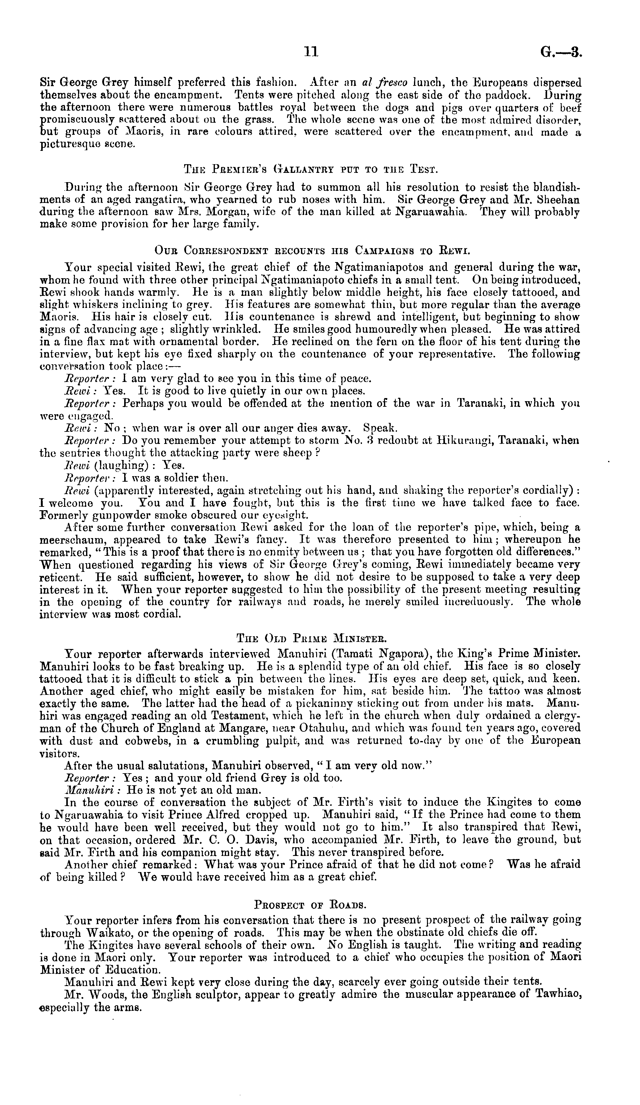 Sir George G-rey himself preferred this fashion. After ;in al fresco lunch, the Europeans dispersed themselves about the encampment. Tents were pitched along the east side of the paddock. -During the afternoon there were numerous battles royal between the dogs and pigs over quarters of beef promiscuously scattered about ou the grass. The whole scene was one of the most admired disorder, but groups of Maoris, in rare colours attired, were scattered over the encampment, and made a picturesque scene. The Premier's Gallantry put to the Test. During the afternoon Sir George Grey had to summon all his resolution to resist the blandishments of an aged rangatira, who yearned to rub noses with him. Sir George Grey and Mr. Sheehan during the afternoon saw Mrs. Morgan, wife of the man killed at Ngaruawahia. They will probably make some provision for her large family. Our Correspondent recounts his Campaigns to Eewi. Your special visited Rewi, the great chief of the Ngatimaniapotos and general during the war, whom he found with three other principal Ngatimaniapoto chiefs in a small tent. On being introduced, Eewi shook hands warmly. He is a man slightly below middle height, his face closely tattooed, and slight whiskers inclining to grey. His features are somewhat thin, bub more regular than the average Maoris. His hair is closely cut. His countenance is shrewd and intelligent, but beginning to show signs of advancing age ; slightly wrinkled. He smiles good humouredly when pleased. He was attired in a fine flax mat with ornamental border. He reclined on the fern on the floor of his tent during the interview, but kept his eye fixed sharply on the countenance of your representative. The following conversation took place: — Reporter : 1 am very glad to see you in this time of peace. Rewi: Yes. It is good to live quietly in our own places. Reporter : Perhaps you would be offended at the mention of the war in Taranaki, in which you were engaged. Rewi: No ; when war is over all our anger dies away. Speak. Reporter: Do you remember your attempt to storm No. 3 redoubt at Hikuraugi, Taranaki, when the sentries thought the attacking party were sheep ? Rewi, (laughing) : Yes. Reporter : 1 was a soldier then. Rewi (apparently interested, again stretching out his hand, and shaking the reporter's cordially) : I welcome you. You and I have fought, but this is the first time we have talked face to face. Formerly gunpowder smoke obscured our eyesight. After some further conversation Rewi asked for the loan of the reporter's pipe, which, being a meerschaum, appeared to take Eewi's fancy. It was therefore presented to him; whereupon he remarked, " This is a proof that there is no enmity between us ; that you have forgotten old differences." When questioned regarding his views of Sir George Grey's coming, Eewi immediately became very reticent. He said sufficient, however, to show he did not desire to be supposed to take a very deep interest in it. When your reporter suggested to him the possibility of the present meeting resulting in the opening of the country for railways and roads, he merely smiled increduously. The whole interview was most cordial. Tiie Old Prime Minister. Your reporter afterwards interviewed Manuhiri (Taraati Ngapora), the King's Prime Minister. Manuhiri looks to be fast breaking up. He is a splendid type of an old chief. His face is so closely tattooed that it is difficult to stick a pin between the lines. His eyes are deep set, quick, and keen. Another aged chief, who might easily be mistaken for him, sat beside him. The tattoo was almost exactly the same. The latter had the head of a pickaninny sticking out from under his mats. Manuhiri was engaged reading an old Testament, which he left in the church when duly ordained a clergyman of the Church of England at Mangare, near Otahuhu, and which was found ten years ago, covered with dust and cobwebs, in a crumbling pulpit, and was returned to-day by one of the European visitors. After the usual salutations, Manuhiri observed, " I am very old now." Reporter : Yes ; and your old friend Grey is old too. Manuhiri : He is not yet an old man. In the course of conversation the subject of Mr. Firth's visit to induce the Kingites to come to Ngaruawahia to visit Prince Alfred cropped up. Manuhiri said, "If the Prince had come to them he would have been well received, but they would not go to him." It also transpired that Rewi, on that occasion, ordered Mr. C. 0. Davis, who accompanied Mr. Firth, to leave the ground, but said Mr. Firth and his companion might stay. This never transpired before. Another chief remarked : What was your Prince afraid of that he did not come? Was he afraid of being killed ? We would have received him as a great chief. Prospect of Eoads. Your reporter infers from his conversation that there is no present prospect of the railway going through Waikato, or the opening of roads. This may be when the obstinate old chiefs die off. The Kingites have several schools of their own. No English is taught. The writing and reading is done in Maori only. Your reporter was introduced to a chief who occupies the position of Maori Minister of Education. Manuhiri and Eewi kept very close during the day, scarcely ever going outside their tents. Mr. Woods, the English sculptor, appear to greatly admire the muscular appearance of Tawhiao, especially the arms.