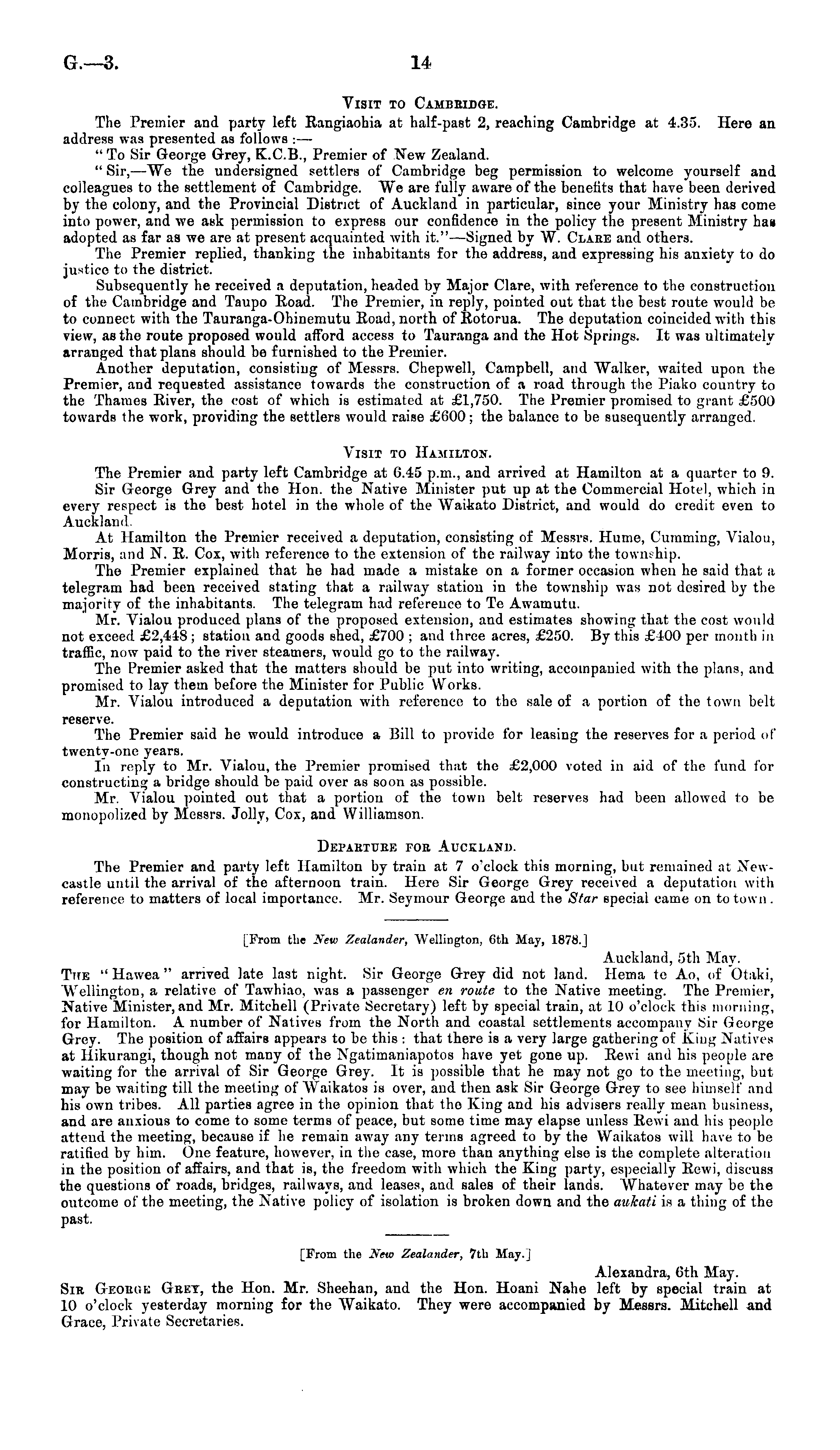 Visit to Cambridge. The Premier and party left Rangiaohia at half-past 2, reaching Cambridge at 4.35. Here an address was presented as follows : — "To Sir George Grey, X.C.8., Premier of New Zealand. " Sir, —"We the undersigned settlers of Cambridge beg permission to welcome yourself and colleagues to the settlement of Cambridge. We are fully aware of the benefits that have been derived by the colony, and the Provincial District of Auckland in particular, since your Ministry has come into power, and we ask permission to express our confidence in the policy the present Ministry has adopted as far as we are at present acquainted with it." —Signed by W. Clare and others. The Premier replied, thanking the inhabitants for the address, and expressing his anxiety to do justice to the district. Subsequently he received a deputation, headed by Major Clare, with reference to the construction of the Cambridge and Taupo Boad. The Premier, in reply, pointed out that the best route would be to connect with the Tauranga-Ohinemutu Eoad, north of Botorua. The deputation coincided with this view, as the route proposed would afford access to Tauranga and the Hot Springs. It was ultimately arranged that plans should be furnished to the Premier. Another deputation, consisting of Messrs. Chepwell, Campbell, and Walker, waited upon the Premier, and requested assistance towards the construction of a road through the Piako country to the Thames Eiver, the cost of which is estimated at £1,750. The Premier promised to grant £500 towards the work, providing the settlers would raise £600; the balance to be susequently arranged. Visit to Hamilton. The Premier and party left Cambridge at 6.45 p.m., and arrived at Hamilton at a quarter to 9. Sir George Grey and the Hon. the Native Minister put up at the Commercial Hotel, which in every respect is the best hotel in the whole of the Wai-kato District, and would do credit even to Auckland. At Hamilton the Premier received a deputation, consisting of Messrs. Hume, Cumming, Vialou, Morris, and N. E. Cox, with reference to the extension of the railway into the township. The Premier explained that he had made a mistake on a former occasion when he said that a telegram had been received stating that a railway station in the township was not desired by the majority of the inhabitants. The telegram had reference to Te Awamutu. Mr. Vialou produced plans of the proposed extension, and estimates showing that the cost would not exceed £2,448 ; station and goods shed, £700 ; and three acres, £250. By this £400 per month in traffic, now paid to the river steamers, would go to the railway. The Premier asked that the matters should be put into writing, accompanied with the plans, and promised to lay them before the Minister for Public Works. Mr. Vialou introduced a deputation with reference to the sale of a portion of the town belt reserve. The Premier said he would introduce a Bill to provide for leasing the reserves for a period of twenty-one years. In reply to Mr. Vialou, the Premier promised that the £2,000 voted in aid of the fund for constructing a bridge should be paid over as soon as possible. Mr. Vialou pointed out that a portion of the town belt reserves had been allowed to be monopolized by Messrs. Jolly, Cox, and Williamson. Departure for Auckland. The Premier and party left Hamilton by train at 7 o'clock this morning, but remained at Newcastle until the arrival of the afternoon train. Here Sir George Grey received a deputation with reference to matters of local importance. Mr. Seymour George and the Star special came on to town. [From the New Zealander, Wellington, 6th May, 1878.J Auckland, sth May. TifK " Hawea" arrived late last night. Sir George Grey did not land. Hema te Ao, of Otaki, Wellington, a relative of Tawhiao, was a passenger en route to the Native meeting. The Premier, Native Minister, and Mr. Mitchell (Private Secretary) left by special train, at 10 o'clock this morning, for Hamilton. A number of Natives from the North and coastal settlements accompany Sir George Grey. The position of affairs appears to be this : that there is a very large gathering of King Natives at Hikurangi, though not many of the Ngatimaniapotos have yet gone up. Eewi and his people are waiting for the arrival of Sir George Grey. It is possible that he may not go to the meeting, but may be waiting till the meeting of Waikatos is over, and then ask Sir George Grey to see himself and his own tribes. All parties agree in the opinion that the King and his advisers really mean business, and are anxious to come to some terms of peace, but some time may elapse unless Eewi and his people attend the meeting, because if he remain away any terms agreed to by the Waikatos will have to be ratified by him. One feature, however, in the case, more than anything else is the complete alteration in the position of affairs, and that is, the freedom with which the King party, especially Eewi, discuss the questions of roads, bridges, railways, and leases, and sales of their lands. Whatever may be the outcome of the meeting, the Native policy of isolation is broken down and the aukati is a thing of the past. [From the New Zealander, 7th May.] Alexandra, 6th May. Sir George Gret, the Hon. Mr. Sheehan, and the Hon. Hoani Nahe left by special train at 10 o'clock yesterday morning for the Waikato. They were accompanied by Messrs. Mitchell and Grace, Private Secretaries.