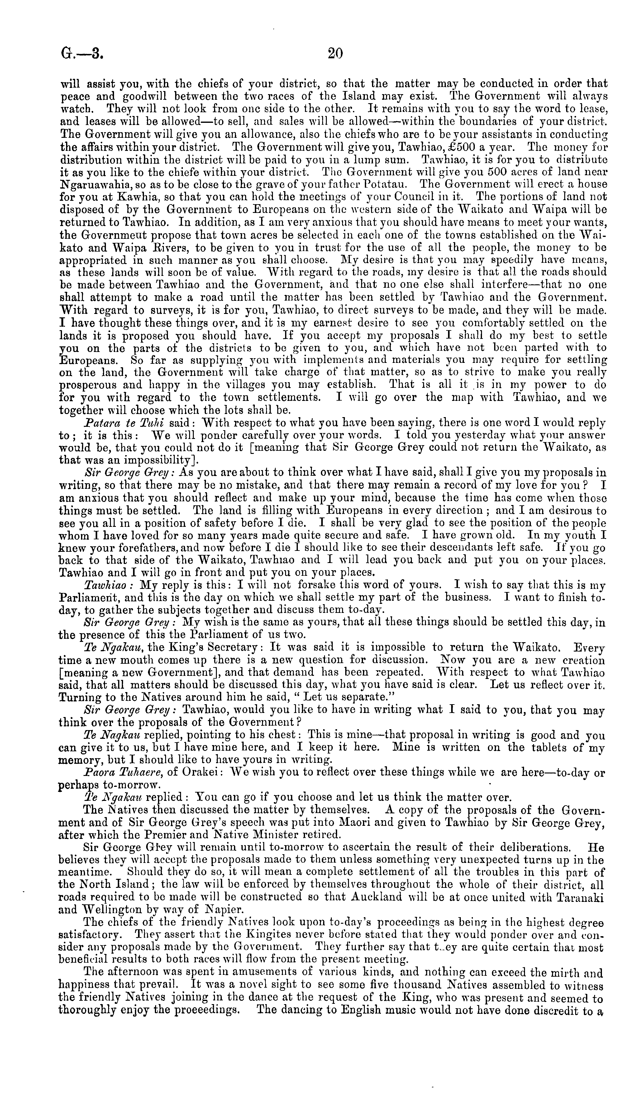 will assist you, with the chiefs of your district, so that the matter may be conducted in order that peace and goodwill between the two races of the Island may exist. The Government will always watch. They will not look from one side to the other. It remains with you to say the word to lease, and leases will be allowed—to sell, and sales will be allowed —within the boundaries of your district. The Government will give you an allowance, also the chiefs who are to be your assistants in conducting the affairs within your district. The Government will give you, Tawhiao, £500 a year. The money for distribution within the district will be paid to you in a lump sum. Tawhiao, it is for you to distribute it as you like to the chiefe within your district. The Government will give you 500 acres of land near Ngaruawahia, so as to be close to the grave of your father Polatau. The Government will erect a house for you at Kawhia, so that you can hold the meetings of your Council in it. The portions of land not disposed of by the Government to Europeans on the western side of the "Waikato and Waipa will be returned to Tawhiao. In addition, as lam very anxious that you should have means to meet your wants, the Government propose that town acres be selected in each one of the towns established on the Waikato and Waipa Rivers, to be given to you in trust for the use of all the people, the money to be appropriated in such manner as you shall choose. My desire is that you may speedily have means, as these lands will soon be of value. With regard to the roads, my desire is that all the roads should be made between Tawhiao and the Government, and that no one else shall interfere —that no one shall attempt to make a road until the matter has been settled by Tawhiao and the Government. With regard to surveys, it is for you, Tawhiao, to direct surveys to be made, and they will be made. I have thought these things over, and it is my earnest desire to see you comfortably settled on the lands it is proposed you should have. If you accept my proposals I shall do my best to settle you on the parts of the districts to be given to you, and which have not been parted with to Europeans. So far as supplying you with implements and materials you may require for settling on the land, the Government will take charge of that matter, so as to strive to make you really prosperous and happy in the villages you may establish. That is all it is in my power to do for you with regard to the town settlements. I will go over the map with Tawhiao, and we together will choose which the lots shall be. Patara te Talii said : With respect to what you have been saying, there is one word I would reply to ; it is this :We will ponder carefully over your words. I told you yesterday what your answer would be, that you could not do it [meaning that Sir George Grey could not return the Waikato, as that was an impossibility]. Sir George Grey: As you are about to think over what I have said, shall I give you my proposals in writing, so that there may be no mistake, and that there may remain a record of my love for you ? I am anxious that you should reflect and make up your mind, because the time has come when those things must be settled. The land is filling with Europeans in every direction ; and lam desirous to see you all in a position of safety before I die. I shall be very glad to see the position of the people whom I have loved for so many years made quite secure and safe. I have grown old. Iv my youth I knew your forefathers, and now before I die I should like to see their descendants left safe. If you go back to that side of the Waikato, Tawhiao and I will lead you back and put you on your places. Tawhiao and I will go in front and put you on your places. TawJtiao : My reply is this: I will not forsake this word of yours. I wish to say that this is my Parliament, and this is the day on which we shall settle my part of the business. I want to finish today, to gather the subjects together and discuss them to-day. Sir George Grey : My wish is the same as yours, that all these things should be settled this day, in the presence of this the Parliament of us two. Te JVgakau, the King's Secretary: It was said it is impossible to return the Waikato. Every time a new mouth comes up there is a new question for discussion. Now you are a new creation [meaning a new Government], and that demand has been repeated. With respect to what Tawhiao said, that all matters should be discussed this day, what you have said is clear. Let us reflect over it. Turning to the Natives around him he said, " Let us separate." Sir George Grey: Tawhiao, would you like to have in writing what I said to you, that you may think over the proposals of the Government ? Te NagJcau replied, pointing to his chest: This is mine—that proposal in writing is good and you can give it to us, but I have mine here, and I keep it here. Mine is written on the tablets of my memory, but I should like to have yours in writing. Paora Tuhaere, of Orakei: We wish you to reflect over these things while we are here—to-day or perhaps to-morrow. Te Ngahau replied : You can go if you choose and let us think the matter over. The Natives then discussed the matter by themselves. A copy of the proposals of the Government and of Sir George Grey's speech was put into Maori and given to Tawhiao by Sir George Grey, after which the Premier and Native Minister retired. Sir George Grey will remain until to-morrow to ascertain the result of their deliberations. He believes they will accept the proposals made to them unless something very unexpected turns up in the meantime. Should they do so, it will mean a complete settlement of all the troubles in this part of the North Island; the law will be enforced by themselves throughout the whole of their district, all roads required to bo made will be constructed so that Auckland will be at once united with Taranaki and Wellington by way of Napier. The chiefs of 