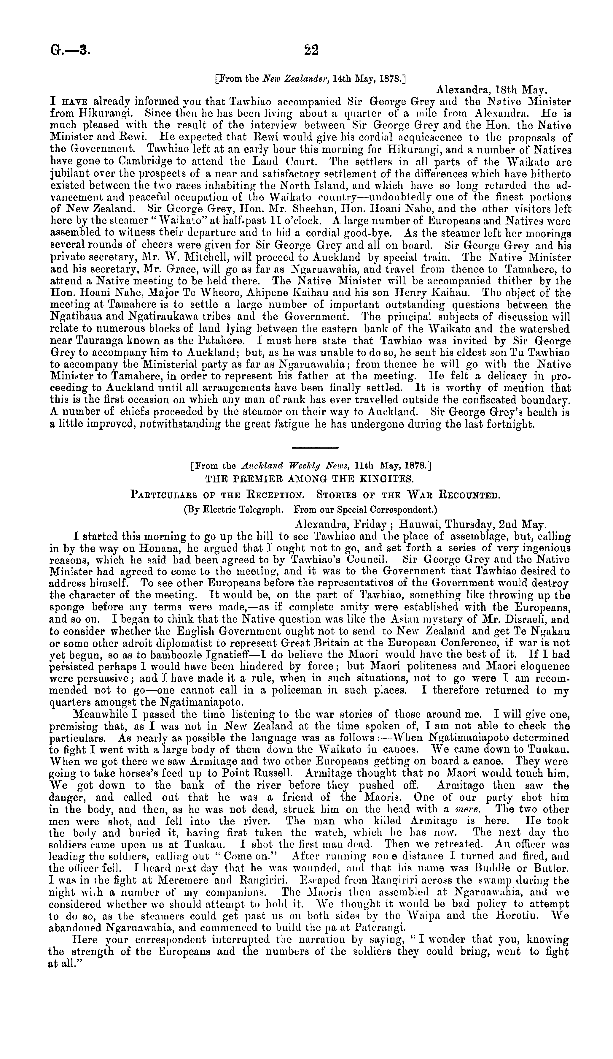 Alexandra, 18th May. I hate already informed you that Tawbiao accompanied Sir George Grey and the Native Minister from Hikurangi. Since then he has been living about a quarter of a mile from Alexandra. He is much pleased with the result of the interview between Sir George Grey and the Hon. the Native Minister and Rewi. He expected that Rewi would give his cordial acquiescence to the proposals of the Government. Tawhiao left at an early hour this morning for Hikurangi, and a number of Natives have gone to Cambridge to attend the Land Court. The settlers in all parts of the Waikato are jubilant over the prospects of a near and satisfactory settlement of the differences which have hitherto existed between the two races inhabiting the North Island, and which have so long retarded the advancement and peaceful occupation of the Waikato country —undoubtedly one of the finest portions of New Zealand. Sir George Grey, Hon. Mr. Sheehan, Hon. Hoani Nahe, and the other visitors left here by the steamer " Waikato" at half-past 11 o'clock. A large number of Europeans and Natives were assembled to witness their departure and to bid a cordial good-bye. As the steamer left her moorings several rounds of cheers were given for Sir George Grey and all on board. Sir George Grey and his private secretary, Mr. W. Mitchell, will proceed to Auckland by special train. The Native Minister and his secretary, Mr. Grace, will go as far as Ngaruawahia, and travel from thence to Tamahere, to attend a Native meeting to be held there. The Native Minister will be accompanied thither by the Hon. Hoani Nahe, Major Te Wheoro, Ahipene Kaihau and his son Henry Kaihau. The object of the meeting at Tamahere is to settle a large number of important outstanding questions between the Ngatihaua and Ngatiraukawa tribes and the Government. The principal subjects of discussion will relate to numerous blocks of land lying between the eastern bank of the Waikato and the watershed near Tauranga known as the Patahere. I must here state that Tawhiao was invited by Sir George Grey to accompany him to Auckland; but, as he was unable to do so, he sent his eldest son Tv Tawhiao to accompany the Ministerial party as far as Ngaruawahia; from thence he will go with the Native Minister to Tamahere, in order to represent his father at tho meeting. He felt a delicacy in proceeding to Auckland until all arrangements have been finally settled. It is worthy of mention that this is the first occasion on which any man of rank has ever travelled outside the confiscated boundary. A number of chiefs proceeded by the steamer on their way to Auckland. Sir George Grey's health is a little improved, notwithstanding the great fatigue he has undergone during the last fortnight. [From the Auckland Weekly News, 11th May, 1878.] THE PREMIER AMONG THE KIXGITES. Paeticttlaes of the Reception. Stoeies of the Wae Recounted. (By Electric Telegraph. From our Special Correspondent.) Alexandra, I'riday ; Hauwai, Thursday, 2nd May. I started this morning to go up the hill to see Tawhiao and the place of assemblage, but, calling in by the way on Honana, he argued that I ought not to go, and set forth a series of very ingenious reasons, which he said had been agreed to by Tawhiao's Council. Sir George Grey and the Native Minister had agreed to come to the meeting, and it was to the Government that Tawhiao desired to address himself. To see other Europeans before the representatives of the Government would destroy the character of the meeting. It would be, on the part of Tawhiao, something like throwing up the sponge before any terms were made, —as if complete amity were established with the Europeans, and so on. I began to think that the Native question was like the Asian mystery of Mr. Disraeli, and to consider whether the English Government ought not to send to New Zealand and get Te Ngakau or some other adroit diplomatist to represent Great Britain at the European Conference, if war is not yet begun, so as to bamboozle Ignatieff—l do believe the Maori would have the best of it. If I had persisted perhaps I would have been hindered by force; but Maori politeness and Maori eloquence were persuasive; and I have made it a rule, when in such situations, not to go were I am recommended not to go —one cannot call in a policeman in such, places. I therefore returned to my quarters amongst the Ngatimaniapoto. Meanwhile I passed tho time listening to the war stories of those around me. I will give one, premising that, as I was not in New Zealand at the time spoken of, I am not able to check the particulars. As nearly as possible the language was as follows : —When Ngatimaniapoto determined to fight I went with a large body of them down the Waikato in canoes. We came down to Tuakau. When we got there we saw Armitage and two other Europeans getting on board a canoe. They were going to take horses's feed up to Point Russell. Armitage thought that no Maori would touch him. We got down to the bank of the river before they pushed off. Armitage then saw the danger, and called out that he was a friend of the Maoris. One of our party Bhot him in the body, and then, as he was not dead, struck him on the head with a mere. The two other men were shot, and fell into the river. The man who killed Armitage is here. He took the body and buried it, having first taken the watch, which he has now. The next day the soldiers came upon us at Tuakau. I shot the first man dead. Then we retreated. An officer was leading the soldiers, calling out " Come on." After running some distance I turned and fired, and the oilicer fell. I heard next day that ho was wounded, and that his name was Buddie or Butler. I was in ihe fight at Mereinere and Rangiriri. Escaped from Rangiriri across the swamp during the night with a number of my companions. The Maoris then assembled at Ngaruawuhia, and we considered whether we should attempt to hold it. We thought it would be bad policy to attempt to do so, as the steame