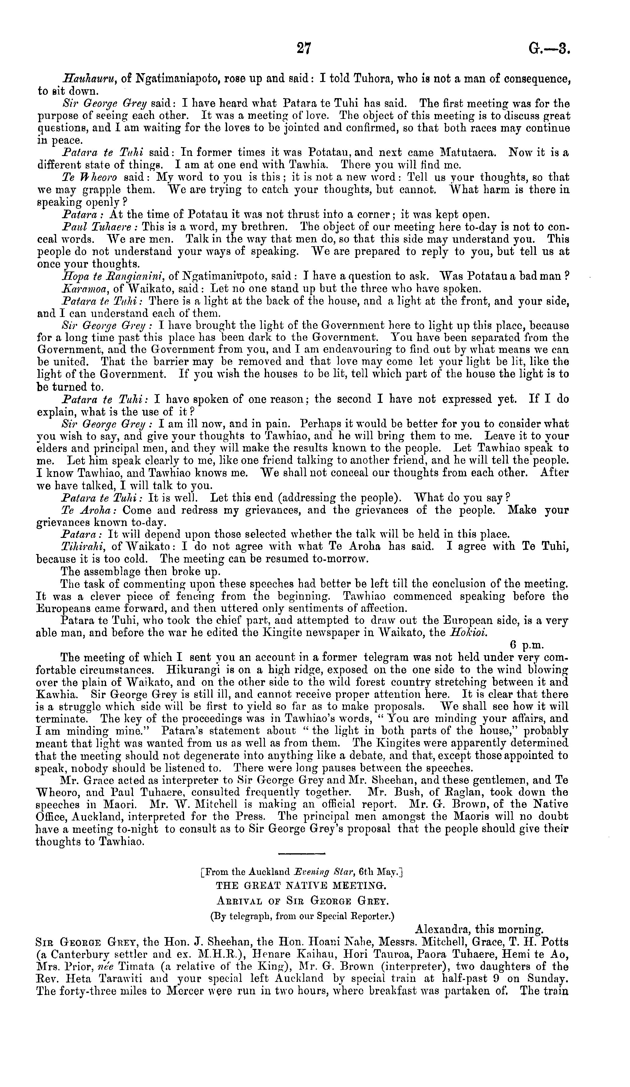 Sauhauru, of Ngatiinaniapoto, rose up and said: I told Tuhora, who is not a man of consequence, to sit down. Sir George Grey said: I have heard what Patara te Tuhi has said. The first meeting was for the purpose of seeing each other. It was a meeting of love. The object of this meeting is to discuss great questions, and I am waiting for the loves to be jointed and confirmed, so that both races may continue in peace. Patara te Tuhi said: Informer times it was Potatau, and next came Mahitaera. Now it is a different state of things. lam at one end with Tawhia. There you will find me. Te TPheoro said: My word to you is this; it is not a new word: Tell us your thoughts, so that we may grapple them. "We are trying to catch your thoughts, but cannot. What harm is there in speaking openly ? Patara : At the time of Potatau it was not thrust into a corner; it was kept open. Paul Tuhaere : This is a word, my brethren. The object of our meeting here to-day is not to conceal words. "We are men. Talk in the way that men do, so that this side may understand you. This people do not understand your ways of speaking. "We are prepared to reply to you, but tell us at once your thoughts. Eopa te Eangianini, of Ngatimanrcpoto, said : I have a question to ask. "Was Potatau a bad man ? Karamoa, of Waikato, said: Let no one stand up but the three who have spoken. Patara te Tuhi: There is a light at the back of the house, and a light at the front, and your side, and I can understand each of them. Sir George Grey : I have brought the light of the Government here to light up this place, because for a long time past this place has been dark to the Government. You have been separated from the Government, and the Government from you, and I am endeavouring to find out by what means we can be united. That the barrier may be removed and that love may come let your light be lit, like the light of the Government. If you wish the houses to be lit, tell which part of the house the light is to be turned to. Patara te Tuhi: I have spoken of one reason: the second I have not expressed yet. If I do explain, what is the use of it ? Sir George Grey : lam ill now, and in pain. Perhaps it would be better for you to consider what you wish to say, and give your thoughts to Tawhiao, and he will bring them to me. Leave it to your elders and principal men, and they will make the results known to the people. Let Tawhiao speak to me. Let him speak clearly to me, like one friend talking to another friend, and he will tell the people. I know Tawhiao, and Tawhiao knows me. We shall not conceal our thoughts from each other. After we have talked, I will talk to you. Patara te Tula : It is well. Let this end (addressing the people). What do you say ? Te Aroha: Come and redress my grievances, and the grievances of the people. Make your grievances known to-day. Patara: It will depend upon those selected whether the talk will be held in this place. Tihirahi, of Waikato: I do not agree with what Te Aroha has said. I agree with Te Tuhi, because it is too cold. The meeting can be resumed to-morrow. The assemblage then broke up. The task of commenting upon these speeches had better be left till the conclusion of the meeting. It was a clever piece of fencing from the beginning. Tawhiao commenced speaking before the Europeans came forward, and then uttered only sentiments of affection. Patara te Tuhi, who took the chief part, aud attempted to draw out the European side, is a very able man, and before the war he edited the Kingite newspaper in Waikato, the Holcioi. 6 p.m. The meeting of which I sent you an account in a former telegram was not held under very comfortable circumstances. Hikurangi is on a high ridge, exposed on the one side to the wind blowing over the plain of Waikato, and on the other side to the wild forest country stretching between it and Kawhia. Sir George Grey is still ill, and cannot receive proper attention here. It is clear that there is a struggle which side will be first to yield so far as to make proposals. We shall see how it will terminate. The key of the proceedings was in Tawhiao's words, " You are minding your affairs, and lam minding mine." Patara's statement about " the light in both parts of the house," probably meant that light was wanted from us as well as from them. The Kingites were apparently determined that the meeting should not degenerate into anything like a debate, and that, except those appointed to speak, nobody should be listened to. There were long pauses between the speeches. Mr. Grace acted as interpreter to Sir George Grey and Mr. Sheehan, and these gentlemen, and Te Wheoro, and Paul Tuhaere, consulted frequently together. Mr. Bush, of Eaglan, took down the speeches in Maori. Mr. W. Mitchell is making an official report. Mr. G. Brown, of the Native Office, Auckland, interpreted for the Press. The principal men amongst the Maoris will no doubt have a meeting to-night to consult as to Sir George Grey's proposal that the people should give their thoughts to Tawhiao. [From the Auckland Evening S/ar, 6th May.] THE GREAT NATIVE MEETING-. Aeeival of Sik Geoege Gbey. (By telegraph, from our Special Eeporter.) Alexandra, this morning. Sib Gkoege Grey, the Hon. J. Sheehan, the Hon. Hoani Nahe, Messrs. Mitchell, Grace, T. H. Potts (a Canterbury settler and ex. M.H.R.), Henare Kaihau, Hori Tauroa, Paora Tuhaere, Hemi te Ao, Mrs. Prior, ne'e Timata (a relative of the King), Mr. G. Brown (interpreter), two daughters of the Rev. Heta Tarawiti and your special left Auckland by special train at half-past 9 on Sunday. The forty-three miles to Mercer were run in two hours, where breakfast was partaken of. The train