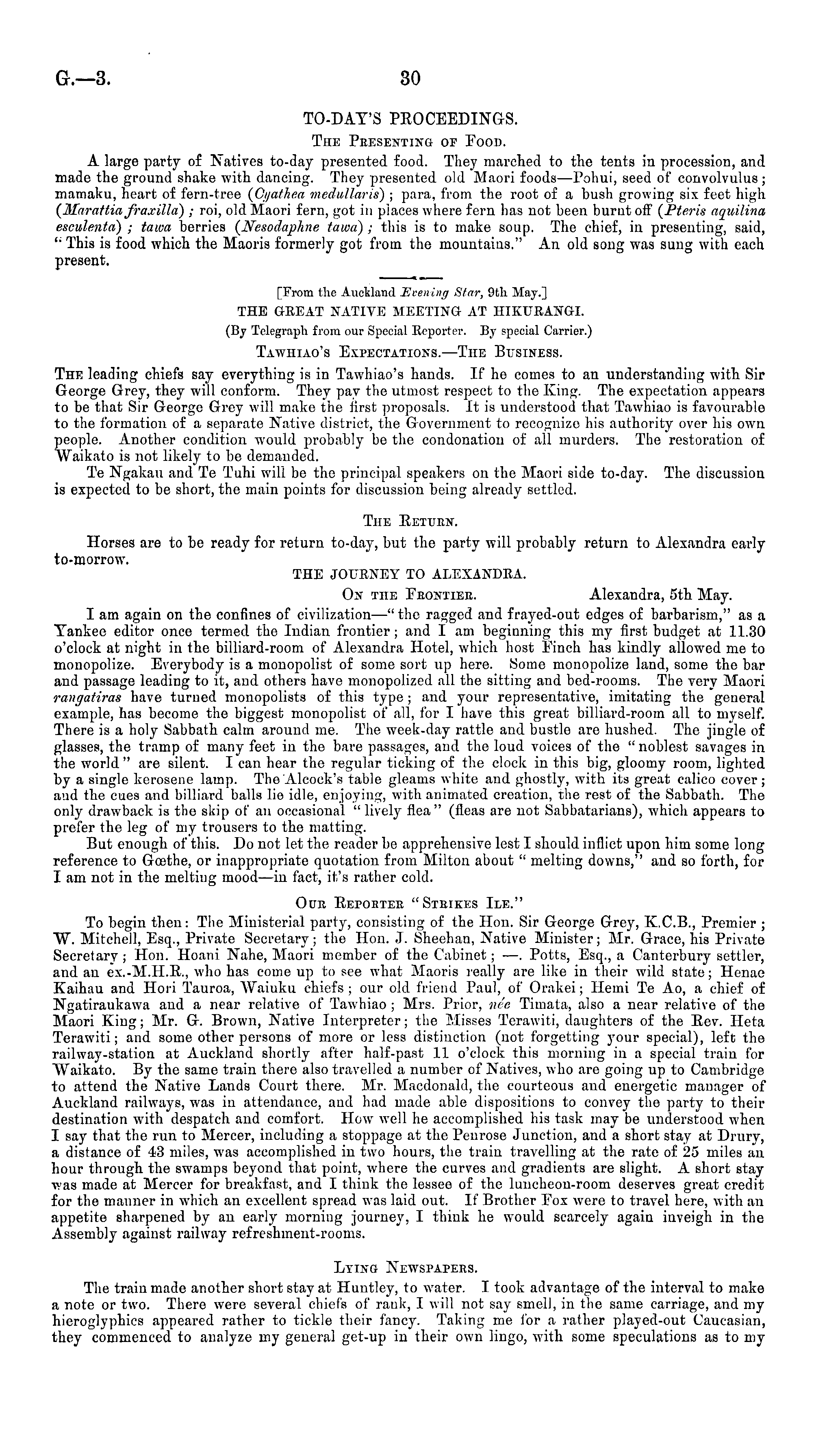 TO-DAT'S PROCEEDINGS. The Presenting op Pood. A large party of Natives to-day presented food. They marched to the tents in procession, and made the ground shake with dancing. They presented old Maori foods —Pohui, seed of convolvulus ; mamaku, heart of fern-tree (Cyathea medullaris) ; para, from the root of a bush growing six feet high (JSlarattia fraxilla) ; roi, old Maori fern, got in places where fern has not been burnt off {Pteris aquilina esculenta) ; tawa berries (Nesodaphne tawa) ; this is to make soup. The chief, in presenting, said, '; This is food which the Maoris formerly got from the mountains." An old song was sung with each present. [From the Auckland Evening Star, 9tk May.] THE GREAT NATIVE MEETING- AT HIKURANGI. (By Telegraph from our Special Reporter. By special Carrier.) Tawhiao's Expectations.—The Business. The leading chiefs say everything is in Tawhiao's hands. If he comes to an understanding with Sir George Grey, they will conform. They pay the utmost respect to the King. The expectation appears to be that Sir George Grey will make the first proposals. It is understood that Tawhiao is favourable to the formation of a separate Native district, the Government to recognize his authority over his own people. Another condition would probably be the condonation of all murders. The restoration of "Waikato is not likely to be demanded. Te Ngakau and Te Tuhi will be the principal speakers on the Maori side to-day. The discussion is expected to be short, the main points for discussion being already settled. The Return. Horses are to be ready for return to-day, but the party will probably return to Alexandra early to-morrow. THE JOURNEY TO ALEXANDRA. On tiie Frontier. Alexandra, sth May. lam again on the confines of civilization —" the ragged and frayed-out edges of barbarism," as a Yankee editor once termed the Indian frontier ; and I am beginning this my first budget at 11.30 o'clock at night in the billiard-room of Alexandra Hotel, which host Finch has kindly allowed me to monopolize. Everybody is a monopolist of some sort up here. Some monopolize land, some the bar and passage leading to it, and others have monopolized all the sitting and bed-rooms. The very Maori rangatiras have turned monopolists of this type; and your representative, imitating the general example, has become the biggest monopolist of all, for I have this great billiard-room all to myself. There is a holy Sabbath calm around me. The week-day rattle and bustle are hushed. The jingle of glasses, the tramp of many feet in the bare passages, and the loud voices of the " noblest savages in the world " are silent. I can hear the regular ticking of the clock in this big, gloomy room, lighted by a single kerosene lamp. TheAlcock's table gleams white and ghostly, with its great calico cover; aud the cues and billiard balls lie idle, enjoying, with animated creation, the rest of the Sabbath. The only drawback is the skip of an occasional " lively flea" (fleas are not Sabbatarians), which appears to prefer the leg of my trousers to the matting. But enough of this. Do not let the reader be apprehensive lest I should inflict upon him some long reference to Goothe, or inappropriate quotation from Milton about " melting downs," and so forth, for I am not in the melting mood —in fact, it's rather cold. Our Reporter "Strikes Ile." To begin then: The Ministerial party, consisting of the Hon. Sir George Grey, X.C.8., Premier ; "W\ Mitchell, Esq., Private Secretary; the Hon. J. Sheehan, Native Minister; Mr. Grace, his Private Secretary ; Hon. Hoani Nahe, Maori member of the Cabinet; —. Potts, Esq., a Canterbury settler, and an ex.-M.H.R., who has come up to see what Maoris really are like in their wild state; Henao Kaihau and Hori Tauroa, Waiuku chiefs ; our old friend Paul, of Orakei; He mi Te Ao, a chief of Ngatiraukawa and a near relative of Tawhiao ; Mrs. Prior, ne'e Timata, also a near relative of the Maori King; Mr. G. Brown, Native Interpreter; the Misses Terawiti, daughters of the Rev. Heta Terawiti; and some other persons of more or less distinction (not forgetting jour special), left the railway-station at Auckland shortly after half-past 11 o'clock this morning in a special train for Waikato. By the same train there also travelled a number of Natives, who are going up to Cambridge to attend the Native Lands Court there. Mr. Macdonald, the courteous and energetic manager of Auckland railways, was in attendance, and had made able dispositions to convey the party to their destination with despatch and comfort. How well he accomplished his task may be understood when I say that the run to Mercer, including a stoppage at the Penrose Junction, and a short stay at Drury, a distance of 43 miles, was accomplished in two hours, the train travelling at the rate of 25 miles an hour through the swamps beyond that point, where the curves and gradients are slight. A short stay ■was made at Mercer for breakfast, and I think the lessee of the luncheon-room deserves great credit for the manner in which an excellent spread was laid out. If Brother Fox were to travel here, with an appetite sharpened by an early morning journey, I think he would scarcely again inveigh in the Assembly against railway refreshment-rooms. Lying Newspapers. The train made another short stay at Huntley, to water. I took advantage of the interval to make a note or two. There were several chief's of rank, I will not say smell, in the same carriage, and my hieroglyphics appeared rather to tickle their fancy. Taking me for a rather played-out Caucasian, they commenced to analyze my general get-up in their own lingo, with some speculations as to my