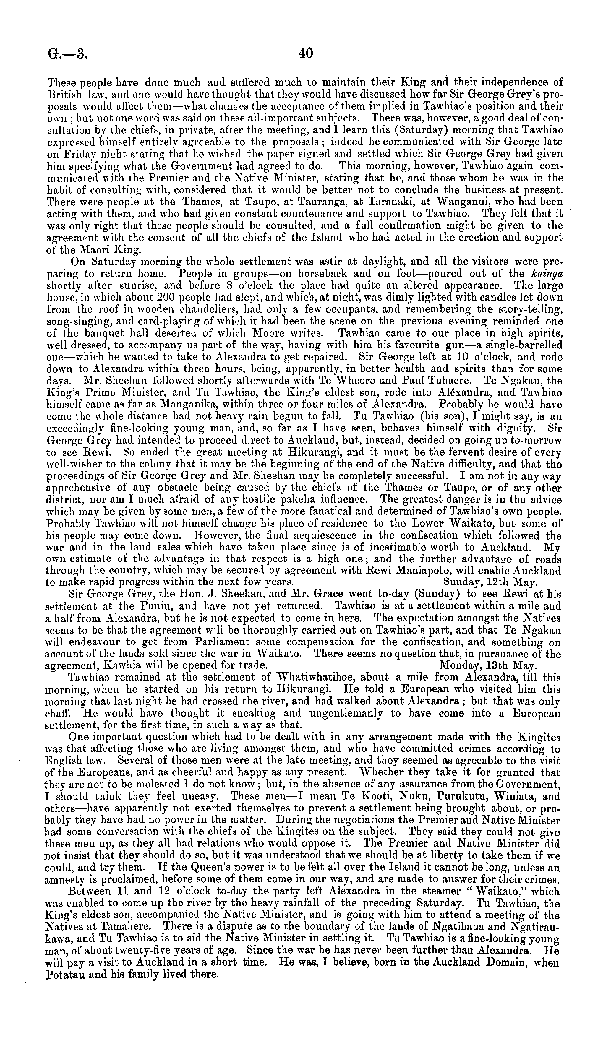 These people have done much and suffered much to maintain their King and their independence of British law, and one would have thought that they Avould have discussed how far Sir George Grey's proposals would affect them —what changes the acceptance of them implied in Tawhiao's position and their own ; but not one word was said on these all-important subjects. There was, however, a good deal of consultation by the chiefs, in private, after the meeting, and I learn this (Saturday) morning that Tawhiao expressed himself entirely agreeable to the proposals ; indeed he communicated with Sir George late on Friday night stating that he wished the paper signed and settled which Sir George Grey had given him specifying Avhat the Government had agreed to do. This morning, however, Tawhiao again communicated with the Premier and the Native Minister, stating that he, and those whom he was in the habit of consulting Avith, considered that it would be better not to conclude the business at present. There Avere people at the Thames, at Taupo, at Tauranga, at Taranaki, at Wanganui, who had been acting Avith them, and Avho had given constant countenance and support to Tawhiao. They felt that it was only right that these people should be consulted, and a full confirmation might be given to the agreement with the consent of all the chiefs of the Island who had acted in the erection and support of the Maori King. On Saturday morning the Avhole settlement was astir at daylight, and all tbe visitors were preparing to return home. People in groups—on horseback and on foot—poured out of the kainga shortly after sunrise, and before 8 o'clock the place had quite an altered appearance. The large house, in Avhich about 200 people had slept, and which, at night, Avas dimly lighted with candles let down from the roof in wooden chandeliers, had only a few occupants, and remembering the story-telling, song-singing, and card-playing of which it had been the scene on the previous evening reminded one of the banquet hall deserted of which Moore writes. Tawhiao came to our place in high spirits, Avell dressed, to accompany us part of the Avay, having with him his favourite gun—a single-barrelled one —which he wanted to take to Alexandra to get repaired. Sir George left at 10 o'clock, and rode down to Alexandra within three hours, being, apparently, in better health and spirits than for some days. Mr. Sheehan followed shortly afterwards with Te Wheoro and Paul Tuhaere. Te Ngakau, the King's Prime Minister, and Tv Tawhiao, the King's eldest son, rode into Alexandra, and Tawhiao himself came as far as Manganika, within three or four miles of Alexandra. Probably he Avould have come the whole distance had not heavy rain begun to fall. Tv Tawhiao (his son), I might say, is an exceedingly fine-looking young man, and, so far as I have seen, behaves himself with dignity. Sir George Grey had intended to proceed direct to Auckland, but, instead, decided on going up to-morrow to see Rewi. So ended the great meeting at Hikurangi, and it must be the fervent desire of every well-wisher to the colony that it may be the beginning of the end of the Native difficulty, and that the proceedings of Sir George Grey and Mr. Sheehan may be completely successful. lam not in any way apprehensive of any obstacle being caused by the chiefs of the Thames or Taupo, or of any other district, nor am I much afraid of any hostile pakeha influence. The greatest danger is in the advice which may be given by some men, a few of the more fanatical and determined of Tawhiao's own people. Probably Tawhiao will not himself change his place of residence to the LoAver Waikato, but some of his people may come down. However, the final acquiescence in the confiscation which followed the Avar and in the land sales which have taken place since is of inestimable worth to Auckland. My own estimate of the advantage in that respect is a high one ; and the further advantage of roads through the country, which may be secured by agreement with Rewi Maniapoto, will enable Auckland to make rapid progress within the next few years. Sunday, 12th May. Sir George Grey, the Hon. J. Sheehan, and Mr. Grace went to-day (Sunday) to see Rewi at his settlement at the Puniu, aud have not yet returned. Tawhiao is at a settlement Avithin a mile and a half from Alexandra, but he is not expected to come in here. The expectation amongst the Natives seems to be that the agreement will be thoroughly carried out on Tawhiao's part, and that Te Ngakau will endeavour to get from Parliament some compensation for the confiscation, and something on account of the lands sold since the war in AVaikato. There seems no question that, in pursuance of the agreement, Kawhia will be opened for trade. Monday, 13th May. Tawhiao remained at the settlement of AVhatiwhatihoe, about a mile from Alexandra, till this morning, when he started on his return to Hikurangi. He told a European Avho visited him this morning that last night he had crossed the river, and had walked about Alexandra ; but that was only chaff. He would have thought it sneaking and ungentlemanly to have come into a European settlement, for the first time, in such a way as that. Oue important question which had to be dealt Avith in any arrangement made with the Kingites Avas that affecting those who are living amongst them, and Avho have committed crimes according to English law. Several of those men were at the late meeting, and they seemed as agreeable to the visit of the Europeans, and as cheerful and happy as any present. AVhether they take it for granted that they are not to be molested I do not know ; but, in the absence of any assurance from the Government, I should think they feel uneasy. These men—l mean To Kooti, Nuku, Purukutu, Winiata, and others —have apparently not exerted themselves to prevent a settlement being brought about, or probably they have had no power in the matter. During the negotiations the Premier and Native 