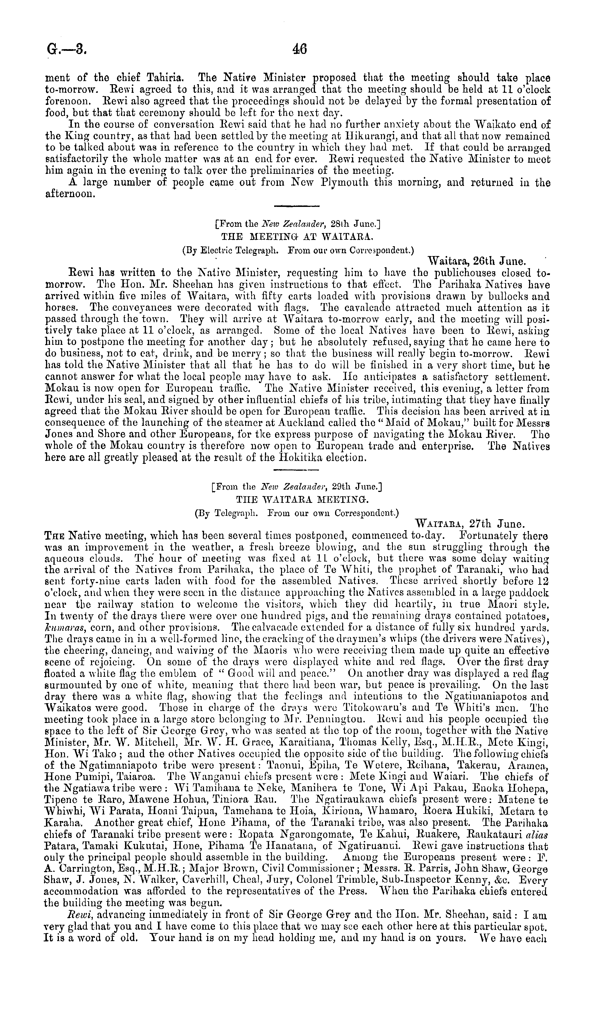 ment of the chief Tahiria. The Native Minister proposed that the meeting should take place to-morrow. Eewi agreed to this, and it was arranged that the meeting should be held at 11 o'clock forenoon, ltewi also agreed that the proceedings should not he delayed by the formal presentation of food, but that that ceremony should be left for the next day. In the course of conversation Eewi said that he had no further anxiety about the "Waikato end of the King country, as that had been settled by the meeting at Hikurangi, and that all that now remained to be talked about was in reference to the country in which they had met. If that could be arranged satisfactorily the whole matter was at an end for ever. Eewi requested the Native Minister to meet him again in the evening to talk over the preliminaries of the meeting. A large number of people came out from New Plymouth this morning, and returned in the afternoon. [From the New Zealander, 28th June] THE MEETING- AT WAITARA. (By Electric Telegraph. From our own Correspondent.) "Waitara, 26th June. Eewi has written to the Native Minister, requesting him to have the publichouses closed tomorrow. The Hon. Mr. Sheehan has given instructions to that effect. The Parihaka Natives have arrived within five miles of Waitara, with fifty carts loaded with provisions drawn by bullocks and horses. The conveyances were decorated with flags. The cavalcade attracted much attention as it passed through the town. They will arrive at Waitara to-morrow early, and the meeting will positively take place at 11 o'clock, as arranged. Some of the local Natives have been to Eewi, asking him to postpone the meeting for another day; but he absolutely refused, saying that he came here to do business, not to eat, drink, and be merry; so that the business will really begin to-morrow. Eewi has told the Native Minister that all that he has to do will be finished in a very shorb time, but he cannot answer for what the local people may have to ask. lie anticipates a satisfactory settlement. Mokau is now open for European traffic. The Native Minister received, this evening, a letter from Ecwi, under his seal, and signed by other influential chiefs of his tribe, intimating that they have finally agreed that the Mokau Eiver should be open for European traffic. This decision has been arrived at in consequence of the launching of the steamer at Auckland called the " Maid of Mokau," built for Messrs Jones and Shore and other Europeans, for tke express purpose of navigating the Mokau Eivcr. The whole of the Mokau country is therefore now open to European trade and enterprise. The Natives here are all greatly pleased at the result of the Hokitika election. [From the New Zealander, 29th June.] TIIE "WAITARA MEETING. (By Telegraph. From our own Correspondent.) "Waitara, 27th June. The Native meeting, which has been several times postponed, commenced to-day. Fortunately there was an improvement in the weather, a fresh breeze blowing, and the sun struggling through the aqueous clouds. The hour of meeting was fixed at 11 o'clock, but there was some delay waiting the arrival of the Natives from Parihaka, the place of Te Whiti, the prophet of Taranaki, who had sent forty-nine carts laden with food for the assembled Natives. These arrived shortly before 12 o'clock, and when they were seen in the distance approaching the Natives assembled in a large paddock near the railway station to welcome the visitors, which they did heartily, in true Maori style. In twenty of the drays there were over one hundred pigs, and the remaining drays contained potatoes, Tcumara*, corn, and other provisions. Thecalvacade extended for a distance of fully six hundred yards. Tiie drays came in in a well-formed lino, the cracking of the draymen's whips (the drivers were Natives), the cheering, dancing, and waiving of the Maoris who were receiving them made up quite an effective scene of rejoicing. On some of the drays were displayed white and red flags. Over the first dray floated a white flag the emblem of " Good will and peace." On another dray was displayed a red flag surmounted by one of white, meaning that there had been war, but peace is prevailing. On the last dray there was a white flag, showing that the feelings and intentions to the Ngatimaniapotos and Waikatos were good. Those in charge of the dr;\ys were Titokowaru's and Te Whiti's men. The meeting took place in a largo store belonging to Mr. Penningtou. Eewi and his people occupied the space to the left of Sir George Grey, who was seated at the top of the room, together with the Native Minister, Mr. AY. Mitchell, Mr. W. H. Grace, Karaitiana, Thomas Kelly, Esq., M.H.E., Mete Kingi, Hon. Wi Tako ; and the other Natives occupied the opposite side of the building. The following chiefs of the Ngatimaniapoto tribe were present: Taonui, Epiha, Te Wetere, Kcihana, Takerau, Aramea, Hone Pumipi, Taiaroa. The Wanganui chiefs present were : Mete Kingi and Waiari. The chiefs of the Ngatiawa tribe were : "Wi Tamihaua te Neke, Manihera te Tone, Wi Api Pakau, Euoka llohepa, Tipeno te Earo, Mawene Hohua, Tiniora Eau. The Ngatiraukawa chiefs present were: Matene te "Whiwhi, "Wi Parata, Hoani Taipua, Tamehana te Hoia, Kiriona, "Whamaro, Eoera Hukiki, Metara te Karaha. Another great chief, Hone Pihama, of the Taranaki tribe, was also present. The Parihaka chiefs of Taranaki tribe present were: Eopata Ngarongomate, To Kahui, Euakere, Eaukatauri alias Patara, Tamaki Kukutai, Hone, Pihama Te Hanatana, of Ngatiruanui. Eewi gave instructions that only the principal people should assemble in the building. Among the Europeans present were :P. A. Carrington, Esq., M.H.E.; Major Brown, Civil Commissioner ; Messrs. E. Parris, John Shaw, George Shaw, J. Jones, N. Walker, Caverhill, Cheal, Jury, Colonel Trimble, Sub-Inspector Kenny, &c. Every accommodation was afforded to the representatives of the Press. "When the Parihaka chiefs entered the building the meeting was begun. Eewi, advancing im