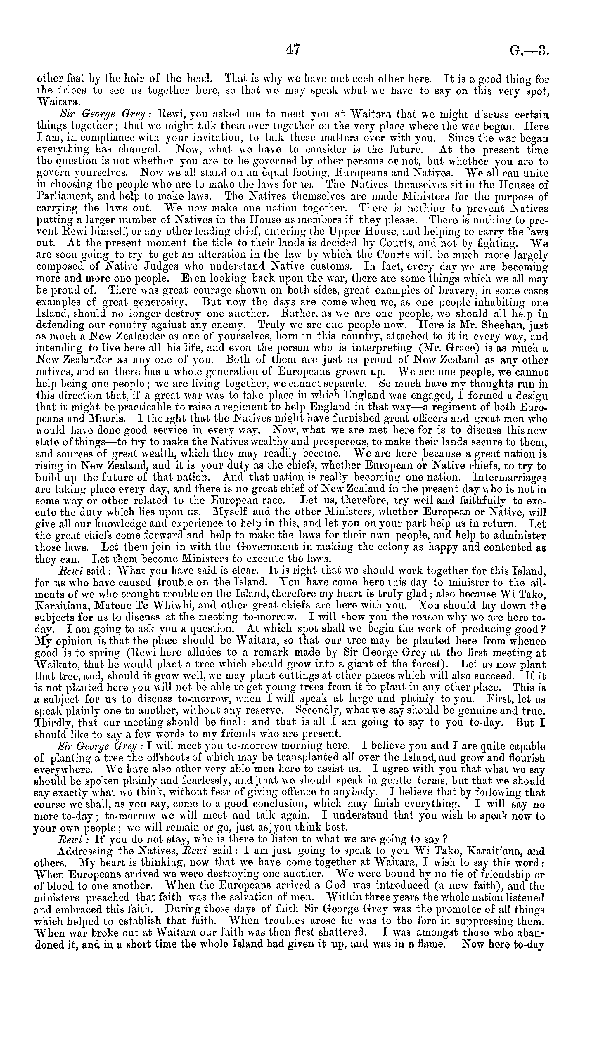 other fast by the hair of the head. That is why we have met eech other here. It is a good thing for the tribes to see us together here, so that we may speak what we hare to say on this very spot, AVaitara. Sir George Grey: Eewi, you asked me to meet you at AVaitara that we might discuss certain things together; that we might talk them over together on the very place where the war began. Here I am, in compliance with your invitation, to talk these matters over with you. Since the war began everything has changed. Now, what we have to consider is the future. At the present time the question is not whether you are to be governed by other persons or not, but whether you are to govern yourselves. Now we all stand on an equal footing, Europeans and Natives. We all can unite in choosing the people who are to make the laws for us. Tho Natives themselves sit in the Houses of Parliament, and help to make laws. Tho Natives themselves are made Ministers for the purpose of carrying the laws out. We now make one nation together. There is nothing to prevent Natives putting a larger number of Natives in the House as members if they please. There is nothing to prevent Kewi himself, or any other leading chief, entering tho Upper House, and helping to carry the laws out. At the present moment the title to their lands is decided by Courts, and not by fighting. Wo are soon going to try to get an alteration in the law by which the Courts will bo much more largely composed of Native Judges who understand Native customs. In fact, every day wn are becoming more and more one people. Even looking back upon the war, there are some things which we all may be proud of. There was great courage shown on both sides, great examples of bravery, in some cases examples of great generosity. But now tho days are come when we, as one people inhabiting one Island, should no longer destroy one another, liather, as wo are one people, wo should all help in defending our country against any enemy. Truly we are one people now. Here is Mr. Sheehan, just as much a New Zealaudcr as one of yourselves, born in this country, attached to it in every way, and intending to live here all his life, and even the person who is interpreting (Mr. Grace) is as much a New Zealander as any one of you. Both of them are just as proud of New Zealand as any other natives, and so there has a whole generation of Europeans grown up. We arc one people, we cannot help being one people ; we are living together, we cannot separate. So much have my thoughts run in this direction that, if a great war was to take place in which England was engaged, 1 formed a design that it might be practicable to raise a regiment to help England in that way —a regiment of both Europeans and Maoris. I thought that the Natives might have furnished great officers and great men who would have done good service in every way. Now, what we are met here for is to discuss this new slate of things —to try to make the Natives wealthy and prosperous, to make their lands secure to them, and sources of great wealth, which they may readily become. We are here because a great nation is rising in New Zealand, and it is your duty as the chiefs, whether European or Native chiefs, to try to build up tho future of that nation. And that nation is really becoming one nation. Intermarriages are taking place every day, and there is no great chief of New Zealand in the present day who is not in some way or other related to the European race. Let us, therefore, try well and faithfully to execute the duty which lies upon us. Myself and the other Ministers, whether European or Native, will give all our knowledge and experience to help in this, and let you on your part help us in return. Let the great chiefs come forward and help to make the laws for their own people, and help to administer those laws. Let them join in with the Government in making the colony as happy and contented aa they can. Let them become Ministers to execute the laws. JSewi said : What you have said is clear. It is right that we should work together for this Island, for us who have caused trouble on the Island. You have come here this day to minister to the ailments of we who brought trouble on the Island, therefore my heart is truly glad ; also because Wi Tako, Karaitiana, Matenc Te AVhiwhi, and other great chiefs are hero with you. You should lay down the subjects for us to discuss at the meeting to-morrow. I will show you the reason why we are hero today. lam going to ask you a question. At which spot shall wo begin the work of producing good ? My opinion is that the place should be AVaitara, so that our tree may be planted here from whence good is to spring (Rewi here alludes to a remark made by Sir George Grey at tho first meeting at Waikato, that he would plant a tree which should grow into a giant of the forest). Let us now plant that tree, and, should it grow well, we may plant cuttings at other places which will also succeed. If it is not planted here you will not bo able to get young trees from it to plant in any other place. This is a subject for us to discuss to-morrow, when I will speak at large and plainly to you. First, let us speak plainly one to another, without any reserve. Secondly, what we say should be genuine and true. Thirdly, that our meeting should bo final; and that is all I am going to say to you to-day. But I should like to say a few words to my friends who are present. Sir George Grei/ : I will meet you to-morrow morning here. I believe you and I are quite capable of planting a tree the offshoots of which may bo transplanted all over the Island, and grow and flourish, everywhere. AYe have also other very able men here to assist us. I agree with, you that what we say should be spoken plainly and fearlessly, and [that wo should speak in gentle terms, but that we should say exactly what wo think, without fear of giving offence to anybody. I believe that by following that course we shall, as you say, come to