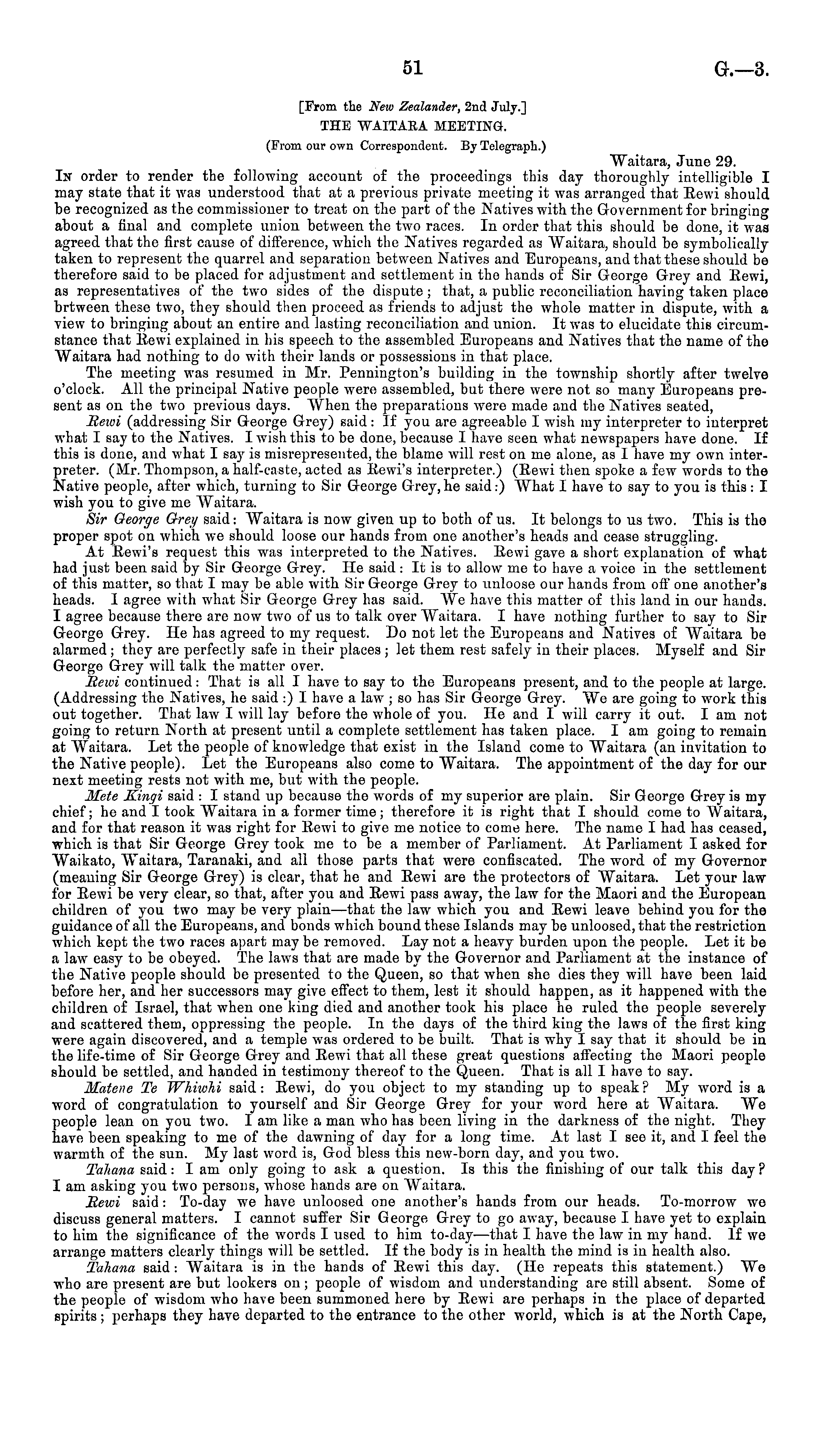 [From the Neio Zealander, 2nd Julj.] THE WAITAEA MEETING. (From our own Correspondent. By Telegraph.) Waitara, June 29. In order to render the following account of the proceedings this day thoroughly intelligible I may state that it was understood that at a previous private meeting it was arranged that Eewi should be recognized as the commissioner to treat on the part of the Natives with the Government for bringing about a final and complete union between the two races. In order that this should be done, it was agreed that the first cause of difference, which the Natives regarded as Waitara, should be symbolically taken to represent the quarrel and separation between Natives and Europeans, and that these should be therefore said to be placed for adjustment and settlement in the hands of Sir George Grey and Eewi, as representatives of the two sides of the dispute ; that, a public reconciliation having taken place brtween these two, they should then proceed as friends to adjust the whole matter in dispute, with a view to bringing about an entire and lasting reconciliation and union. It was to elucidate this circumstance that Eewi explained in his speech to the assembled Europeans and Natives that the name of the Waitara had nothing to do with their lands or possessions in that place. The meeting was resumed in Mr. Pennington's building in the township shortly after twelve o'clock. All the principal Native people were assembled, but there were not so many Europeans present as on the two previous days. When the preparations were made and the Natives seated, Hewi (addressing Sir George Grey) said : If you are agreeable I wish my interpreter to interpret what I say to the Natives. I wish this to be done, because I have seen what newspapers have done. If this is done, and what I say is misrepresented, the blame will rest on me alone, as I have my own interpreter. (Mr. Thompson, a half-caste, acted as Eewi's interpreter.) (Eewi then spoke a few words to the Native people, after which, turning to Sir George Grey, he said:) What I have to say to you is this : I wish you to give me Waitara. Sir George Grey said: Waitara is now given up to both of us. It belongs to us two. This is the proper spot on which we should loose our hands from one another's heads and cease struggling. At Eewi's request this was interpreted to the Natives. Eewi gave a short explanation of what had just been said by Sir George Grey. He said : It is to allow me to have a voice in the settlement of this matter, so that I may be able with Sir George Grey to unloose our hands from off one another's heads. I agree with what Sir George Grey has said. We have this matter of this land in our hands. I agree because there are now two of us to talk over Waitara. I have nothing further to say to Sir George Grey. He has agreed to my request. Do not let the Europeans and Natives of Waitara be alarmed; they are perfectly safe in their places ; let them rest safely in their places. Myself and Sir George Grey will talk the matter over. Sewi continued: That is all I have to say to the Europeans present, and to the people at large. (Addressing the Natives, he said :) I have a law ;so has Sir George Grey. We are going to work this out together. That law I will lay before the whole of you. He and I will carry it out. lam not going to return North at present until a complete settlement has taken place. I am going to remain at Waitara. Let the people of knowledge that exist in the Island come to Waitara (an invitation to the Native people). Let the Europeans also come to Waitara. The appointment of the day for our next meeting rests not with me, but with the people. Mete Kinqi said : I stand up because the words of my superior are plain. Sir George Grey is my chief; he and I took Waitara in a former time; therefore it is right that I should come to Waitara, and for that reason it was right for Eewi to give me notice to come here. The name I had has ceased, which is that Sir George Grey took me to be a member of Parliament. At Parliament I asked for Waikato, Waitara, Taranaki, and all those parts that were confiscated. The word of my Governor (meaning Sir George Grey) is clear, that he and Eewi are the protectors of Waitara. Let your law for Eewi be very clear, so that, after you and Eewi pass away, the law for the Maori and the European children of you two may be very plain —that the law which you and Eewi leave behind you for the guidance of all the Europeans, and bonds which bound these Islands may be unloosed, that the restriction which kept the two races apart may be removed. Lay not a heavy burden upon the people. Let it be a law easy to be obeyed. The laws that are made by the Governor and Parliament at the instance of the Native people should be presented to the Queen, so that when she dies they will have been laid before her, and her successors may give effect to them, lest it should happen, as it happened with the children of Israel, that when one king died and another took his place he ruled the people severely aud scattered them, oppressing the people. In the days of the third king the laws of the first king were again discovered, and a temple was ordered to be built. That is why I say that it should be in the life-time of Sir George Grey and Eewi that all these great questions affecting the Maori people should be settled, and handed in testimony thereof to the Queen. That is all I have to say. Matene Te Whiwhi said : Eewi, do you object to my standing up to speak ? My word is a word of congratulation to yourself and Sir George Grey for your word here at Waitara. We people lean on you two. lam like a man who has been living in the darkness of the night. They nave been speaking to me of the dawning of day for a long time. At last I see it, and I feel the warmth of the sun. My last word is, God bless this new-born day, and you two. Taliana said: lam only going to ask a question. Is this the finishing of our talk this day ? I am asking yo