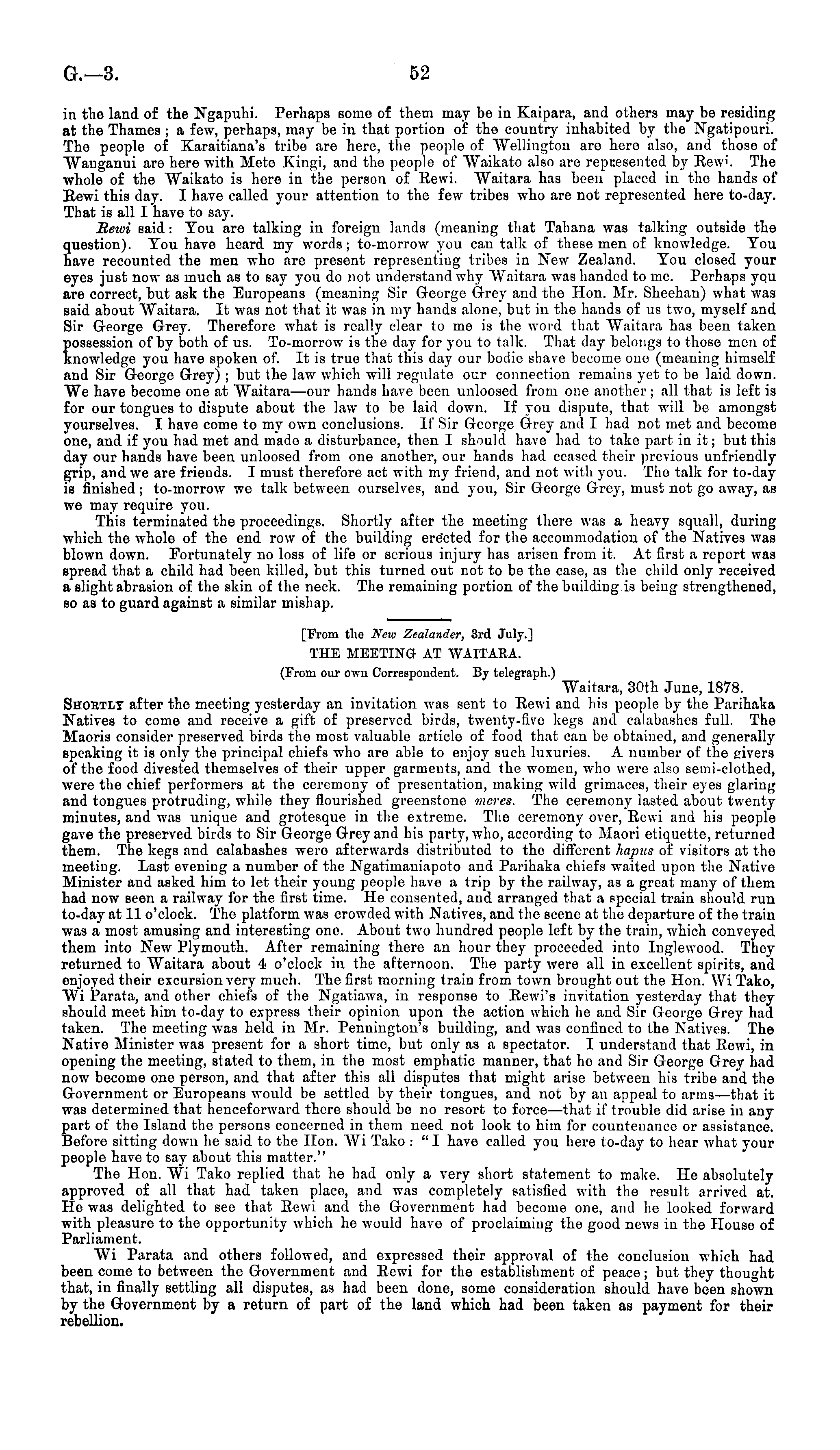 in the land of the Ngapuhi. Perhaps some of them may be in Kaipara, and others may be residing at the Thames ; a few, perhaps, may be in that portion of the country inhabited by the Ngatipouri. The people of Karaitiana's tribe are here, the people of Wellington are here also, and those of "Wanganui are here with Mete Kingi, and the people of "VVaikato also are represented by Eew'. The whole of the Waikato is here in the person of Eowi. Waitara has been placed in the hands of Rewi this day. I hare called your attention to the few tribes who are not represented here to-day. That is all I have to say. Rewi said : You are talking in foreign lands (meaning that Tahana was talking outside the question). You have heard my words; to-morrow you can talk of these men of knowledge. You have recounted the men who are present representing tribes in New Zealand. You closed your eyes just now as much as to say you do not understand why Waitara was handed to me. Perhaps you are correct, but ask the Europeans (meaning Sir George Grey and the Hon. Mr. Sheehan) what was said about Waitara. It was not that it was in my hands alone, but in the hands of us two, myself and Sir George Grey. Therefore what is really clear to me is the word that Waitara has been taken possession of by both of us. To-morrow is the day for you to talk. That day belongs to those men of knowledge you have spoken of. It is true that this day our bodie shave become one (meaning himself and Sir George Grey) ; but the law which will regulate our connection remains yet to be laid down. We have become one at Waitara —our hands have been unloosed from one another; all that is left is for our tongues to dispute about the law to be laid down. If you dispute, that will be amongst yourselves. I have come to my own conclusions. It' Sir George Grey and I had not met and become one, and if you had met and made a disturbance, then I should have had to take part in it; but this day our hands have been unloosed from one another, our hands had ceased their previous unfriendly grip, and we are friends. I must therefore act with my friend, and not with you. The talk for to-day is finished; to-morrow we talk between ourselves, and you, Sir George Grey, must not go away, as we may require you. This terminated the proceedings. Shortly after the meeting there was a heavy squall, during which the whole of the end row of the building erected for the accommodation of the Natives was blown down. Fortunately no loss of life or serious injury has arisen from it. At first a report was spread that a child had been killed, but this turned out not to be the case, as the child only received a slight abrasion of the skin of the neck. The remaining portion of the building is being strengthened, so as to guard against a similar mishap. [Prom the New Zealander, 3rd July.] THE MEETING- AT WAITARA. (From our own Correspondent. By telegraph.) Waitara, 30th June, 1878. Shoetly after the meeting yesterday an invitation was sent to Eewi and his people by the Parihaka Natives to come and receive a gift of preserved birds, twenty-five kegs and calabashes full. The Maoris consider preserved birds the most valuable article of food that can be obtained, and generally speaking it is only the principal chiefs who are able to enjoy such luxuries. A number of the givers of the food divested themselves of their upper garments, and the women, who were also semi-clothed, were the chief performers at the ceremony of presentation, making wild grimaces, their eyes glaring and tongues protruding, while they flourished greenstone meres. The ceremony lasted about twenty minutes, and was unique and grotesque in the extreme. The ceremony over, Rcwi and his people gave the preserved birds to Sir George Grey and his party, who, according to Maori etiquette, returned them. The kegs and calabashes were afterwards distributed to the different hapus of visitors at the meeting. Last evening a number of the Ngatimaniapoto and Parihaka chiefs wraited upon the Native Minister and asked him to let their young people have a trip by the railway, as a great many of them had now seen a railway for the first time. He consented, and arranged that a special train should run to-day at 11 o'clock. The platform was crowded with Natives, and the scene at the departure of the train was a most amusing and interesting one. About two hundred people left by the train, which conveyed them into New Plymouth. After remaining there an hour they proceeded into Inglewood. They returned to Waitara about 4 o'clock in the afternoon. The party were all in excellent spirits, and enjoyed their excursion very much. The first morning train from town brought out the Hon. Wi Tako, Wi Parata, and other chiefs of the Ngatiawa, in response to Eewi's invitation yesterday that they should meet him to-day to express their opinion upon the action which he and Sir George Grey had. taken. The meeting was held in Mr. Pennington's building, and was confined to the Natives. The Native Minister was present for a short time, but only as a spectator. I understand that Eewi, in opening the meeting, stated to them, in the most emphatic manner, that he and Sir George Grey had now become one person, and that after this all disputes that might arise between his tribe and the Government or Europeans would be settled by their tongues, and not by an appeal to arms—that it was determined that henceforward there should be no resort to foree —that if trouble did arise in any part of the Island the persons concerned in them need not look to him for countenance or assistance. Before sitting down he said to the Hon. Wi Tako : " I have called you here to-day to hear what your people have to say about this matter." The Hon. Wi Tako replied that he had only a very short statement to make. He absolutely approved of all that had taken place, and was completely satisfied with the result arrived at. Ho was delighted to see that Eewi and the Government had become one, a