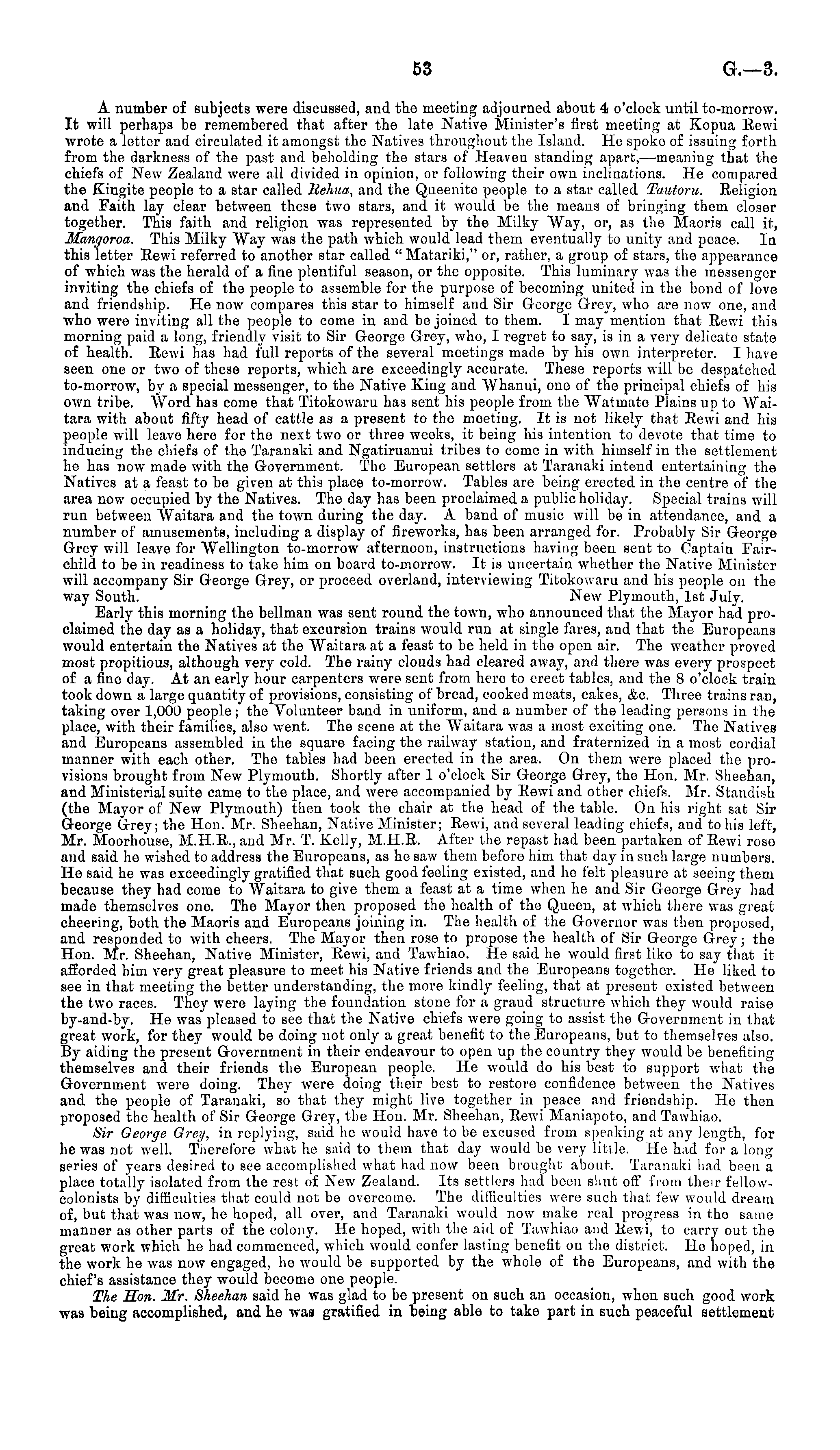 A number of subjects were discussed, and the meeting adjourned about 4 o'clock until to-morrow. It will perhaps be remembered that after the late Native Minister's first meeting at Kopua Eewi wrote a letter and circulated it amongst the Natives throughout the Island. He spoke of issuing forth from the darkness of the past and beholding the stars of Heaven standing apart, —meaning that the chiefs of New Zealand were all divided in opinion, or following their own inclinations. He compared the Kingite people to a star called Rehua, and the Queenite people to a star called Tautoru. Religion and Faith lay clear between these two stars, and it Avould be the means of bringing them closer together. This faith and religion was represented by the Milky Way, or, as the Maoris call it, Mangoroa. This Milky Way was the path Avhich would lead them eventually to unity and peace. In this letter Eewi referred to another star called " Matariki," or, rather, a group of stars, the appearance of which was the herald of a fine plentiful season, or the opposite. This luminary Avas the messenger inviting the chiefs of the people to assemble for the purpose of becoming united in the bond of love and friendship. He now compares this star to himself and Sir George Grey, who are now one, and who were inviting all the people to come in and be joined to them. I may mention that Eewi this morning paid a long, friendly visit to Sir George Grey, who, I regret to say, is in a very delicate state of health. Eewi has had full reports of the several meetings made by his OAvn interpreter. I have seen one or two of these reports, Avhich are exceedingly accurate. These reports will be despatched to-morrow, by a special messenger, to the Native King and AVhanui, one of tho principal chiefs of his OAvn tribe. AVord has come that Titokowaru has sent his people from the Watmate Plains up to AVaitara with about fifty head of cattle as a present to the meeting. It is not likely that Eewi and his people will leave here for the next two or three weeks, it being his intention to devote that time to inducing the chiefs of the Taranaki and Ngatiruanui tribes to come in with himself in the settlement he has iioav made with the Government. The European settlers at Taranaki intend entertaining the Natives at a feast to be given at this place to-morrow. Tables are being erected in the centre of the area now occupied by the Natives. The day has been proclaimed a public holiday. Special trains will run between AVaitara and the toAvn during the day. A band of music will be in attendance, and a number of amusements, including a display of fireAvorks, has been arranged for. Probably Sir George Grey will leave for Wellington to-morrow afternoon, instructions having been sent to Captain Fairchild to be in readiness to take him on board to-morrow. It is uncertain Avhether the Native Minister will accompany Sir George Grey, or proceed overland, interviewing Titokowaru and his people on the way South. New Plymouth, Ist July. Early this morning the bellman was sent round the town, who announced that the Mayor had proclaimed the day as a holiday, that excursion trains would run at single fares, and that the Europeans would entertain the Natives at the Waitara at a feast to be held in the open air. The weather proved most propitious, although very cold. The rainy clouds had cleared away, and there was every prospect of a fine day. At an early hour carpenters were sent from here to erect tables, and the 8 o'clock train took down a large quantity of provisions, consisting of bread, cooked meats, cakes, &c. Three trains ran, taking over 1,000 people; the Volunteer band in uniform, aud a number of the leading persons in the place, with their families, also Avent. The scene at the AVaitara was a most exciting one. The Natives and Europeans assembled in the square facing the railway station, and fraternized in a most cordial manner with each other. The tables had been erected in the area. On them were placed the provisions brought from New Plymouth. Shortly after 1 o'clock Sir George Grey, the Hon. Mr. Sheehan, and Ministerial suite came to the place, and Avere accompanied by Eewi and other chiefs. Mr. Standish (the Mayor of New Plymouth) then took the chair at the head of the table. On his right sat Sir George Grey; the Hon. Mr. Sheehan, Native Minister; Eewi, and several leading chiefs, and to his left, Mr. Moorhouse, M.H.E., and Mr. T. Kelly, M.H.E. After the repast had been partaken of EeAvi rose and said he wished to address the Europeans, as he saw them before him that day in such large numbers. He said he Avas exceedingly gratified that such good feeling existed, and he felt pleasure at seeing them because they had come to Waitara to give them a feast at a time when he and Sir George Grey had made themselves one. The Mayor then proposed the health of the Queen, at which there was great cheering, both the Maoris and Europeans joining in. The health of the Governor was then proposed, and responded to with cheers. The Mayor then rose to propose the health of Sir George Grey; the Hon. Mr. Sheehan, Native Minister, Eewi, and Tawhiao. He said he would first like to say that it afforded him very great pleasure to meet his Native friends and the Europeans together. He liked to see in that meeting the better understanding, the more kindly feeling, that at present existed between the two races. They were laying the foundation stono for a grand structure which they would raise by-and-by. He Avas pleased to see that the Native chiefs Avere going to assist the Government in that great work, for they Avould be doing not only a great benefit to the Europeans, but to themselves also. By aiding the present Government in their endeavour to open up the country they Avould be benefiting themselves and. their friends the European people. He Avould do his best to support what the Government Avere doing. They were doing their best to restore confidence between the Natives a