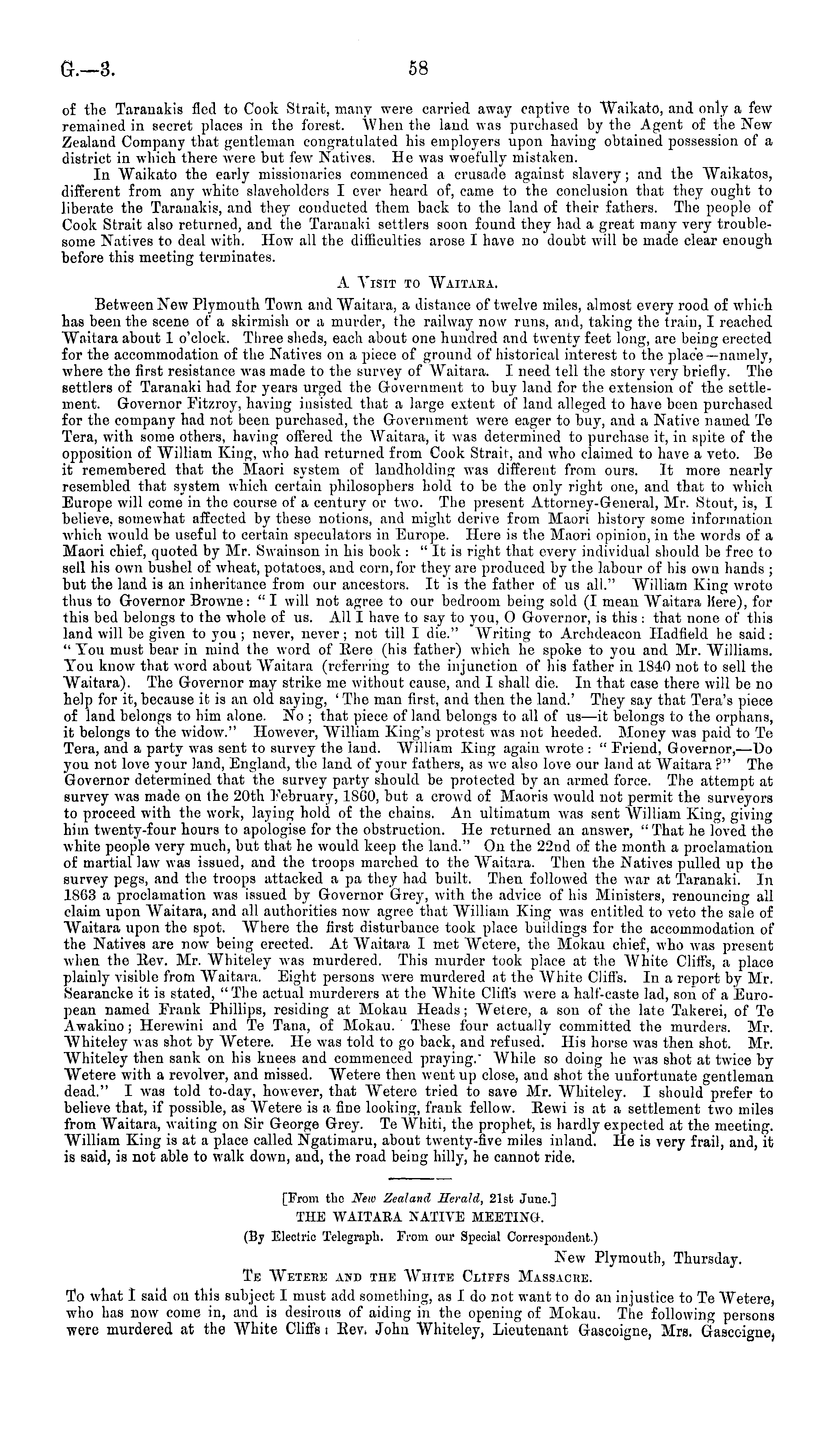 of tlie Taranakis fled to Cook Strait, many were carried away captive to Waikato, and only a few remained in secret places in the forest. When the land was purchased by the Agent of the New Zealand Company that gentleman congratulated his employers upon having obtained possession of a district in which there were but few Natives. He was woefully mistaken. In Waikato the early missionaries commenced a crusade against slavery; and the Waikatos, different from any white slaveholders I ever heard of, came to the conclusion that they ought to liberate the Tarauakis, and they conducted them back to the land of their fathers. The people of Cook Strait also returned, and the Tarauaki settlers soon found they had a great many very troublesome Natives to deal with. How all the difficulties arose I have no doubt will be made clear enough before this meeting terminates. A Visit to Waitaka. Between New Plymouth Town and Waitara, a distance of twelve miles, almost every rood of which has been the scene of a skirmish or a murder, the railway now runs, and, taking the train, I reached Waitara about 1 o'clock. Three sheds, each about one hundred and twenty feet long, are being erected for the accommodation of the Natives on a piece of ground of historical interest to the place—namely, where the first resistance was made to the survey of Waitara. I need tell the story very briefly. The settlers of Taranaki had for years urged the Government to buy land for the extension of the settlement. Governor Fitzroy, having insisted that a large extent of land alleged to have been purchased for the company had not been purchased, the Government were eager to buy, and a Native named Te Tera, with some others, having offered the Waitara, it was determined to purchase it, in spite of the opposition of William King, who had returned from Cook Strait, and who claimed to have a veto. Be it remembered that the Maori system of landholding was different from ours. It more nearly resembled that system which certain philosophers hold to be the only right one, and that to which Europe will come in the course of a century or two. The present Attorney-General, Mr. Stout, is, I believe, somewhat affected by these notions, and might derive from Maori history some information which would be useful to certain speculators in Europe. Here is the Maori opinion, in the words of a Maori chief, quoted by Mr. Swainson in his book : " It is right that every individual should be free to sell his own bushel of wheat, potatoes, and corn, for they are produced by the labour of his own hands ; but the land is an inheritance from our ancestors. It is the father of us all." William King wrote thus to Governor Browne: " I will not agree to our bedroom being sold (I mean Waitara Here), for this bed belongs to the whole of us. All I have to say to you, O Governor, is this : that none of this land will be given to you ; never, never; not till I die." Writing to Archdeacon Hadfield he said: " Tou must bear in mind the word of Here (his father) which he spoke to you and Mr. Williams. You know that word about Waitara (referring to the injunction of his father in 1840 not to sell the Waitara). The Governor may strike me without cause, and I shall die. In that case there will be no help for it, because it is an old saying, ' The man first, and then the land.' They say that Tera's piece of land belongs to him alone. No ; that piece of land belongs to all of vs —it belongs to the orphans, it belongs to the widow." However, William King's protest was not heeded. Money was paid to Te Tcra, and a party was sent to survey the land. William King again wrote : " Friend, Governor, —Do you not love your land, England, the land of your fathers, as wo also love our land at Waitara ?" The Governor determined that the survey party should be protected by an armed force. The attempt at survey was made on the 20th February, ISOO, but a crowd of Maoris would not permit the surveyors to proceed with the work, laying hold of the chains. An ultimatum was sent William King, giving him twenty-four tours to apologise for the obstruction. He returned an answer, "That he loved the white people very much, but that he would keep the land." On the 22nd of the month a proclamation of martial law was issued, and the troops marched to the Waitara. Then the Natives pulled up the survey pegs, and the troops attacked apa they had built. Then followed the war at Taranaki. In 1863 a proclamation was issued by Governor Grey, with the advice of his Ministers, renouncing all claim upon Waitara, and all authorities now agree that William King was entitled to veto the sale of Waitara upon the spot. Where the first disturbance took place buildings for the accommodation of the Natives are now being erected. At Waitara I met Wetere, the Mokau chief, who was present when the llev. Mr. Whiteley was murdered. This murder took place at the White Cliffs, a place plainly visible from Waitara. Eight persons were murdered at the White Cliffs. In a report by Mr. Searancke it is stated, "The actual murderers at the White Clift's were a half-caste lad, son of a European named Frank Phillips, residing at Mokau Heads; Wetere, a son of the late Takerei, of Te Awakino; Herewini and Te Tana, of Mokau. ' These four actually committed the murders. Mr. Whiteley was shot by Wetere. He was told to go back, and refused. His horse was then shot. Mr. Whiteley then sank on his knees and commenced praying." While so doing he was shot at twice by Wetere with a revolver, and missed. Wetere then went up close, and shot the uufortunate gentleman dead." I was told to-day, however, that Wetere tried to save Mr. Whiteley. I should prefer to believe that, if possible, as Wetere is a fine looking, frank fellow. Eewi is at a settlement two miles from Waitara, waiting on Sir George Grey. Te Whiti, the prophet, is hardly expected at the meeting. William King is at a place called Ngatimaru, about twenty-five miles inland. He is very 
