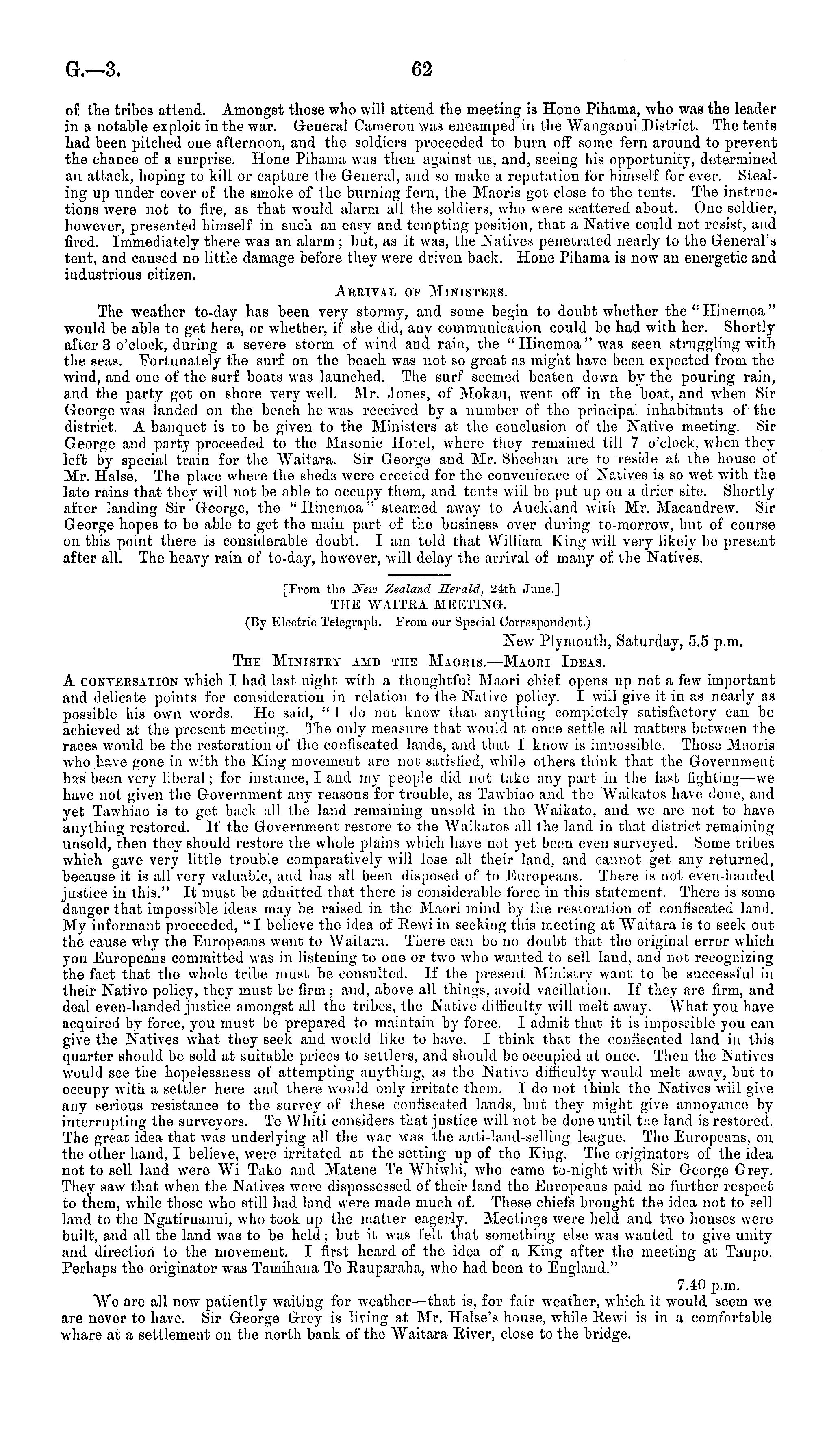 of the tribes attend. Amongst those who will attend the meeting is Hone Pihaina, who was the leader in a notable exploit in the war. General Cameron was encamped in the Wanganui District. The tents had been pitched one afternoon, and the soldiers proceeded to burn off some fern around to prevent the chance of a surprise. Hone Pihama was then against us, and, seeing his opportunity, determined an attack, hoping to kill or capture the General, and so make a reputation for himself for ever. Stealing up under cover of the smoke of the burning forn, the Maoris got close to the tents. The instructions were not to fire, as that would alarm all the soldiers, who were scattered about. One soldier, however, presented himself in such an easy and tempting position, that a Native could not resist, and fired. Immediately there was an alarm ; but, as it was, the Natives penetrated nearly to the General's tent, and caused no little damage before they were driven back. Hone Pihama is now an energetic and industrious citizen. Arrival of Ministers. The weather to-day has been very stormy, and some begin to doubt whether the "Hinemoa" would be able to get here, or whether, if she did, any communication could be had with her. Shortly after 3 o'clock, during a severe storm of wind and rain, the " Hinemoa " was seen struggling with the seas. Fortunately the surf on the beach was not so great as might have beeu expected from the wind, and one of the surf boats was launched. The surf seemed beaten down by the pouring rain, and the party got on shore very well. Mr. Jones, of Mokau, went off in the boat, and when Sir George was landed on the beach he was received by a number of the principal inhabitants of the district. A banquet is to be given to the Ministers at the conclusion of the Native meeting. Sir George and party proceeded to the Masonic Hotel, where they remained till 7 o'clock, when they left by special train for the Waitara. Sir George and Mr. Sheehan are to reside at the house of Mr. Halse. The place where the sheds were erected for the convenience of Natives is so wet with the late rains that they will not be able to occupy them, and tents will be put up on a drier site. Shortly after landing Sir George, the " Hinemoa" steamed away to Auckland with Mr. Macandrew. Sir George hopes to be able to get the main part of the business over during to-morrow, but of course on this point there is considerable doubt. lam told that William King will very likely be present after all. The heavy rain of to-day, however, will delay the arrival of many of the Natives. [From the Brno Zealand Herald, 24th June.] THE WAITRA MEETING. (By Electric Telegraph. From our Special Correspondent.) New Plymouth, Saturday, 5.5 p.m. The Ministry amd the Maoris.—Maori Ideas. A conversation which I had last night with a thoughtful Maori chief opens up not a few important and delicate points for consideration in relation to the Native policy. I will give it in as nearly as possible his own words. Pie said, "I do not know that anything completely satisfactory can be achieved at the present meeting. The only measure that would at once settle all matters between the races would be the restoration of the confiscated lands, and that 1 know is impossible. Those Maoris who bs-ve gone in with the King movement are not satisfied, while others think that the Government has' been very liberal; for instance, I and my people did not take any part in the last fighting —we have not given the Government any reasons for trouble, as Tawhiao and the Waikatos have done, and yet Tawhiao is to get back all the land remaining unsold in the Waikato, and we are not to have anything restored. If the Government restore to the Waikatos all the land in that district remaining unsold, then they should restore the whole plains which have not yet been even surveyed. Some tribes which gave very little trouble comparatively will lose all their land, and cannot get any returned, because it is all very valuable, and has all been disposed of to Europeans. There is not even-handed justice in this." It must be admitted that there is considerable force in this statement. There is some danger that impossible ideas may be raised in the Maori mind by the restoration of confiscated land. My informant proceeded, "I believe the idea of Rewiin seeking this meeting at Waitara is to seek out the cause why the Europeans went to Waitara. There can be no doubt that the original error which you Europeaus committed was in listening to one or two who wanted to sell land, and not recognizing the fact that the whole tribe must be consulted. If the present Ministry want to be successful in their Native policy, they must be firm; and, above all things, avoid vacillation. If they are firm, and deal even-handed justice amongst all the tribes, the Native difficulty will melt away. What you have acquired by force, you must be prepared to maintain by force. I admit that it is impossible you can give the Natives what they seek and would like to have. I think that the confiscated land in this quarter should be sold at suitable prices to settlers, and should be occupied at once. Then the Natives would see the hopelessness of attempting anything, as the Native difficulty would melt away, but to occupy with a settler here and there would only irritate them. Ido not think the Natives will give any serious resistance to the survey of these confiscated lands, but they might give annoyance by interrupting the surveyors. Te Whiti considers that justice will not be done until the land is restored. The great idea that was underlying all the war was the anti-land-selling league. The Europeaus, on the other hand, I believe, were irritated at the setting up of the King. The originators of the idea not to sell land were Wi Tako and Matene Te Whiwhi, who came to-night with Sir George Grey. They saw that when the Natives were dispossessed of their land the Europeans paid no further respect to them, while those w