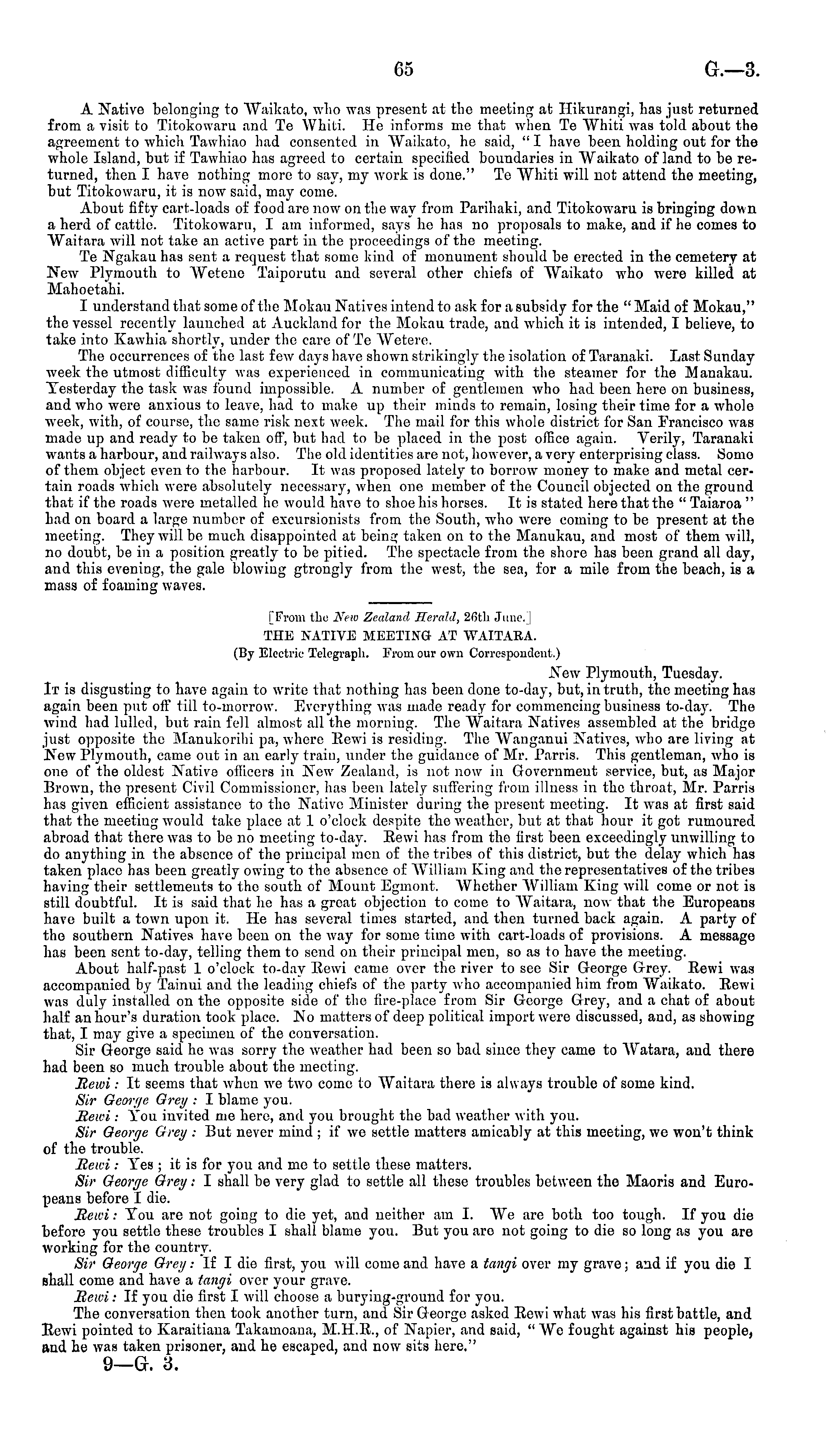 A Native belonging to "Waikato, who was present at the meeting at Hikurangi, lias just returned from a visit to Titofcowaru and To Whiti. He informs me that when To Whiti was told about the agreement to which Tawhiao had consented in Waikato, he said, " I have been holding out for tho whole Island, but if Tawhiao has agreed to certain specified boundaries in "Waikato of land to be returned, then I have nothing more to say, my work is done." To "Whiti will not attend the meeting, but Titokowaru, it is now said, may come. About fifty cart-loads of food are now on the way from Parihaki, and Titokowaru is bringing down a herd of cattle. Titokowaru, I am informed, says lie has no proposals to make, and if he comes to Waitara will not take an active part in the proceedings of the meeting. Te Ngakau has sent a request that some kind of monument should be erected in the cemetery at New Plymouth to AVetene Taiporutu and several other chiefs of Waikato who were killed at Mahoetahi. I understand that some of the Mokau Natives intend to ask for a subsidy for the " Maid of Mokau," the vessel recently launched at Auckland for the Mokau trade, and which it is intended, I believe, to take into Kawhia shortly, under the care of Te Wetere. The occurrences of the last few days have shown strikingly the isolation of Taranaki. Last Sunday week the utmost difficulty was experienced in communicating with the steamer for the Manakau. Yesterday the task was found impossible. A number of gentlemen who had been here on business, and who were anxious to leave, had to make up their minds to remain, losing their time for a whole week, with, of course, the same risk next week. The mail for this whole district for San Francisco was made up and ready to be taken off, but had to be placed in the post office again. Verily, Taranaki wants a harbour, and railways also. The old identities are not, however, a very enterprising class. Somo of them object even to the harbour. It was proposed lately to borrow money to make and metal certain roads which were absolutely necessary, when one member of the Council objected on the ground that if the roads were metalled he would have to shoe his horses. It is stated here that the " Taiaroa " had on board a large number of excursionists from the South, who were coming to be present at the meeting. They will be much disappointed at being taken on to the Manukau, and most of them will, no doubt, be in a position greatly to be pitied. The spectacle from the shore has been grand all day, and this evening, the gale blowing gtrongly from the west, the sea, for a mile from the beach, is a mass of foaming waves. [From the Nem Zealand Herald, 26th June.] THE NATIVE MEETING AT WAITABA. (By Electric Telegraph. From our own Correspondent.) New Plymouth, Tuesday. It is disgusting to have again to write that nothing has been done to-day, but, in truth, the meeting has again been put off till to-morrow. Everything was made ready for commencing business to-day. The wind had lulled, but rain fell almost all the morning. The Waitara Natives assembled at the bridge just opposite tho Manukorihi pa, where Bewi is residing. The Wanganui Natives, who are living at Isew Plymouth, came out in an early train, under the guidance of Mr. Parris. This gentleman, who is one of the oldest Native officers in New Zealand, is not now in Government service, but, as Major Brown, the present Civil Commissioner, has been lately suffering from illness in the throat, Mr. Parris has given efficient assistance to the Native Minister during the present meeting. It was at first said that the meeting would take place at 1 o'clock despite the weather, but at that hour it got rumoured abroad that there was to be no meeting to-day. Eewi has from the first been exceedingly unwilling to do anything in the absence of the principal men of the tribes of this district, but the delay which has taken place has been greatly owing to the absence of William King and the representatives of the tribes having their settlements to tho south of Mount Eginont. Whether William King will come or not is still doubtful. It is said that he has a great objection to come to Waitara, now that the Europeans have built a town upon it. He has several times started, and then turned back again. A party of tho southern Natives have been on the way for some time with cart-loads of provisions. A message has been sent to-day, telling them to send on their principal men, so as to have the meeting. About half-past 1 o'clock to-day Eewi came over the river to see Sir George Grey. Eewi was accompanied by Tainui and the leading chiefs of the party who accompanied him from Waikato. Eewi was duly installed on the opposite side of the fire-place from Sir George Grey, and a chat of about half an hour's duration took place. No matters of deep political import were discussed, and, as showing that, I may give a specimen of the conversation. Sir George said ho was sorry the weather had been so bad since they came to Watara, and there had been so much trouble about the meeting. Itewi: It seems that when we two come to Waitara there is always trouble of some kind. Sir George Grey : I blame you. Kewi : You invited me here, and you brought the bad weather with you. Sir George Grey : But never mind ; if we settle matters amicably at this meeting, we won't think of the trouble. Bewi: Yes ; it is for you and me to settle these matters. Sir George Grey: I shall be very glad to settle all these troubles between the Maoris and Europeans before I die. Rewi: You are not going to die yet, and neither am I. We are both too tough. If you die before you settle these troubles I shall blame you. But you are not going to die so long as you are working for the country. Sir George Grey: If I die first, you will come and have a tangi over my grave; and if you die I shall come and have a tangi over your grave. JRewi: If you die first I will choose a burying-ground for you. The conversation then took ano