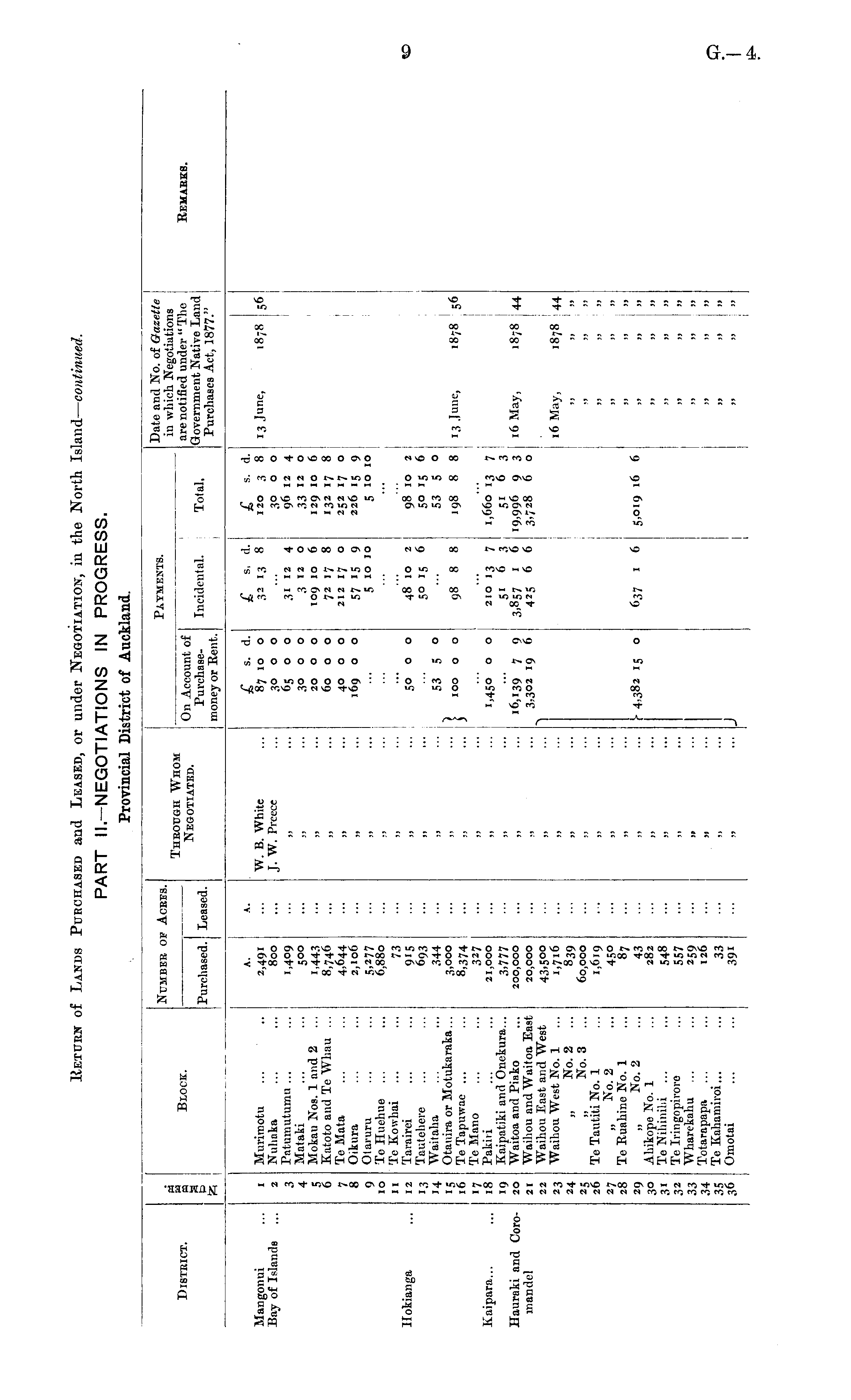 of Lands PURCHASED and Leased, or under Negotiation, in the North Island — continued. PART II.-NEGOTIATIONS IN PROGRESS. Provincial District of Auckland. District. yBlock. Number ov Ackes. I Through Whom Negotiated. Payments. On Account of Purchase- Incidental, money or Kent. Payments. ■ Total, Date and No. of Gazette | in "which Negotiations are notified under " The Government Native Land Purchases Act, 1877." Remabkb. Purchased. Leased. Maugonui Bay of Islands Nuhaka Patarnutumu ... Mataki Mokau Nos. 1 and 2 Katoto and Te Whau ... Te Mata Oikura Oiarurn Tc Hue-hue Tc Kowhai Tarairei Tautehere Wait alia Otaiiira or Jlotukaraka... Te Tapuwae ... To Mano Pakiii Kaipatiki and Onekura... Waitoa and Piako Waihou and Waitoa East Wailiou East and West Waihou West No. 1 ... No. 2 ... No. 3 ... Te Tautiti No. 1 No. 2 Tc Ruahine No. 1 „ No. 2 Abikope No. 1 TeNihinibi ... Te Iringopiroro Wharekahu Totarapapa Te Kabamiroi... Omotai A. 2,491 80O 1,409 5°° i,443 8,746 4,644 2,106 5.277 6,880 73 9'5 693 344 3,000 8,374 327 21,000 3.777 200,000 20,000 43>5°° 1,716 839 60,000 1,619 45° 87 43 282 548 557 259 126 33 39 l A. W. B. White J. W. Preece £ s. d. 87 10 o 30 o o 65 o o 30 o o 20 O O 60 o o 40 o o 169 o o X s, d. 120 3 8 13 June, 30 o o 96 12 4 I 129 10 6 132 17 8 : 252 17 o 226 15 9 5 lo I0 13 June, 1878 56 1878 56 1 2 3 4 5 6 7 8 9 10 11 ,. ;, ,» >. 31 12 4 3 12 O log io 6 72 17 8 212 17 O 57 '5 9 )) >> ,» I Hokianga 12 i) ... 50 o o 48 10 2 5° '5 98 10 2 5° 15 6 53 5 ° 198 8 8 13 June, 1878 56 13 '5 16 ,, 53 5 ° ;, Kaipara... ,, 100 o o cj8 8 8 ;, 17 20 ,» 1,45° o ° '6,139 7 9 3,302 19 6 21013 7 S 1 63 425 6 6 1,660 13 7 I 19,996 93 16 May, 3,728 6 o 1878 44 Hauraki and Coromandel 21 22 2 5 27 28 29 31 32 33 34 35 3f' 5, ,, ,, j, ■ 4,382 15 o 637 1 1 6 5,019 16 6 16 May, " r r>i n i fi (1 I878 ; 44 ,. ; » j) )> j> ' >> »i )> j) ! a ,» 5,019 10 o „ M j J> )) i) )> » 5, >S 5, >J 9$ )» » » )) I it